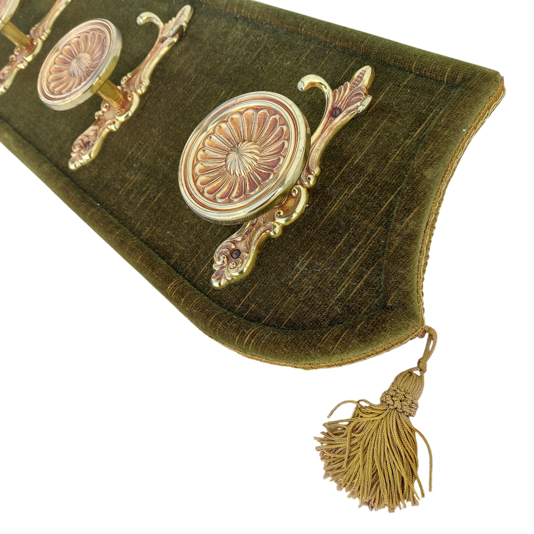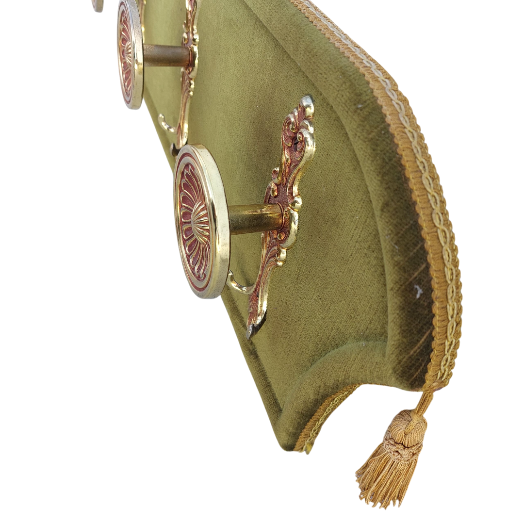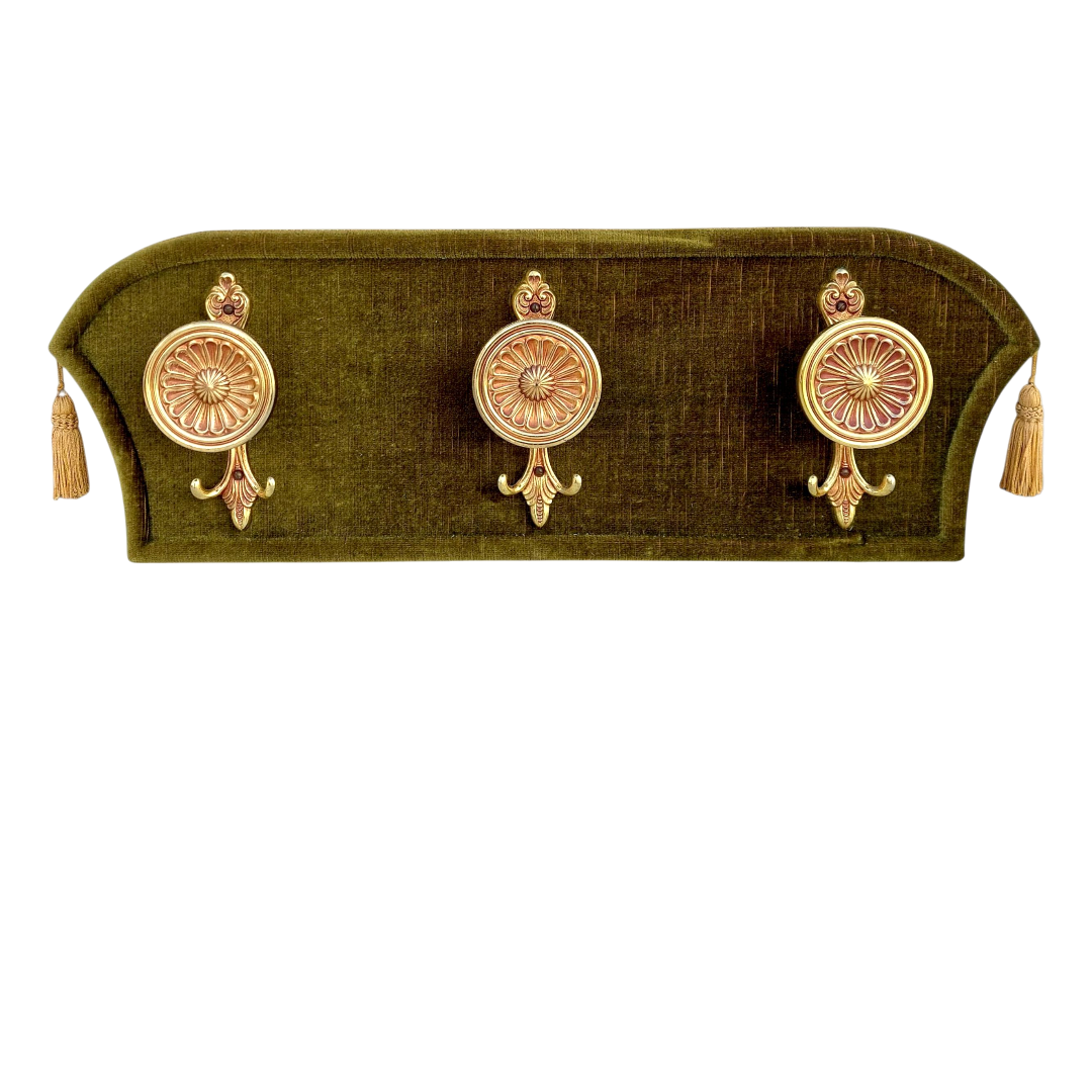 Sieninė kabykla, aptraukta alyvuoto atspalvio aksomu, su trimis dekoratyviais žalvariniais kabliukais. Detalės puošnios, rausvai auksinio tono, šonuose – audinio kutai. Subtilus akcentas prieškambariui ar miegamajam. Parvežta iš Prancūzijos.