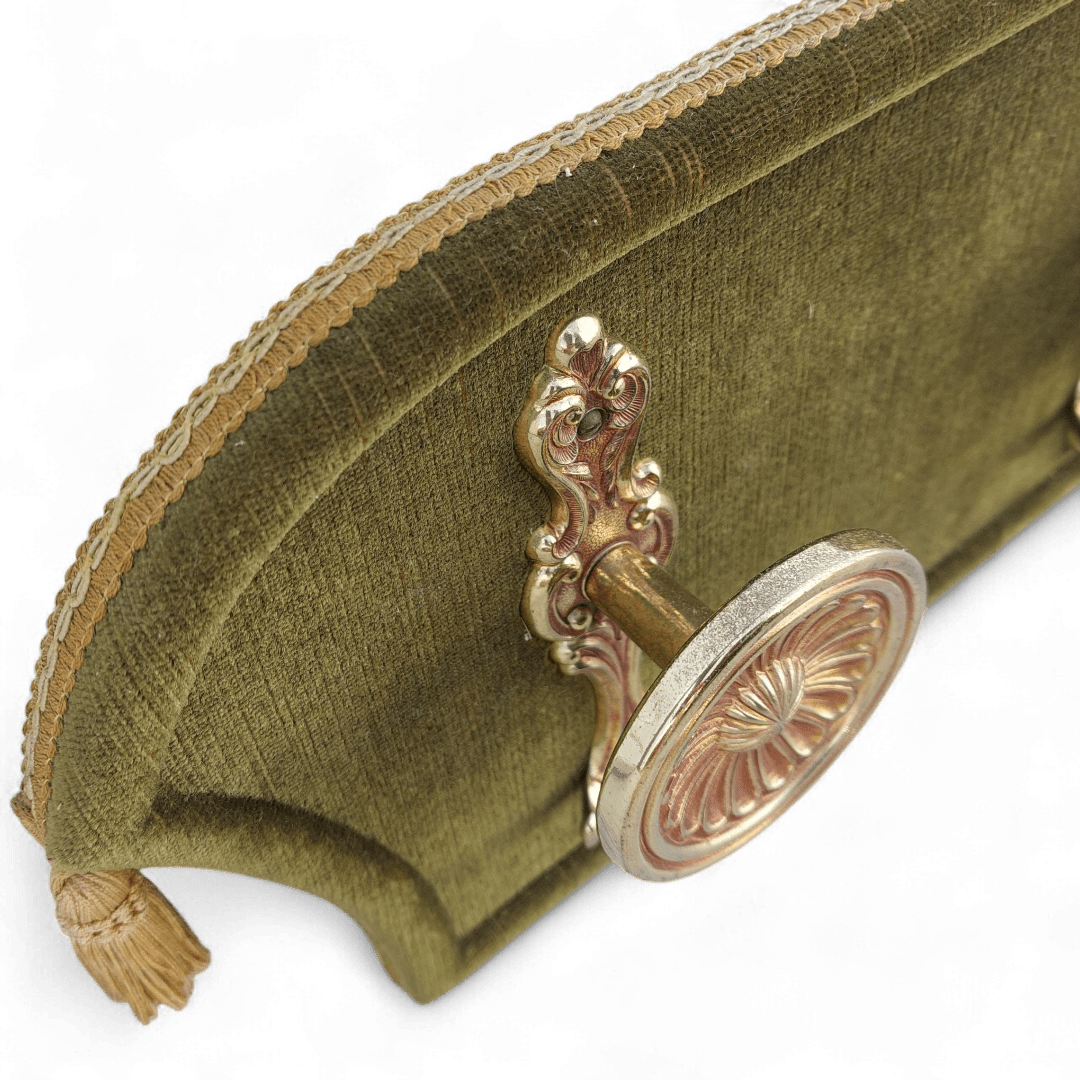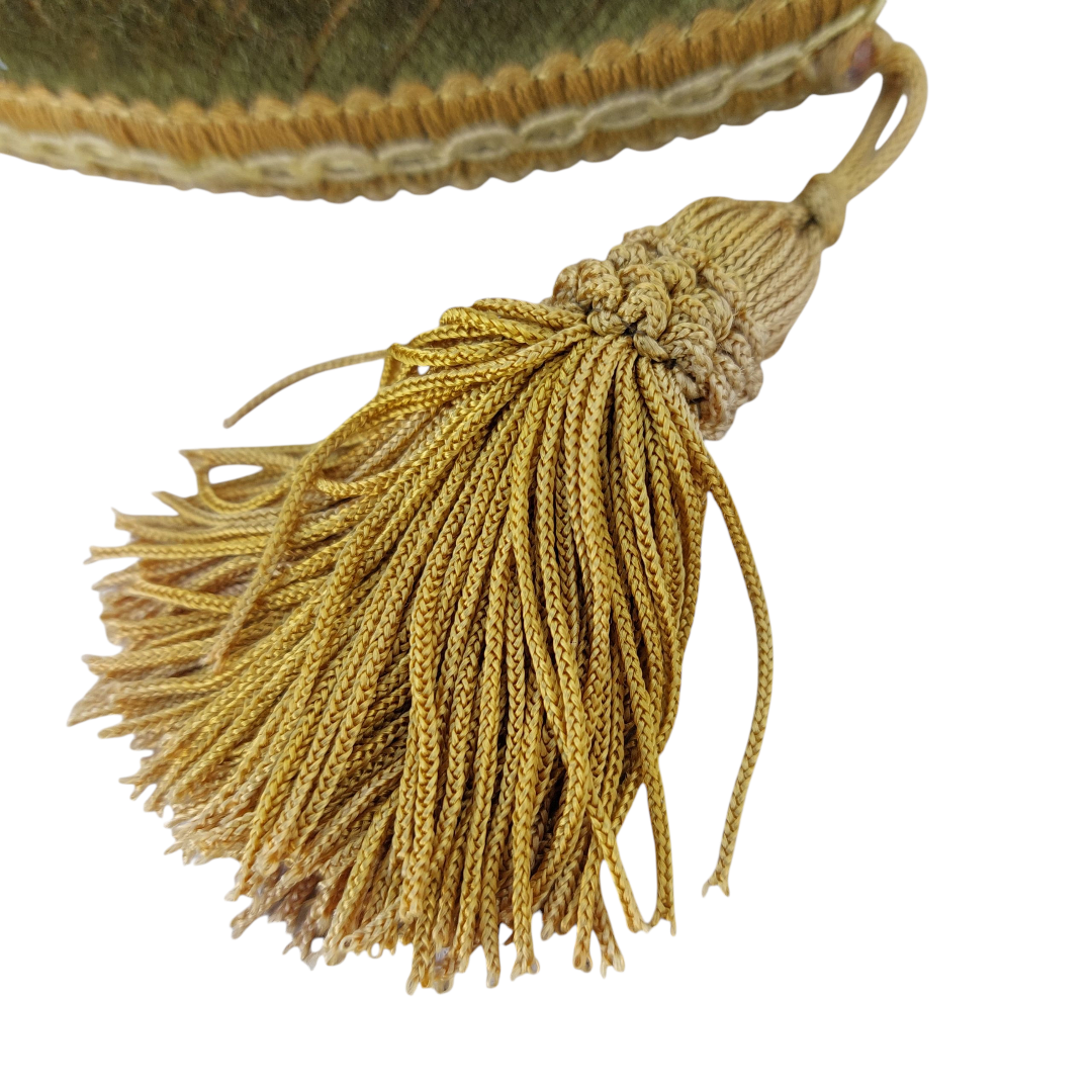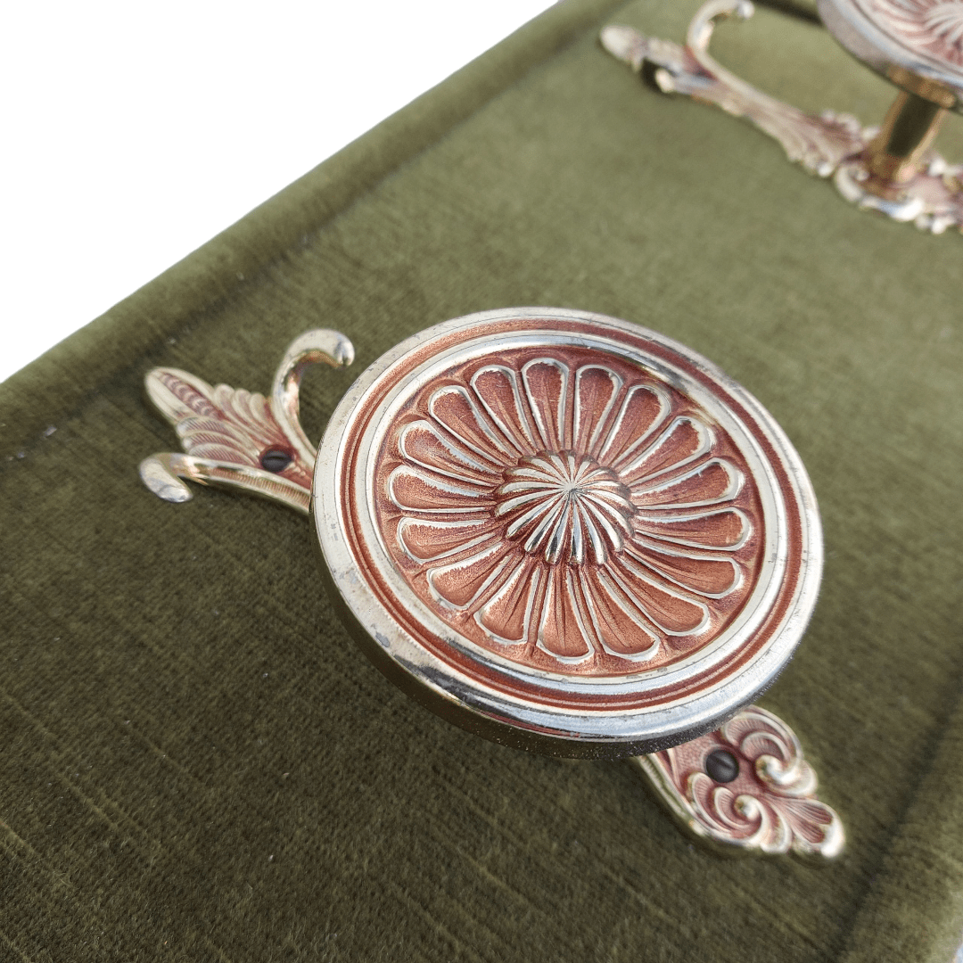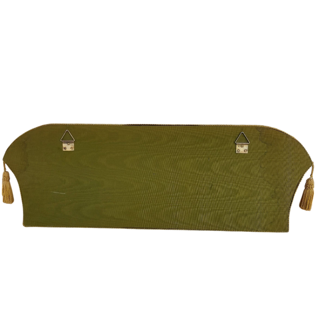 Sieninė kabykla, aptraukta alyvuoto atspalvio aksomu, su trimis dekoratyviais žalvariniais kabliukais. Detalės puošnios, rausvai auksinio tono, šonuose – audinio kutai. Subtilus akcentas prieškambariui ar miegamajam. Parvežta iš Prancūzijos.