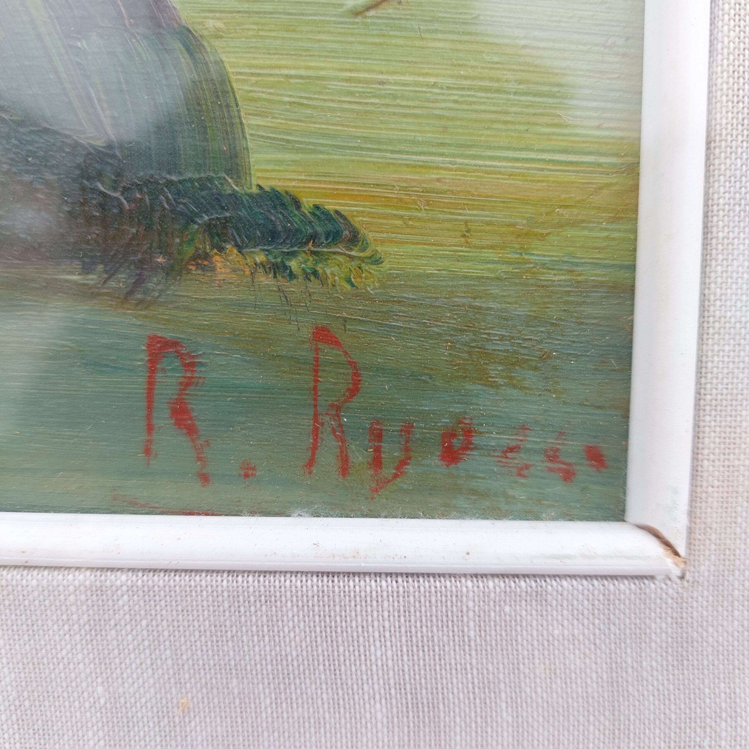 Aliejinė tapyba ant plokštės, rėminta su stiklu. Vaizduojamas ramus kraštovaizdis su medžiais, tolumoje namų siluetai po debesuotu dangumi. Spalvos sodrios, potėpiai ekspresyvūs, sukuriantys gyvą, atmosferinį įspūdį. Apatiniame dešiniajame kampe autoriaus parašas. Rėmas medinis, dengtas auksiniu tonu, su pilkos spalvos lininiu pasportu.