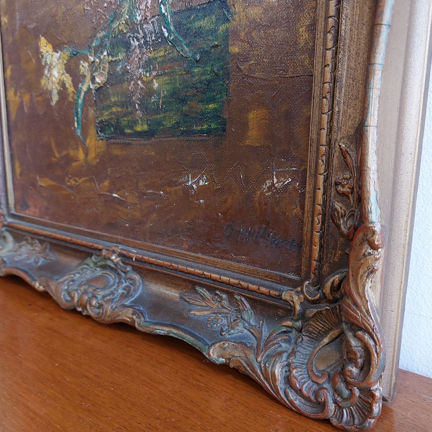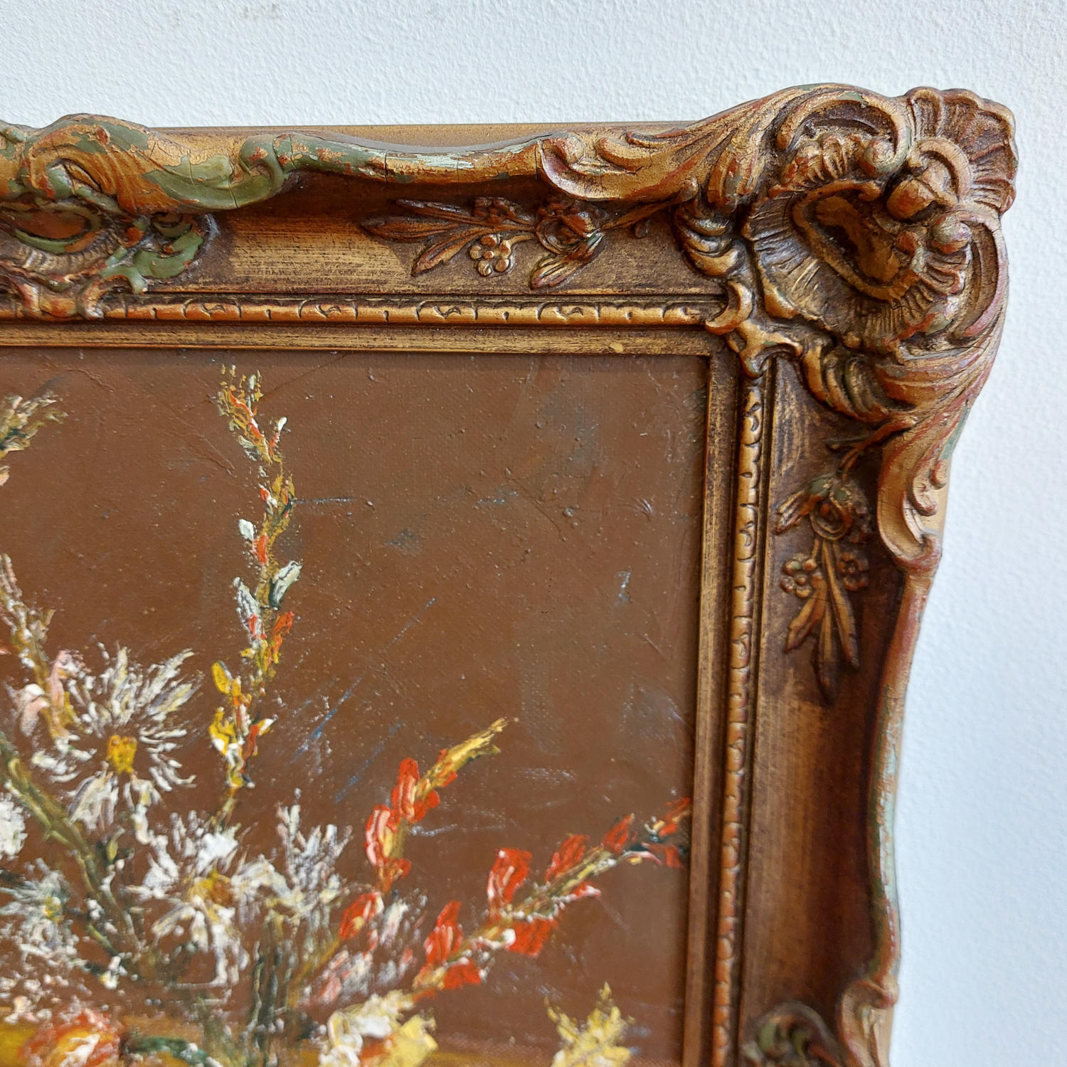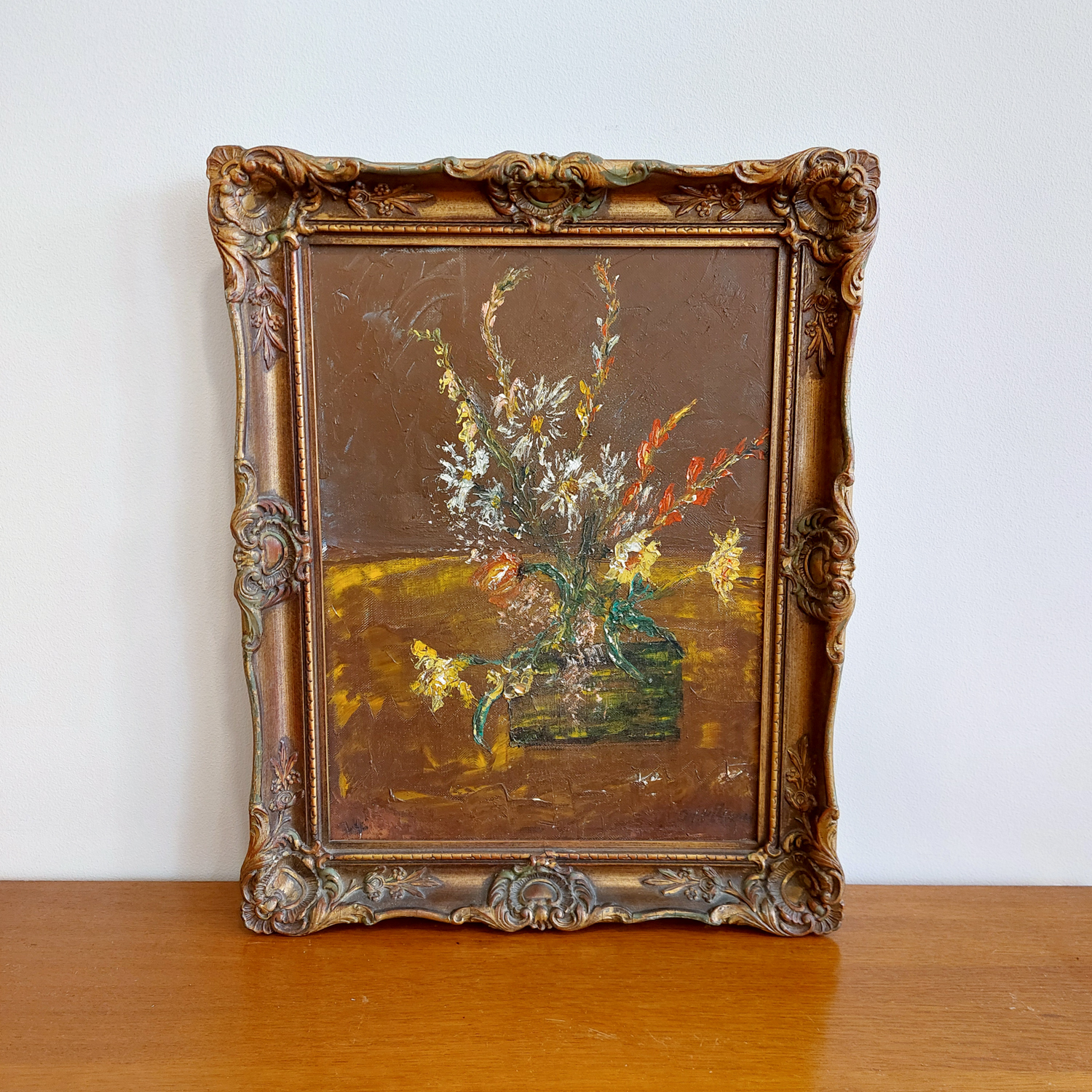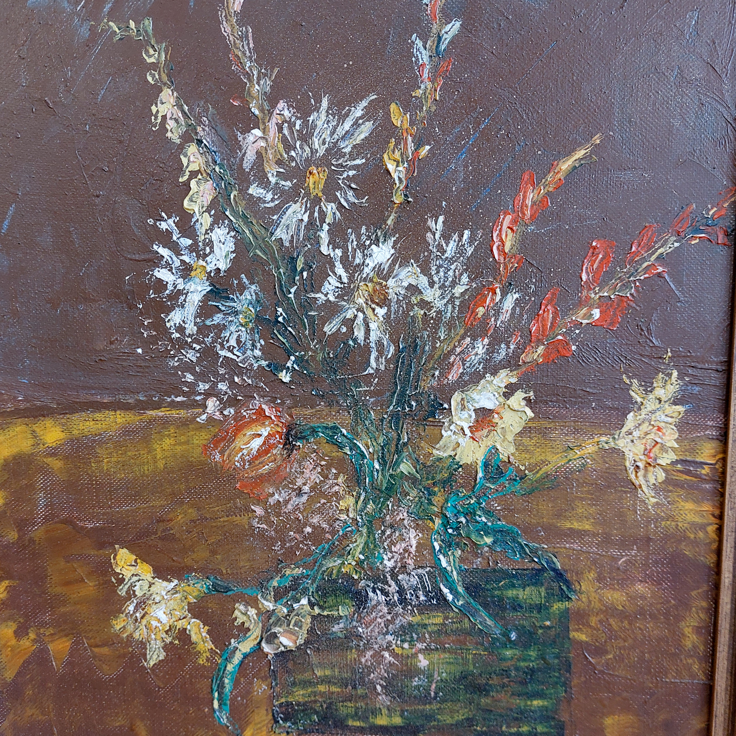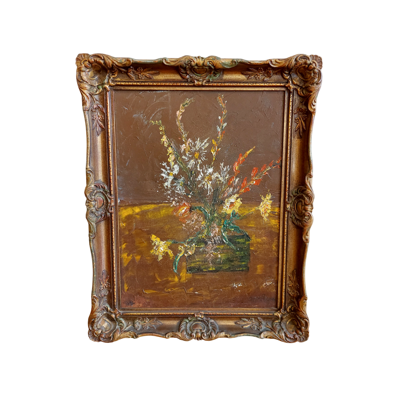 Aliejinis paveikslas su gėlių puokšte moliniame fone. Nutapytas ekspresyvia maniera, su storais potėpiais. Su autoriaus parašu. Medinis, ornamentuotas rėmas. Parvežtas iš Prancūzijos.