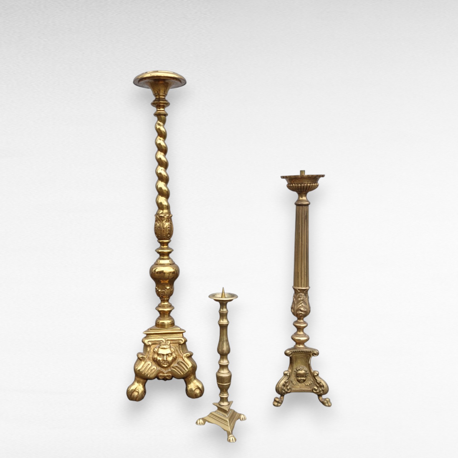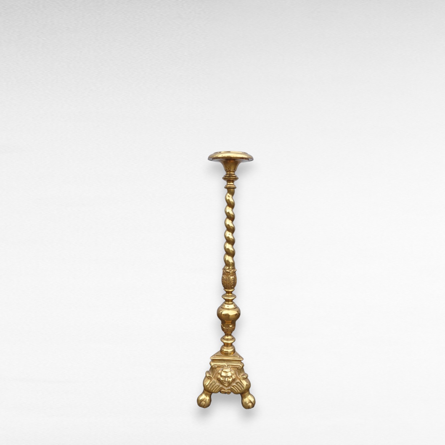 Antikvarinė žalvarinė grindų žvakidė. Kompaktiška, trikojė, su dekoruotu stulpu.