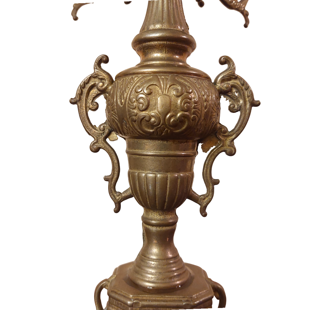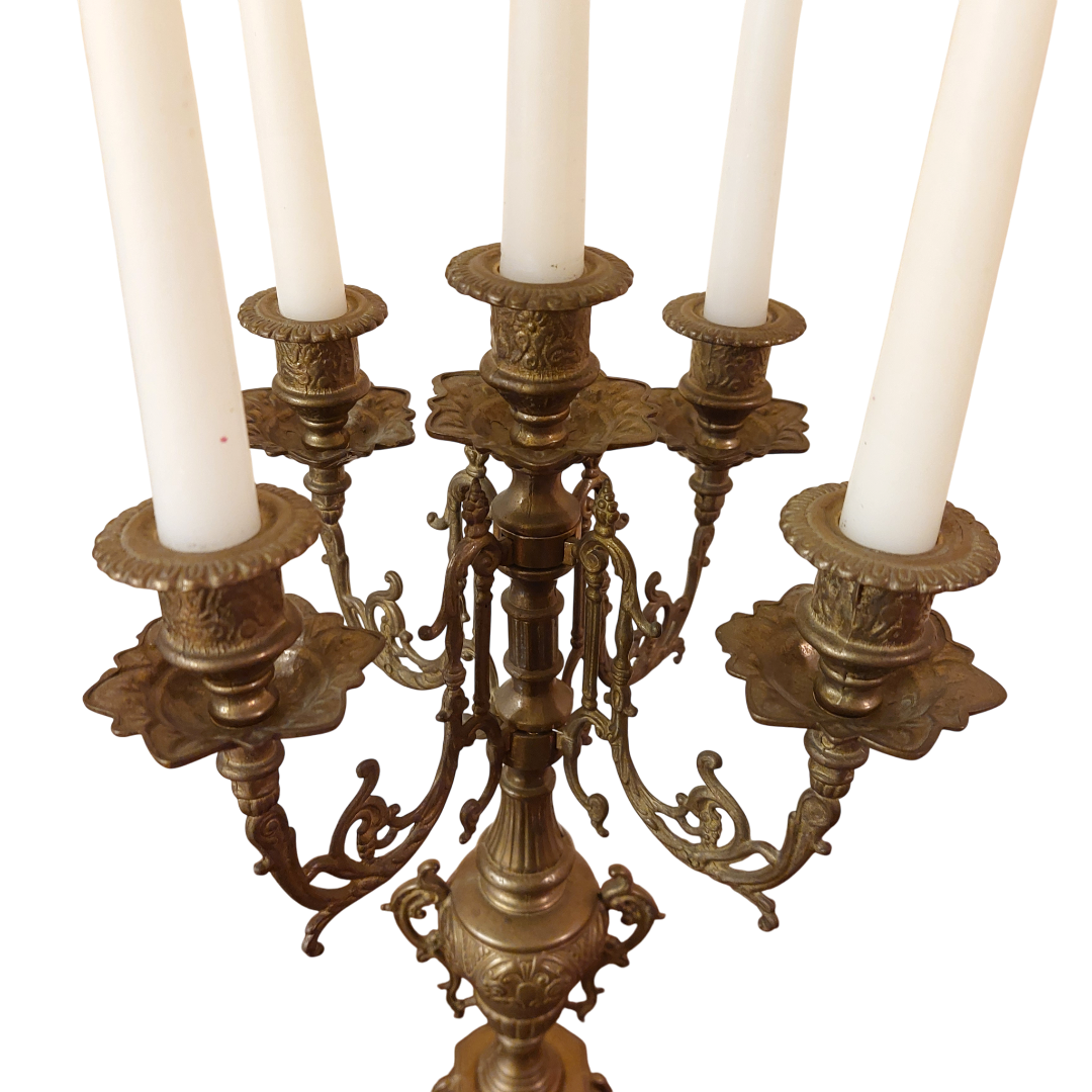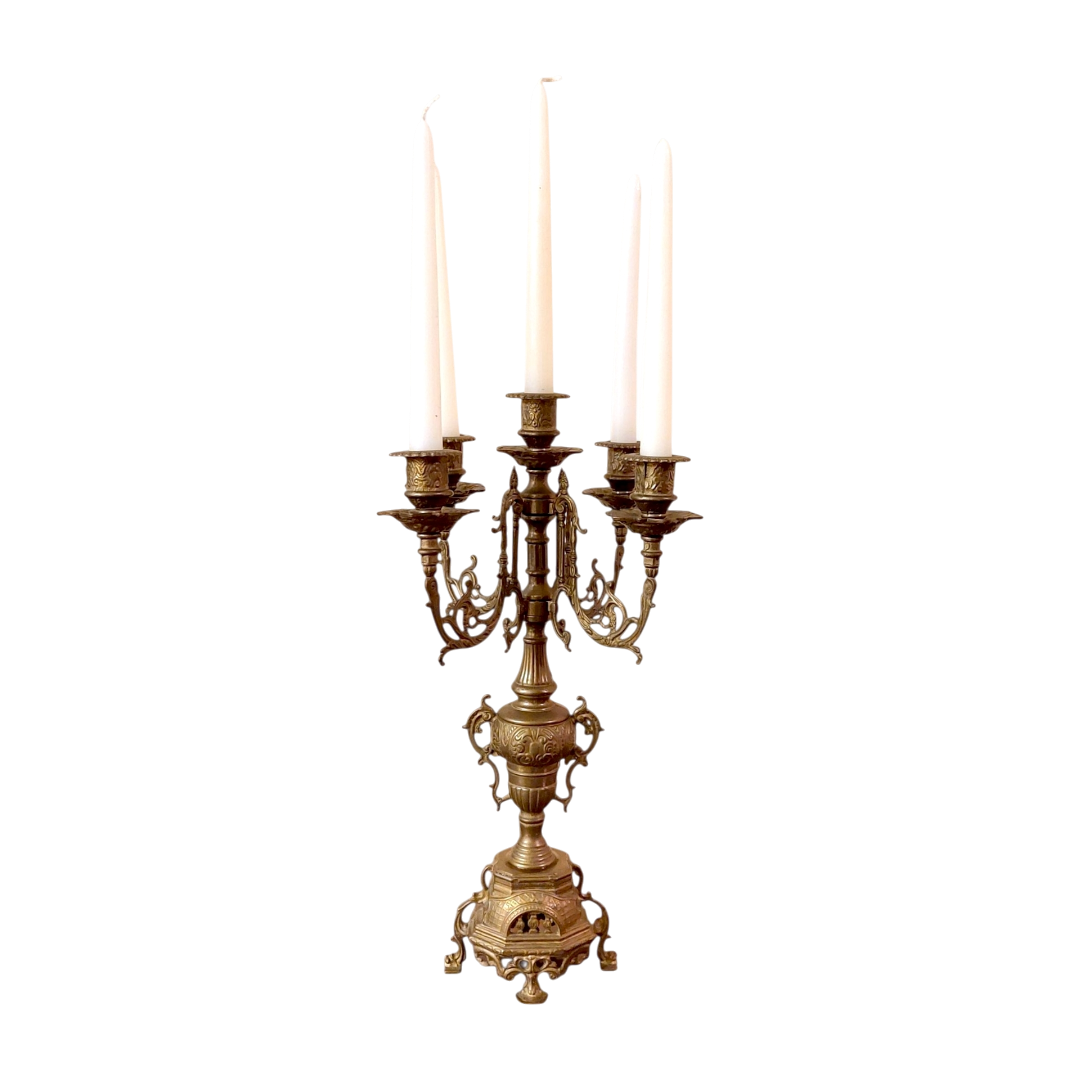 Antikvarinė žvakidė iš žalvario. Penki žvakių laikikliai, aiškūs liejimo motyvai ir masyvus pagrindas suteikia jai klasikinį vaizdą.