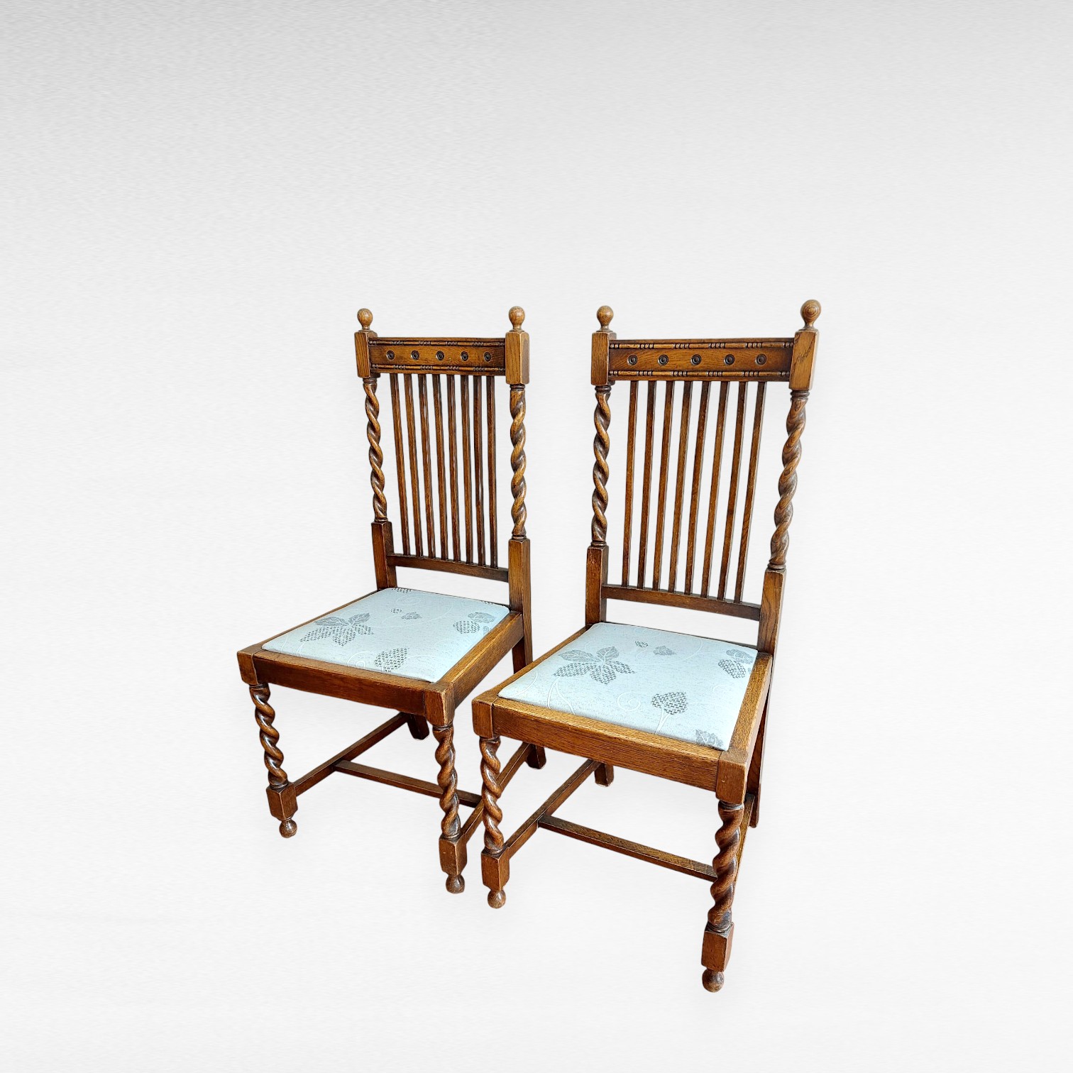 Antikvarines ąžuolinės dvi kėdės iš ąžuolo masyvo. Kojos ir atramos tekintos spiraliniu būdu – vadinamasis barley twist dekoras. Nugarėlės su vertikaliomis lentelėmis ir subtiliomis drožybos detalėmis viršuje. Sėdimosios dalys paminkštintos, pervilktos šviesiu audiniu su augaliniu raštu. Parvežtos iš Prancūzijos.