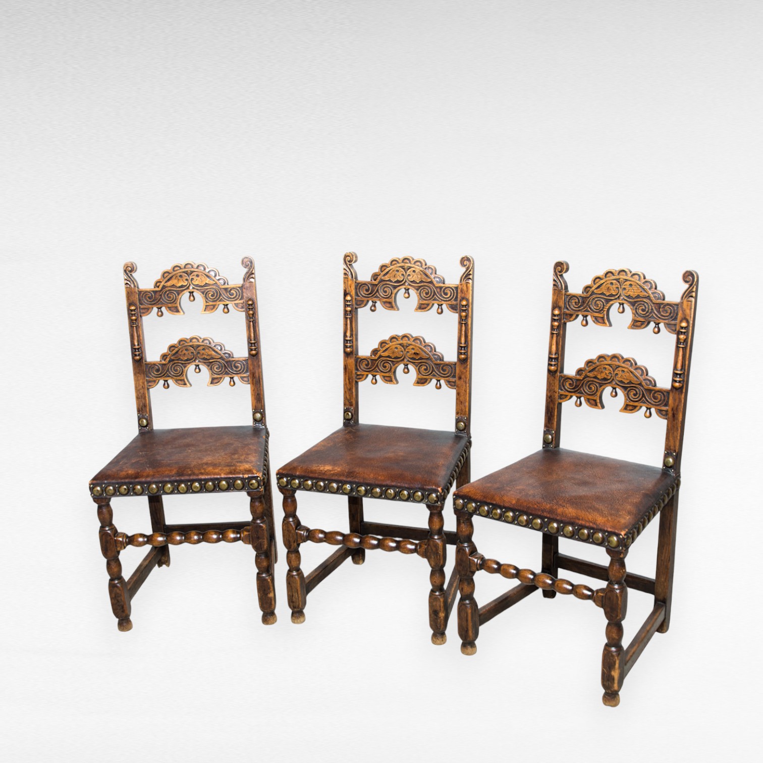 Antikvarinės ąžuolinės kėdės Karolio II stiliaus su odinėmis sėdynėmis ir dekoruotais atlošais, išlaikiusios tvirtą konstrukciją ir laiko žymes.