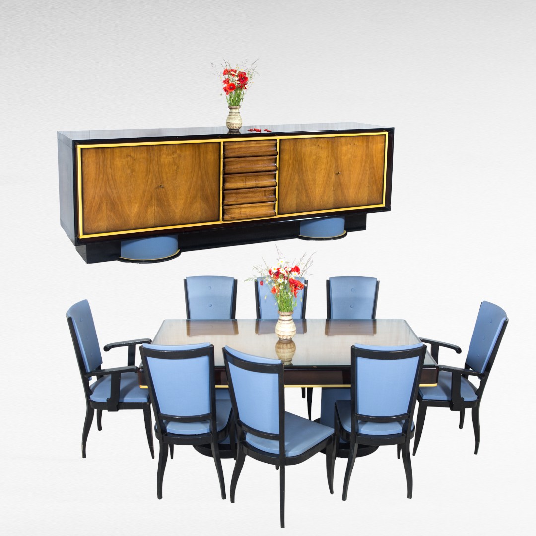 Tai yra retas ir autentiškas apie 1930 metus pagamintas Art Deco valgomojo komplektas iš „Diederich-Gales“ dirbtuvių Liuksemburge. Komplektą sudaro: valgomojo stalas su prailginimais ir 8 kėdės bei ilga komoda. Ant baldų išlikęs įspaudas patvirtinantis jų kilmę ir gamybos laikotarpį (apie 1930 m.) Baldai išsiskiria dviejų tonų apdaila: juodas lakas derinamas su šviesia, raštuota riešutmedžio fanera. Tai vienintelis žinomas tokios komplektacijos šio gamintojo rinkinys Lietuvoje. Šiandien Art Deco vėl grįžta į interjerus, todėl šis rinkinys gali tapti ne tik namų centru, bet ir ilgalaike verte. Matmenys: stalo aukštis 76 cm, 180 x 98 cm, du prailginimai po 55 cm komodos aukštis 97 cm, 282 x 62 cm