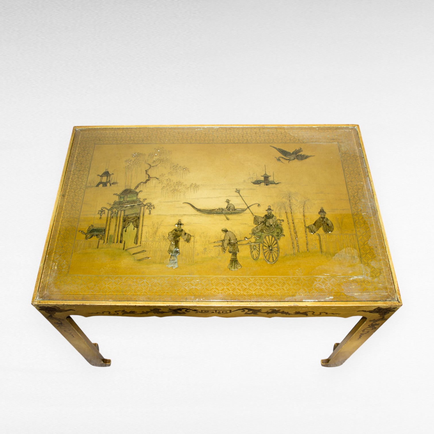 Antikvarinis chinoiserie stiliaus kavos staliukas su stiklu, dekoruotas rankų darbo orientalistiniais piešiniais. Kompozicijose atsispindi Rytų Azijos estetika: subtili architektūra, gamtos motyvai ir figūrinės scenos. Baldas parvežtas iš Prancūzijos, tikėtina, pagamintas XX a. pirmoje pusėje (1920–1940 m.). Piešinių detalumas ir lakavimo technika būdingi šiam laikotarpiui.