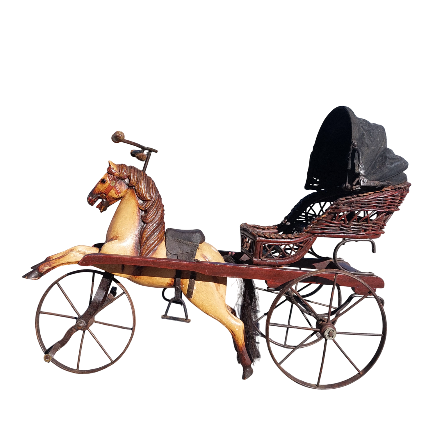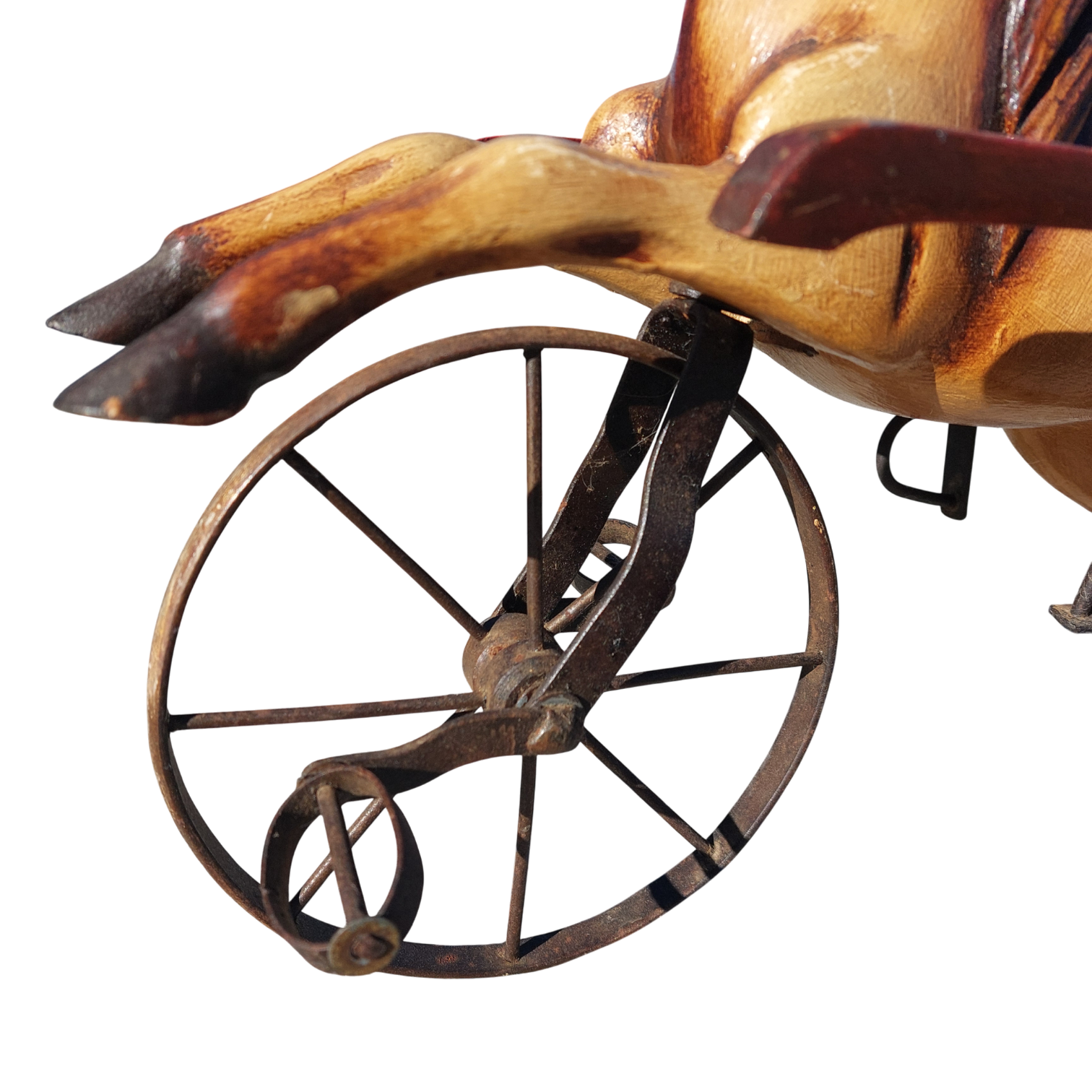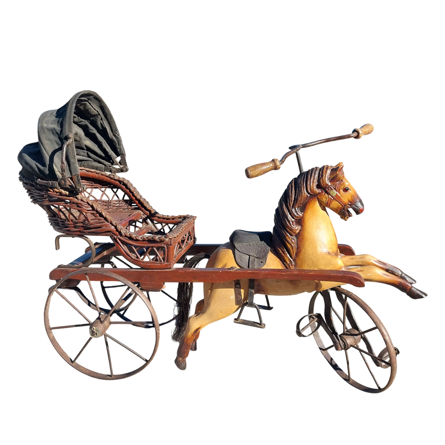 Medinis arkliukas su pinta karieta ir metaliniais ratais, priekinis ratas sukiojasi. Tai autentiška dekoratyvinė interjero detalė, kuri primena senųjų laikų vežimus ir gali tapti išraiškingu akcentu namuose ar kolekcijoje. Parvežtas iš Prancūzijos