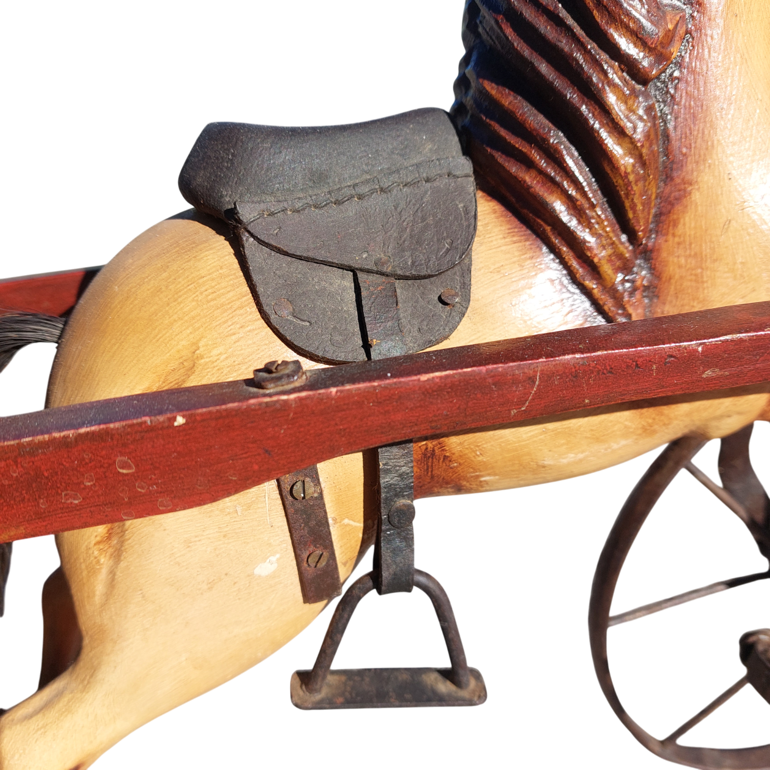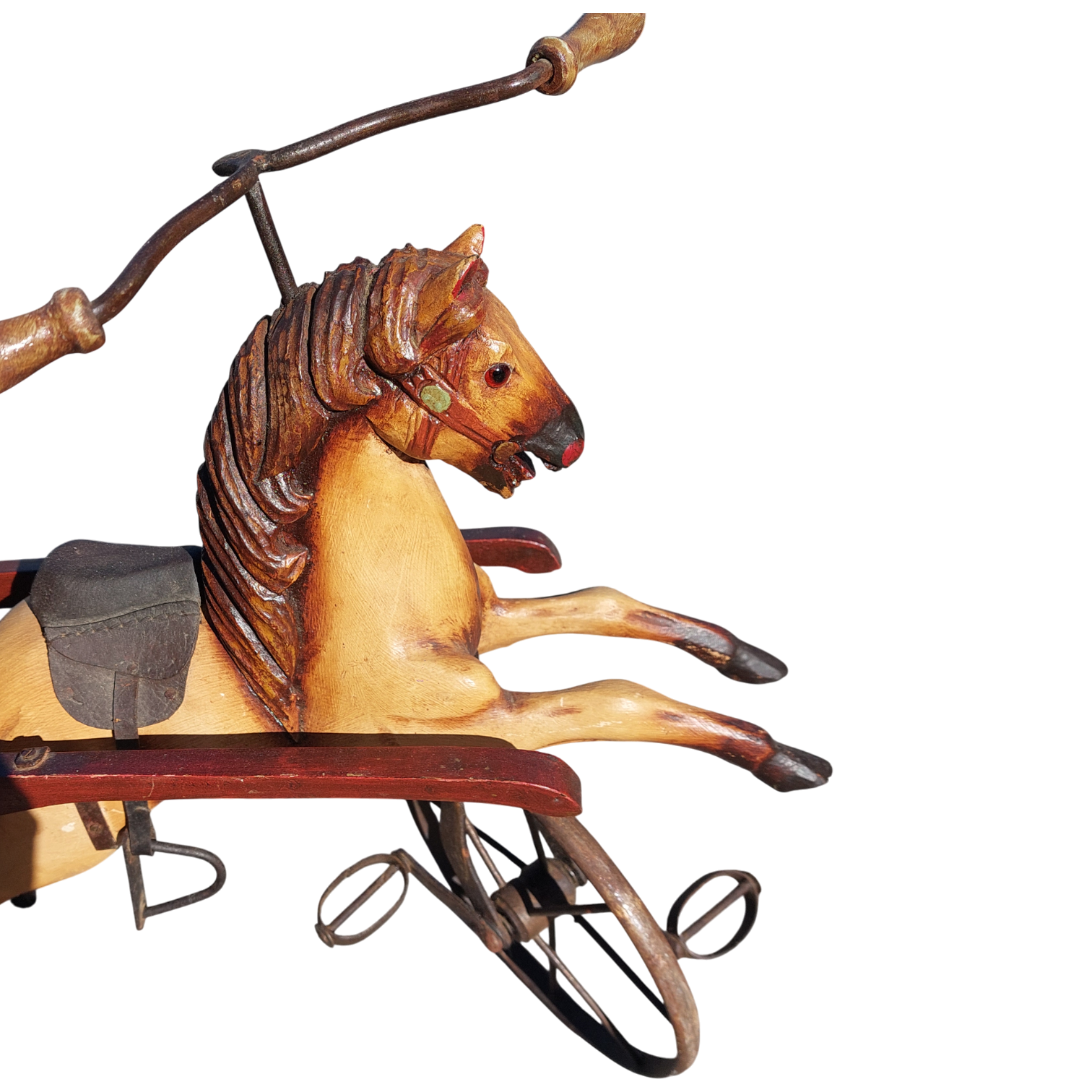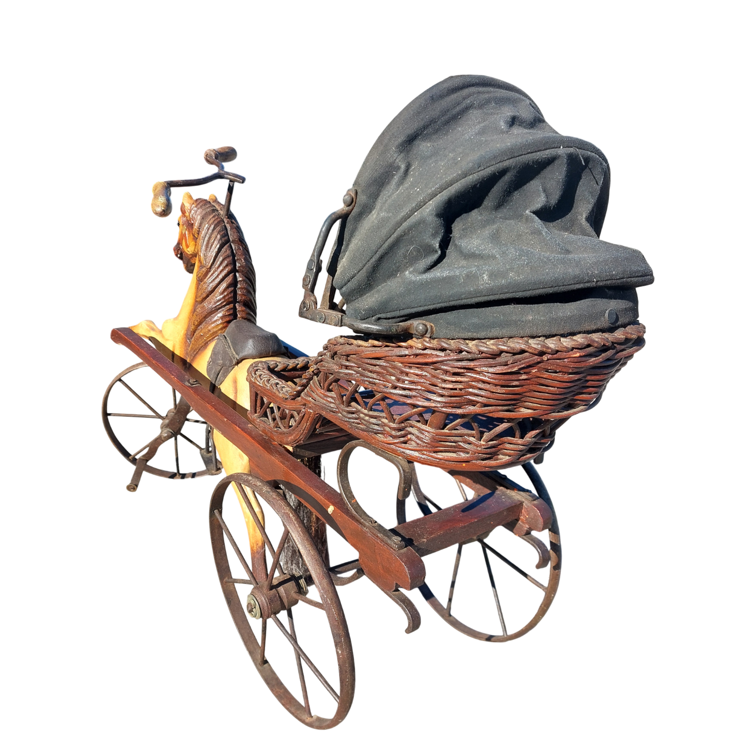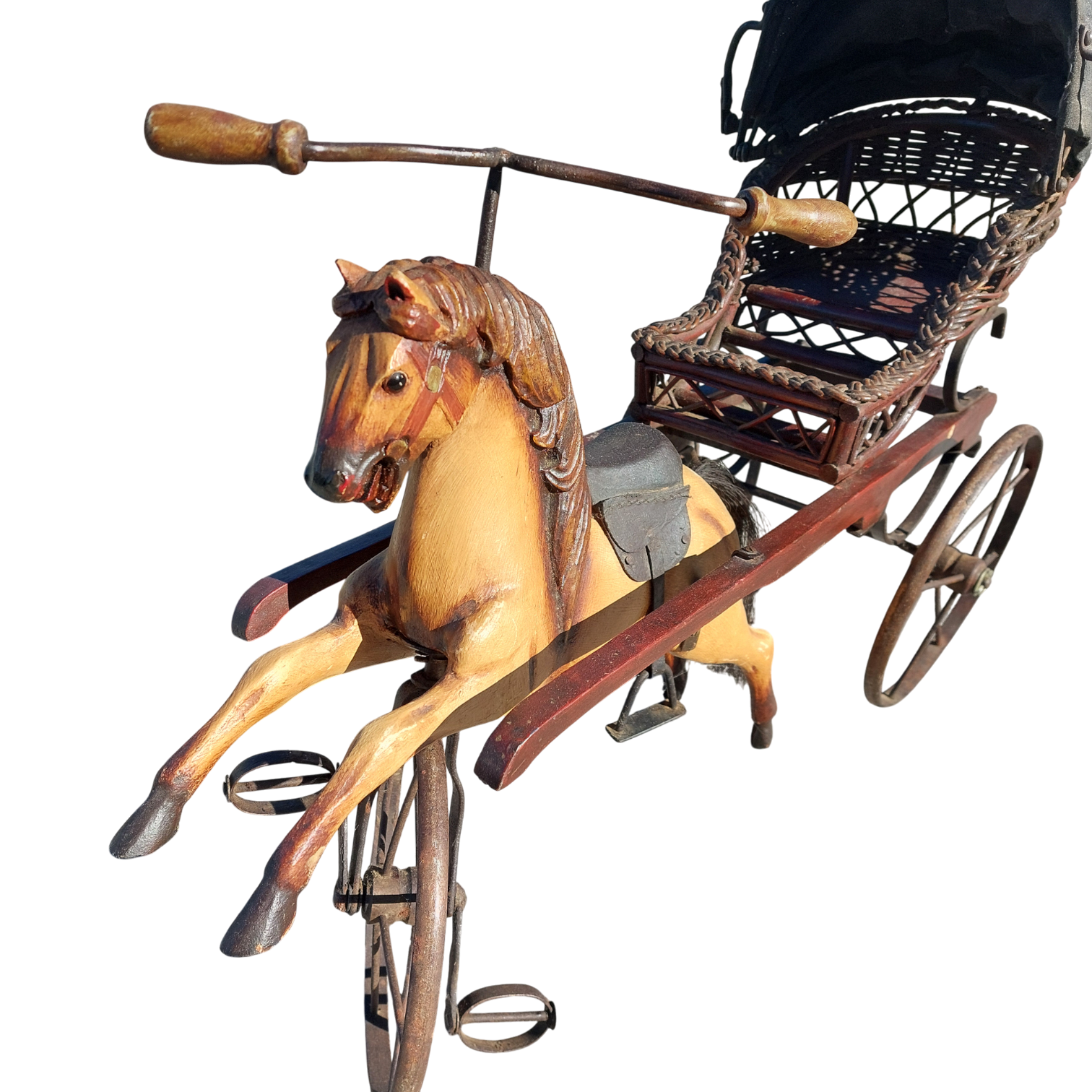 Medinis arkliukas su pinta karieta ir metaliniais ratais, priekinis ratas sukiojasi. Tai autentiška dekoratyvinė interjero detalė, kuri primena senųjų laikų vežimus ir gali tapti išraiškingu akcentu namuose ar kolekcijoje. Parvežtas iš Prancūzijos