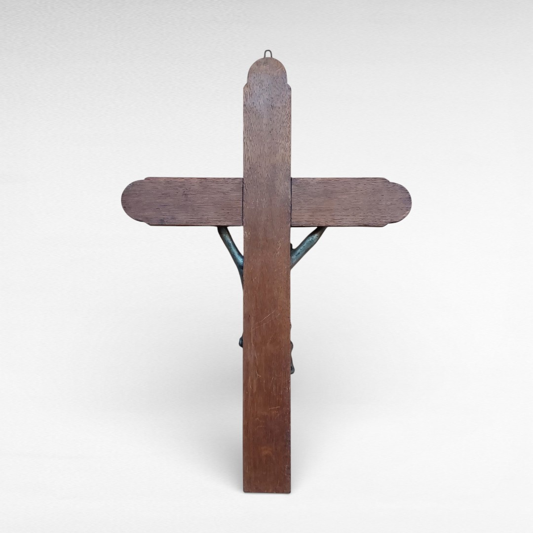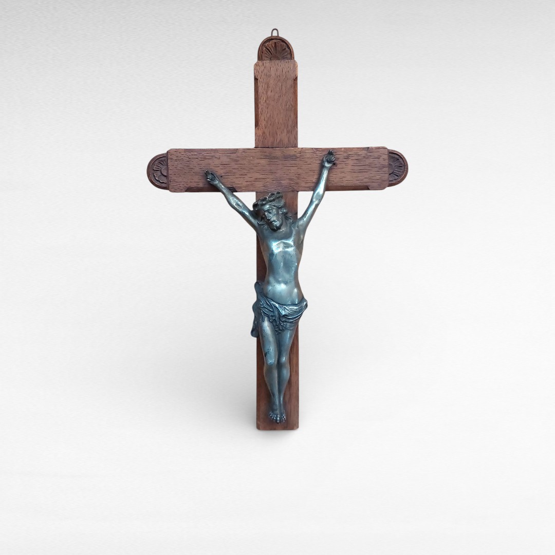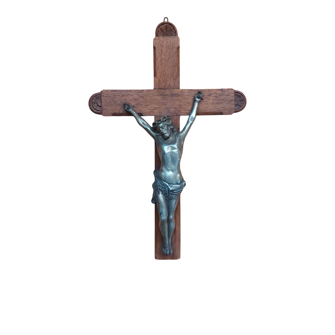 Antikvarinis medinis pakabinamas kryžius su metaline Kristaus figūra. Medžio galai dekoruoti drožybiniais motyvais, metalas natūraliai patamsėjęs nuo laiko. Būklė gera, su natūraliais naudojimo pėdsakais.