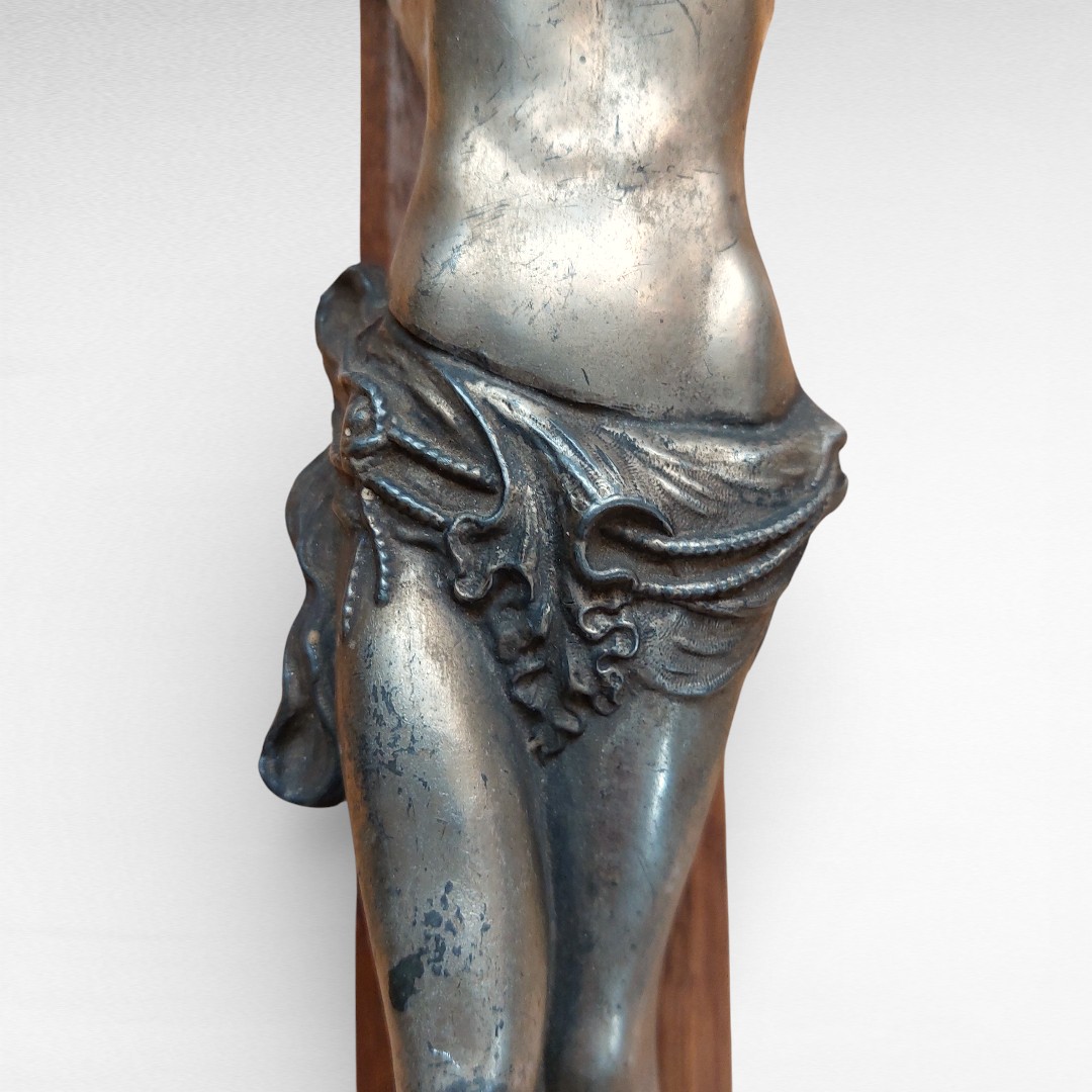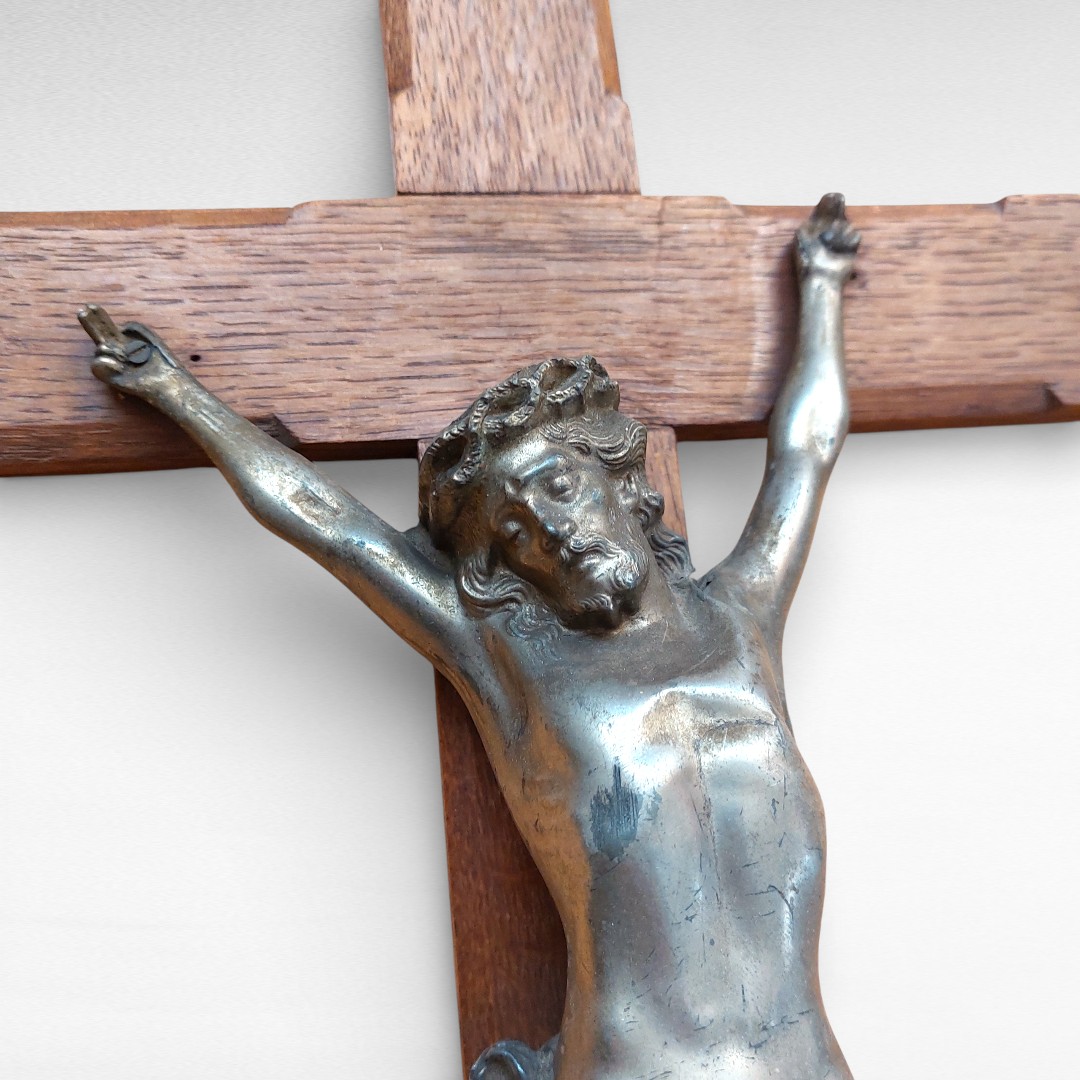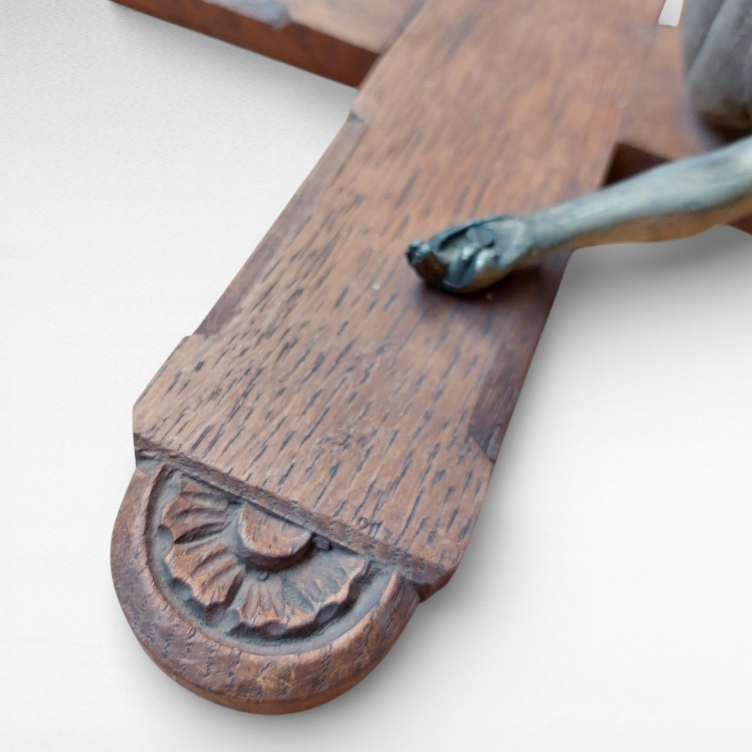 Antikvarinis medinis pakabinamas kryžius su metaline Kristaus figūra. Medžio galai dekoruoti drožybiniais motyvais, metalas natūraliai patamsėjęs nuo laiko. Būklė gera, su natūraliais naudojimo pėdsakais.