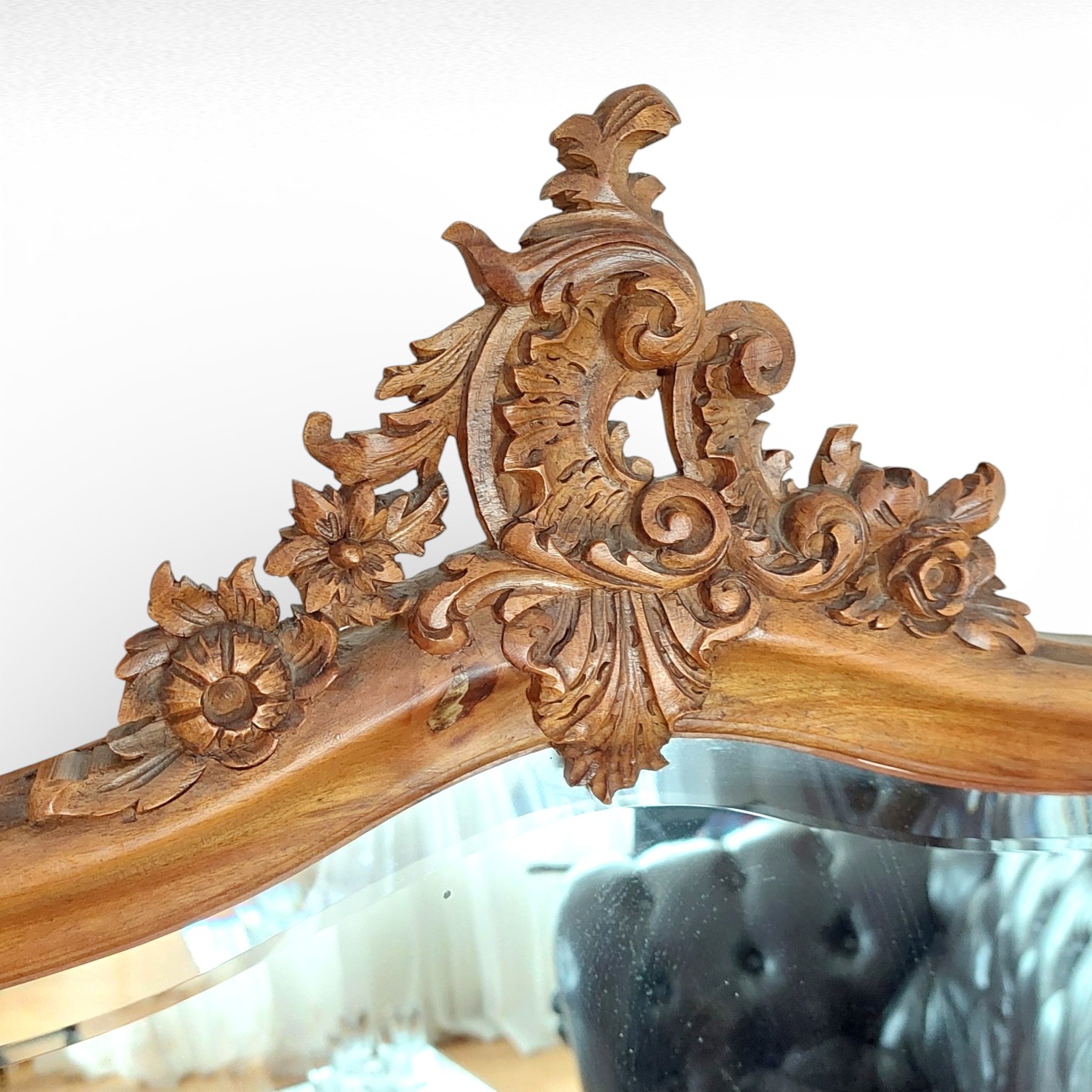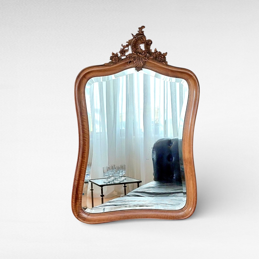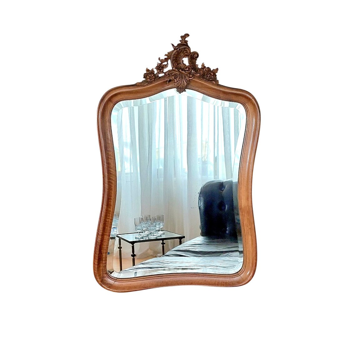Antikvarinis prancūziškas Louis XV stiliaus veidrodis. Riešutmedžio rėmas su rankų drožyba.