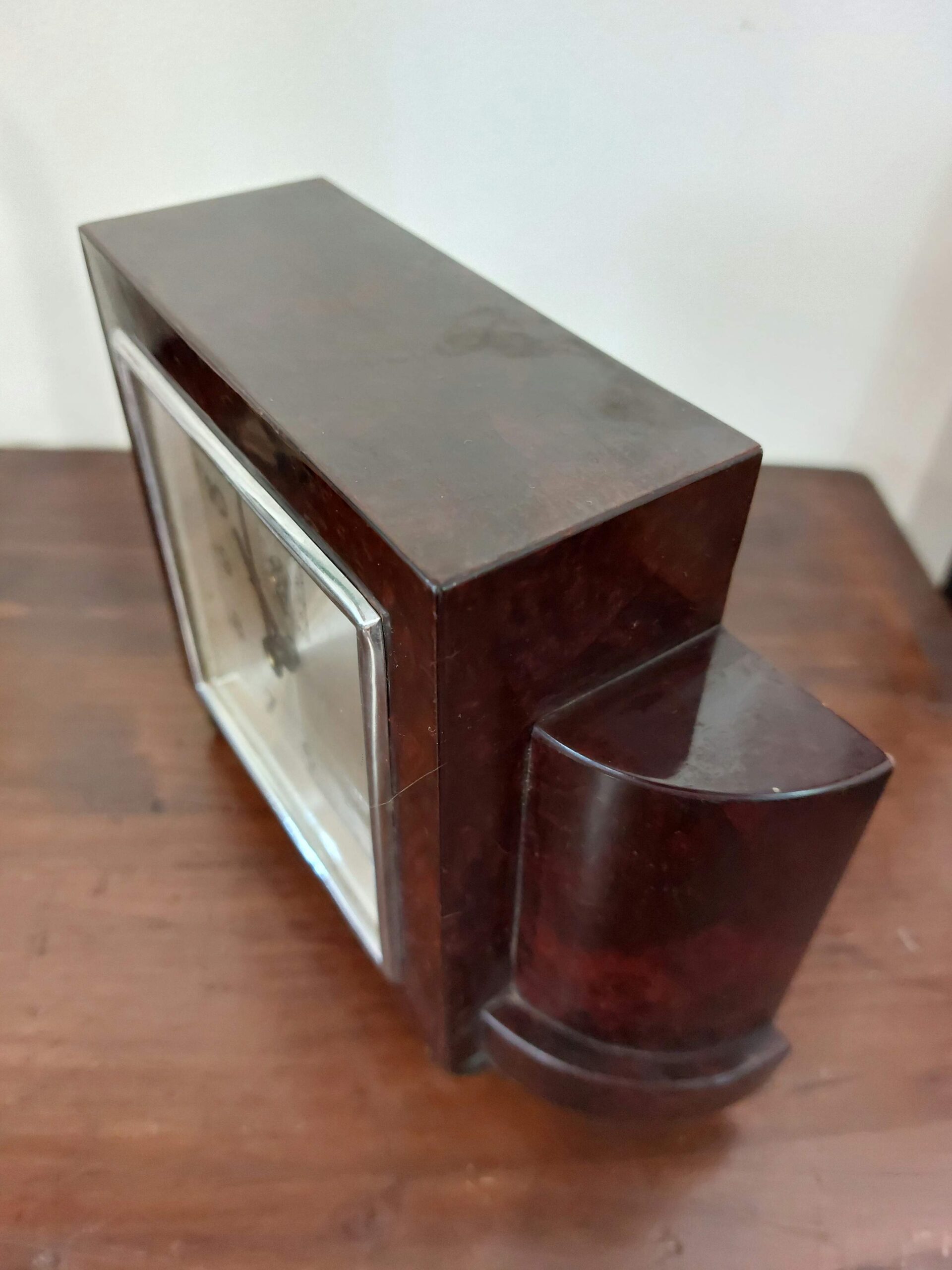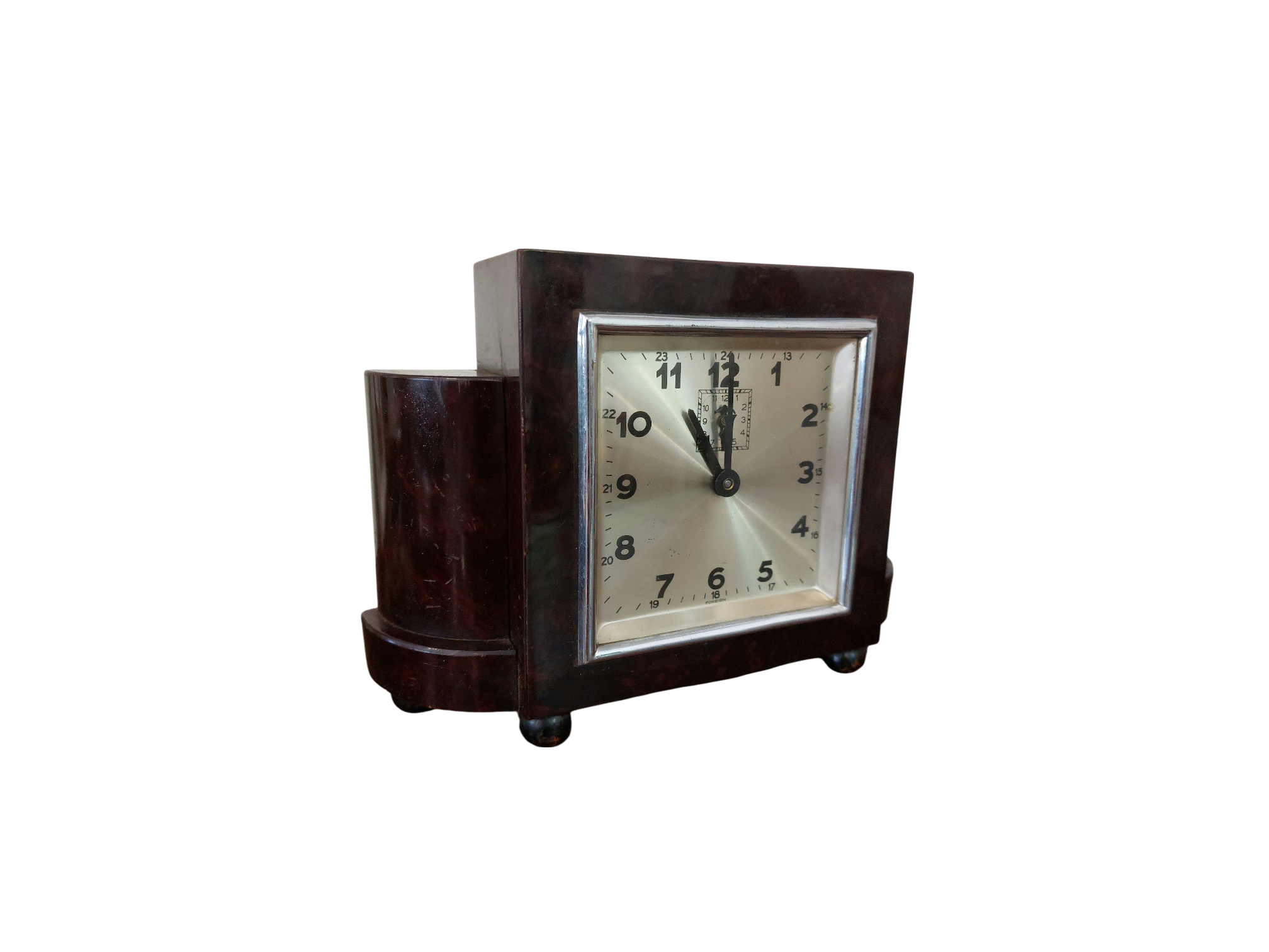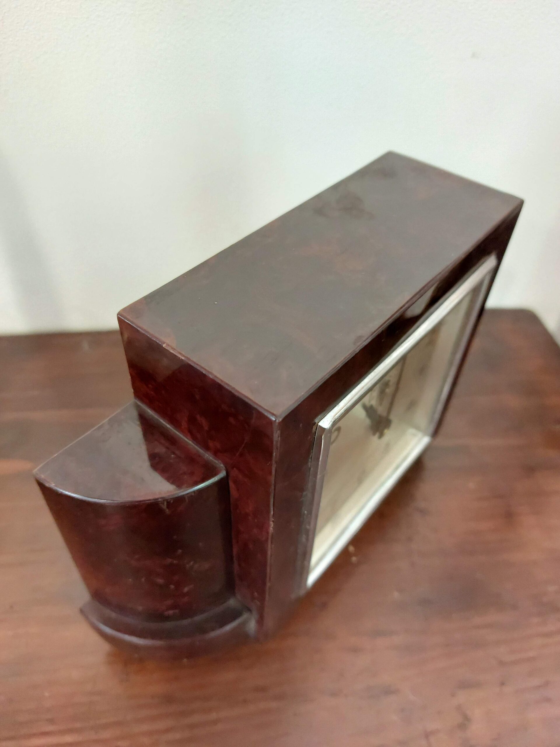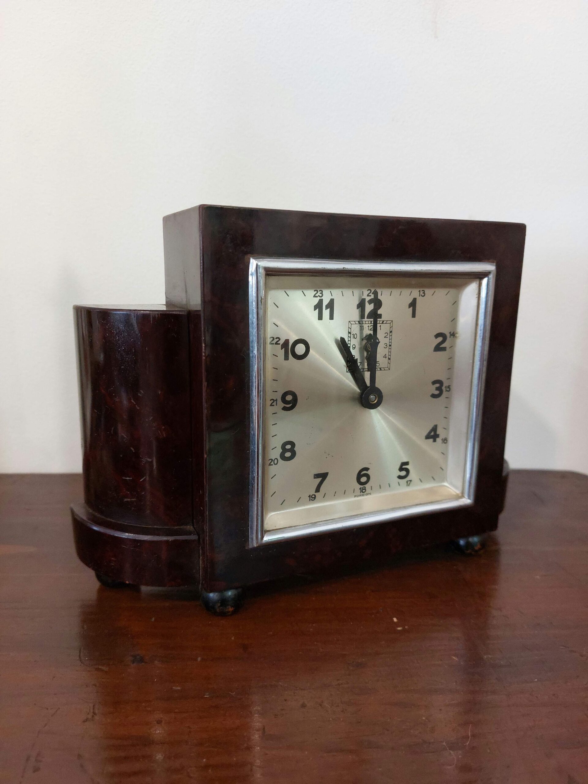 Art Deco laikrodis laikrodis iš Belgijos, pagamintas apie 1920–1930 m. Lakuoto medžio korpusas, metalo ciferblatas, viduje senasis mechanizmas (neveikia). Tinka kaip dekoratyvinė interjero detalė.