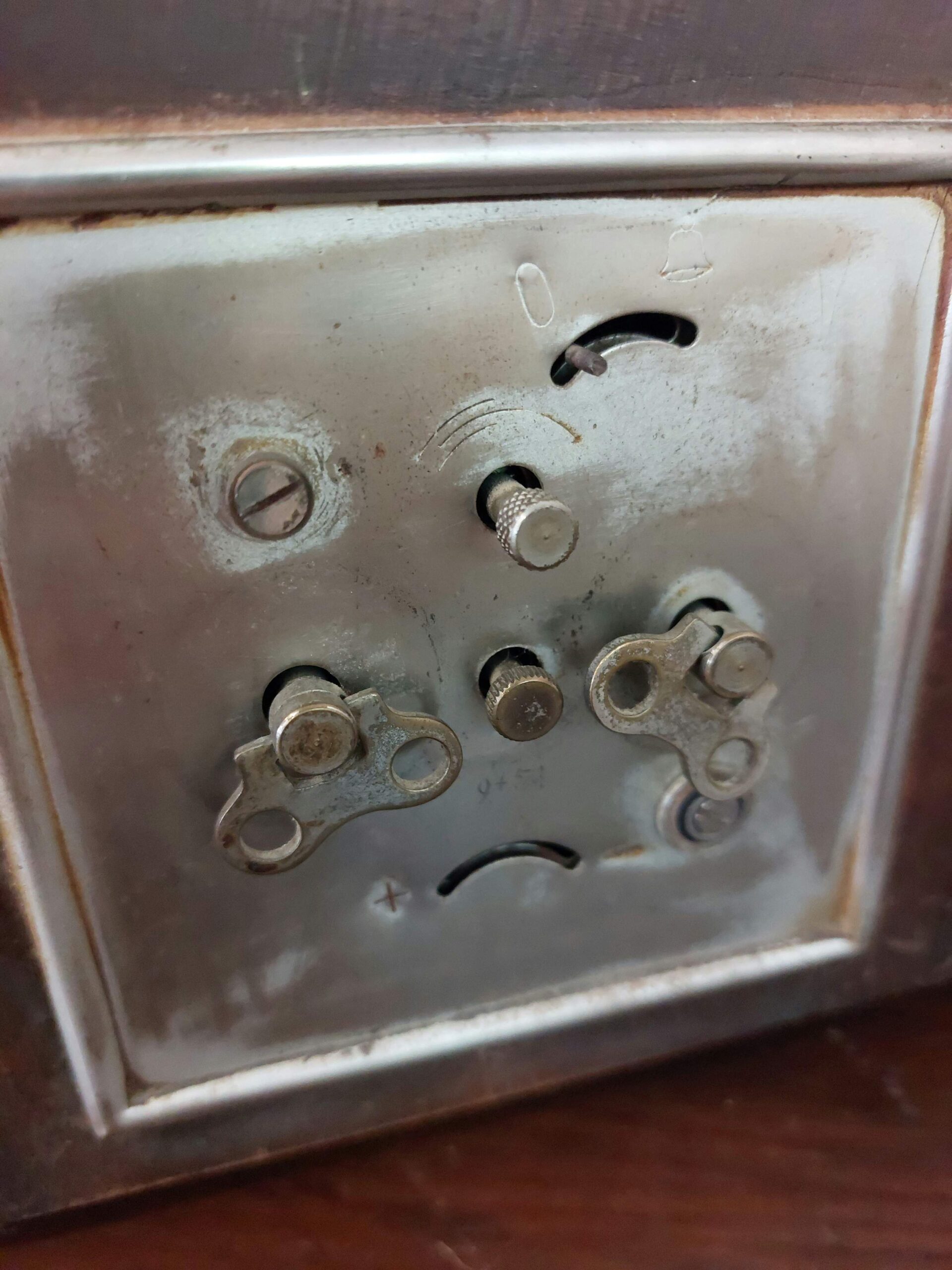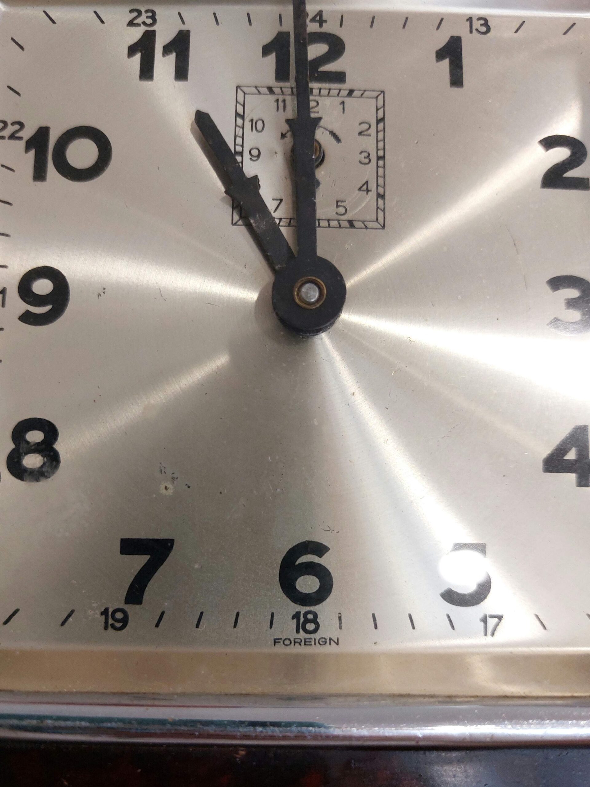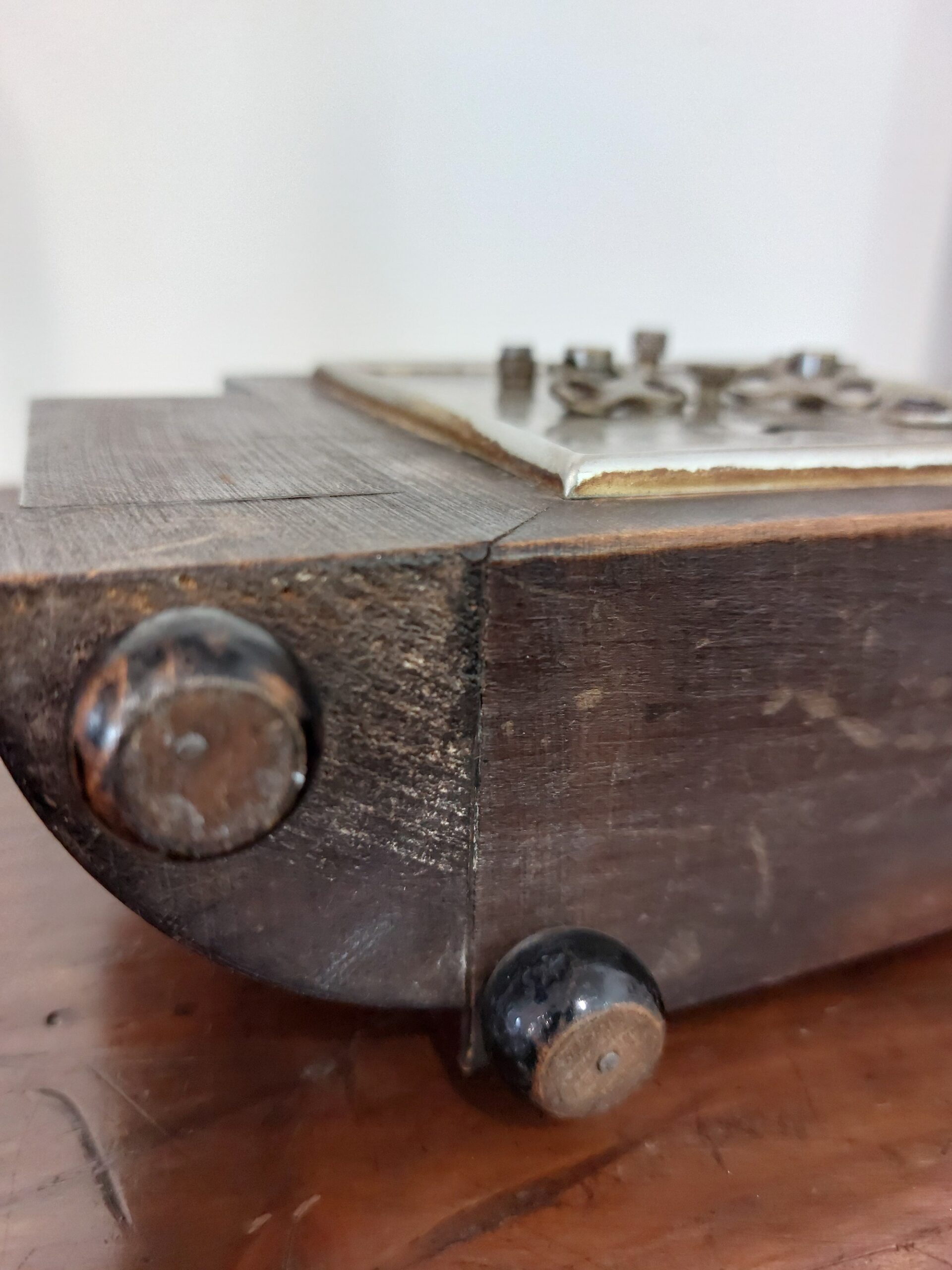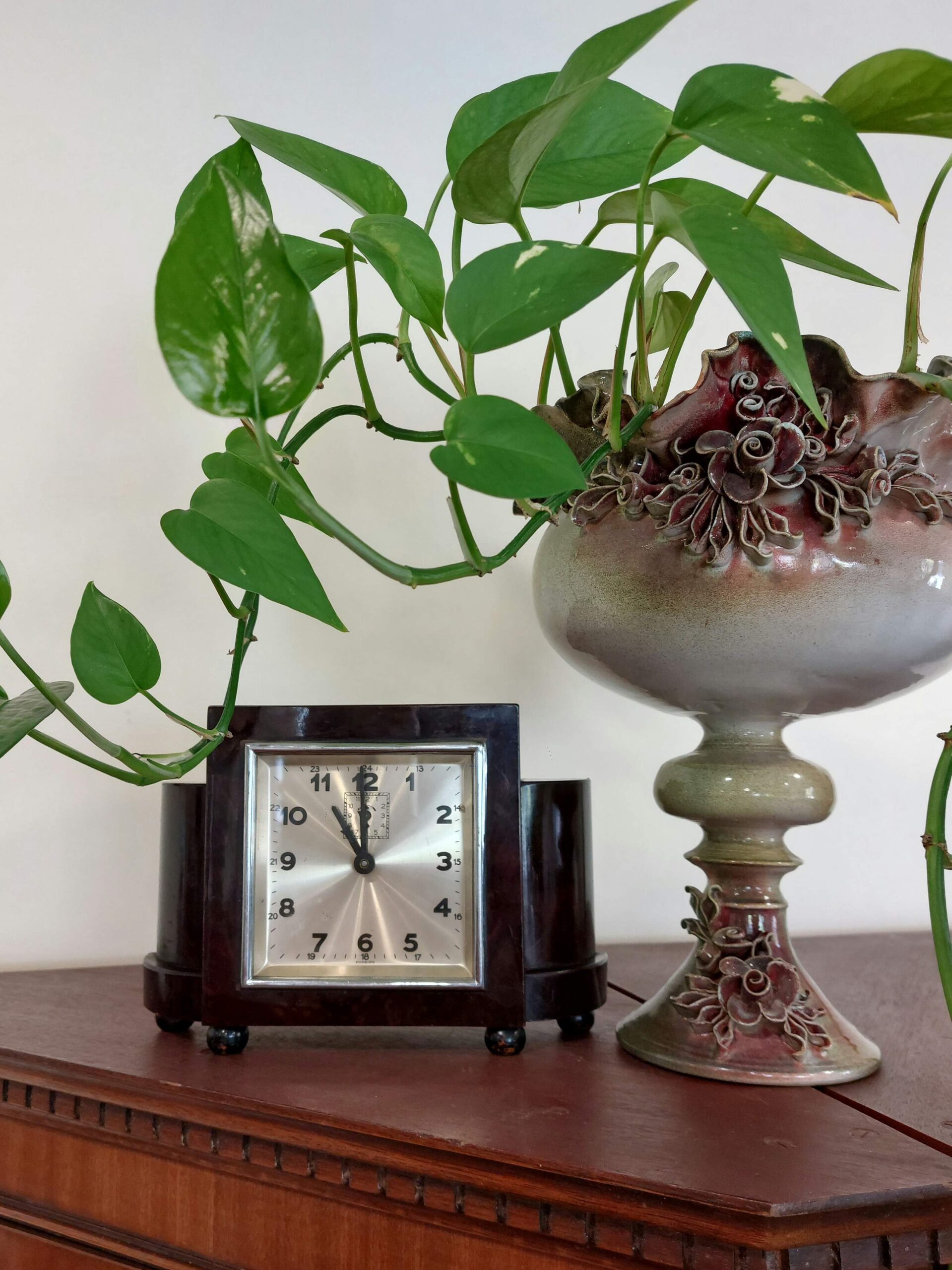 Art Deco laikrodis laikrodis iš Belgijos, pagamintas apie 1920–1930 m. Lakuoto medžio korpusas, metalo ciferblatas, viduje senasis mechanizmas (neveikia). Tinka kaip dekoratyvinė interjero detalė.
