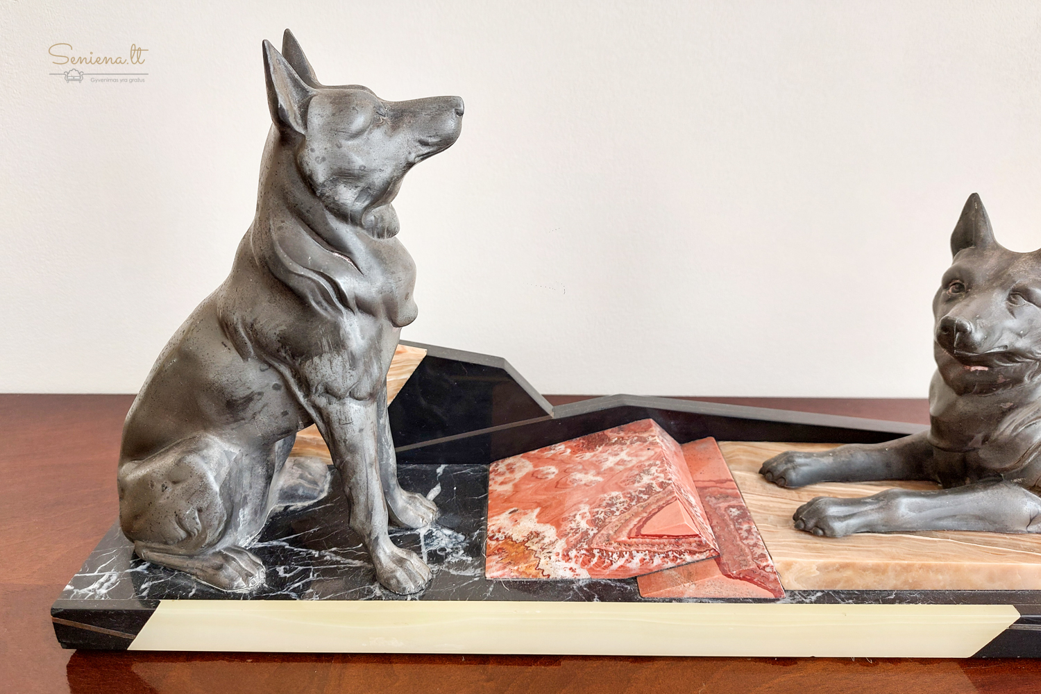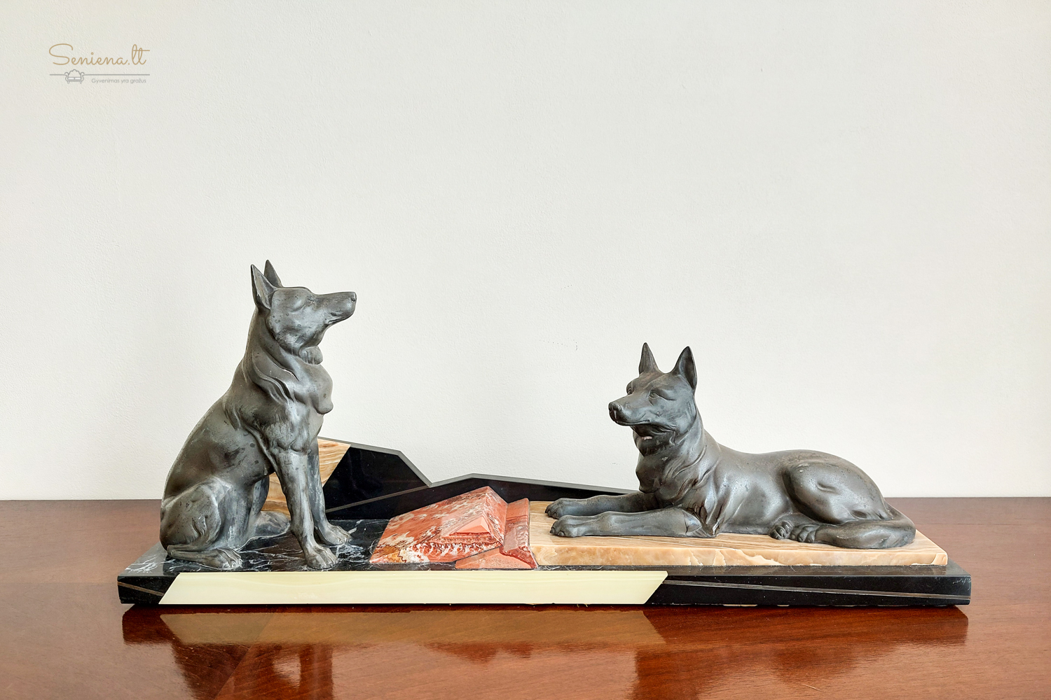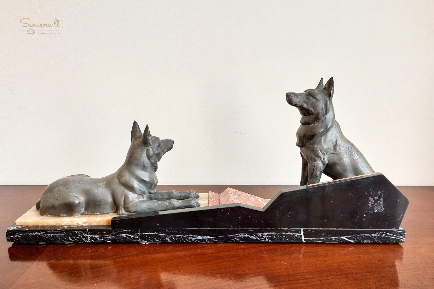 Art Deco stikiaus skulptūra “Vokiečių aviganiai” vaizduojanti du besiilsinčius vokiečių aviganius ant marmuro pagrindo. Kadangi žymos nėra, manome, autorius  prancūzų menininkas Louis Albert Carvin (1875-1951)