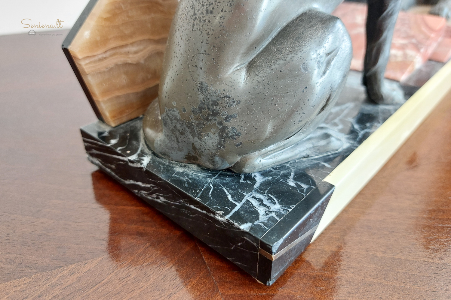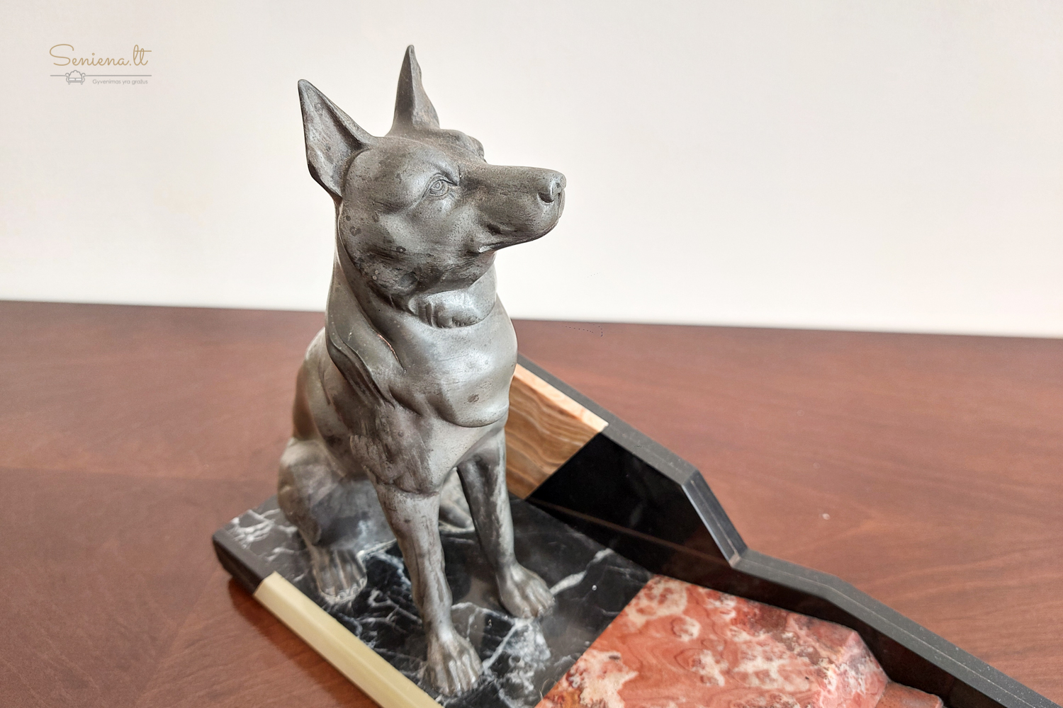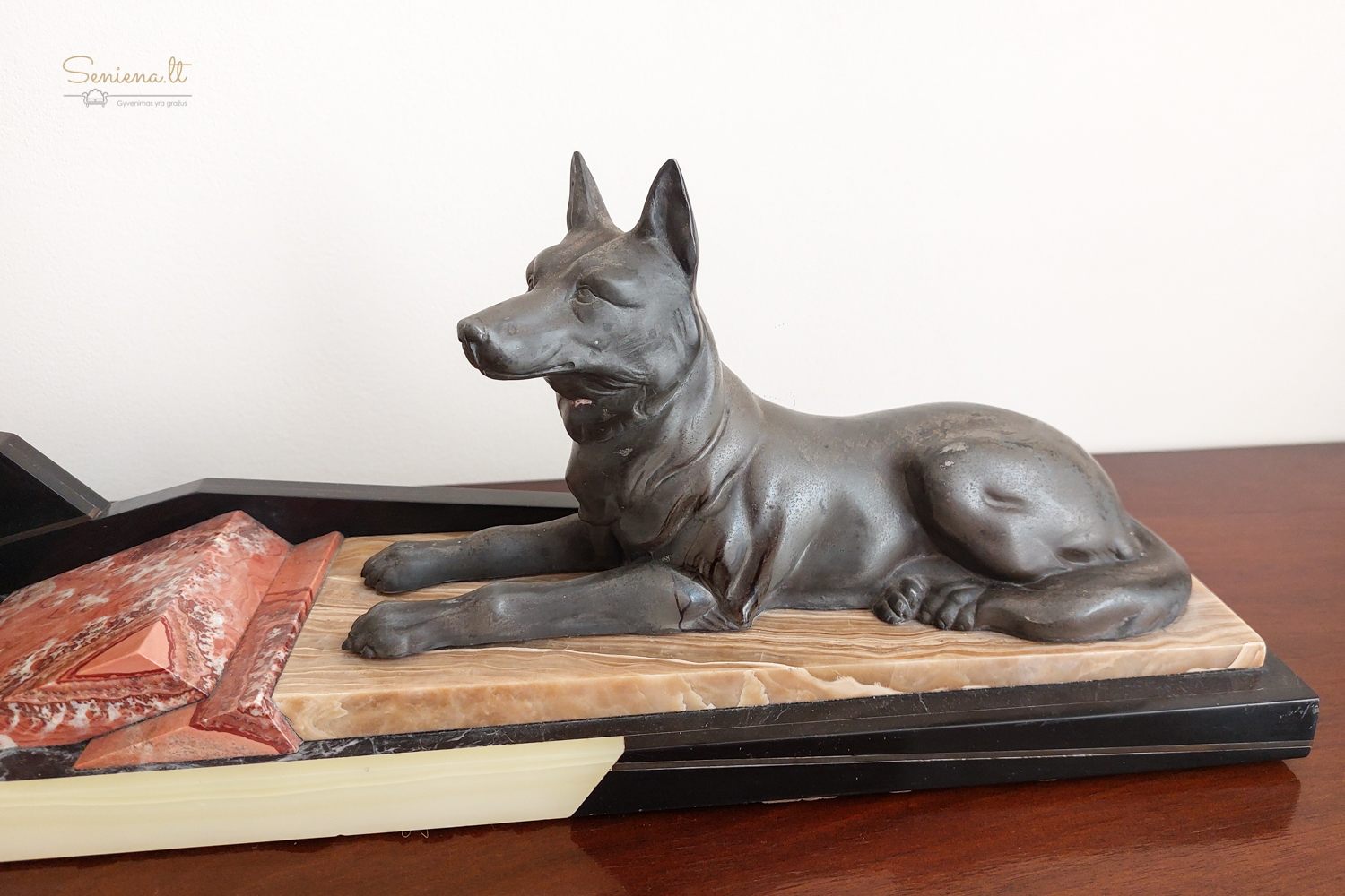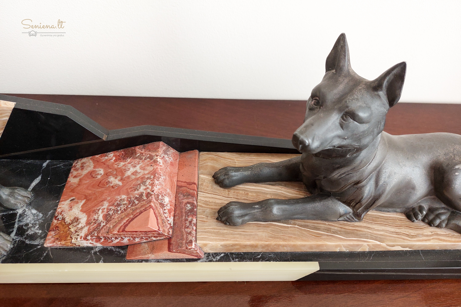 Art Deco stikiaus skulptūra “Vokiečių aviganiai” vaizduojanti du besiilsinčius vokiečių aviganius ant marmuro pagrindo. Kadangi žymos nėra, manome, autorius  prancūzų menininkas Louis Albert Carvin (1875-1951)