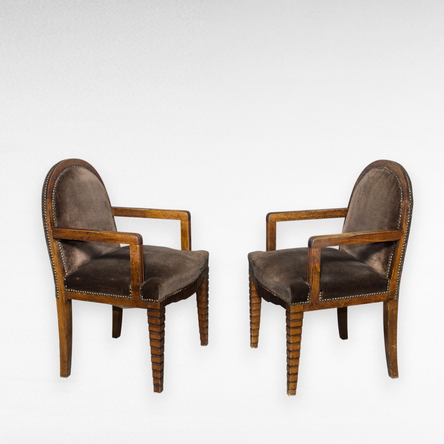 Autentiški Art Deco stiliaus foteliai iš XX a. 3–4 dešimtmečio, tarpukario laikotarpio. Jų formos aiškios ir griežtesnės, su arkos formos atlošais, dekoruotais metalinėmis vinutėmis, ir dailiai apdirbtomis kojelėmis. Rėmas iš masyvaus medžio ąžuolo, apmušalai tamsiai rudo aksomo, derančio su mediena.