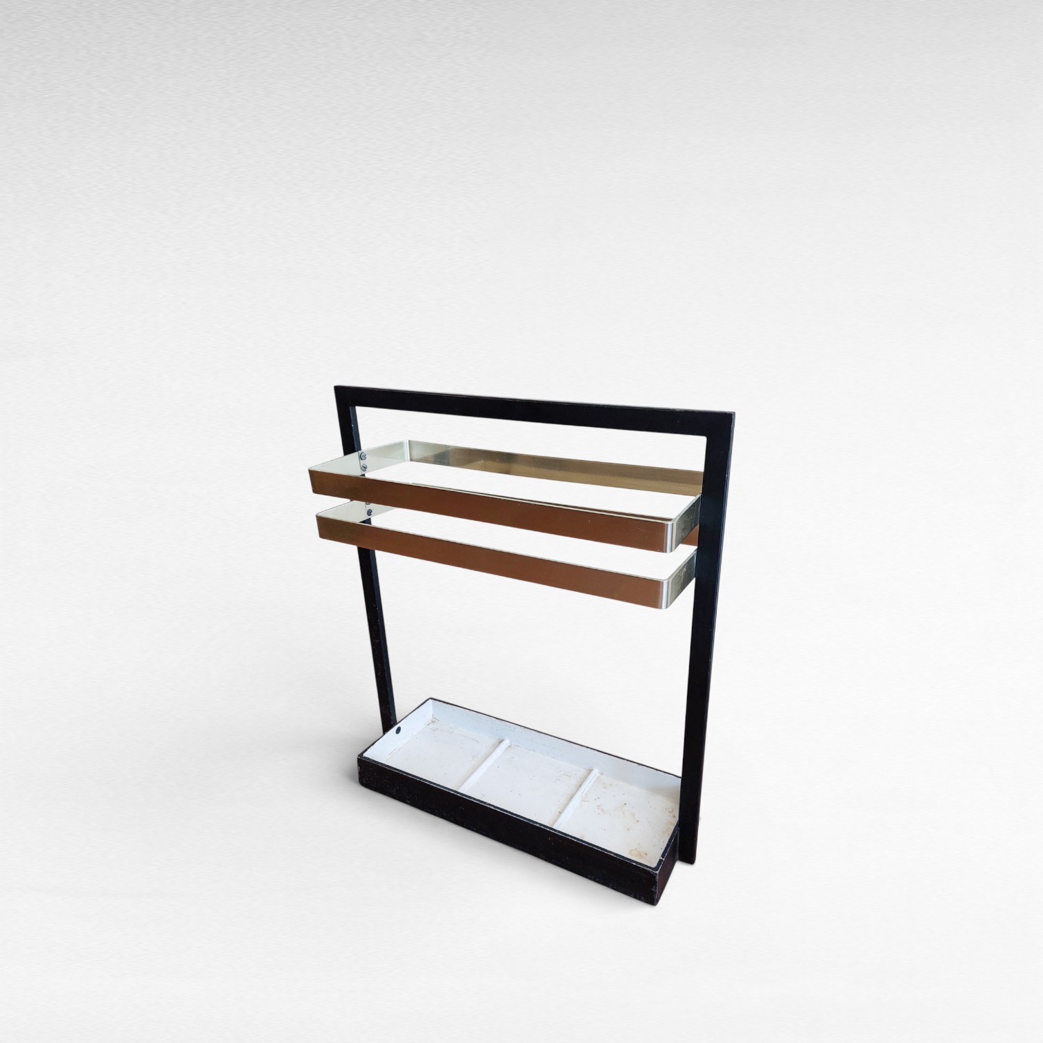 Bauhaus stiliaus skėtinė, gamintojas GECO Metall. Konstrukcija iš metalo, derinanti juodą, baltą atspalvius.