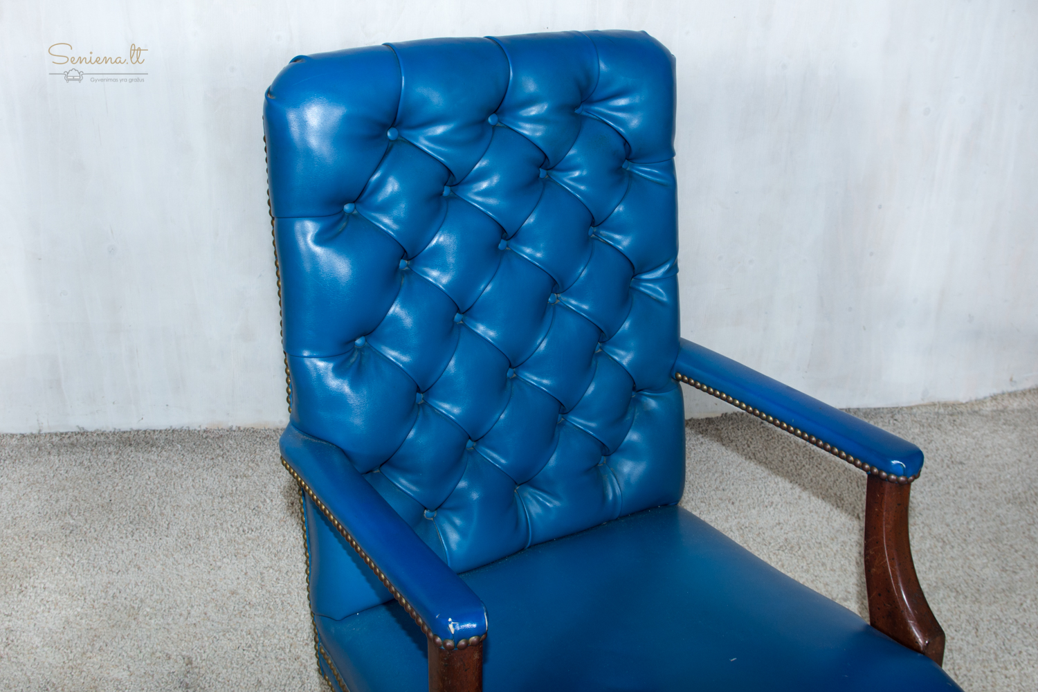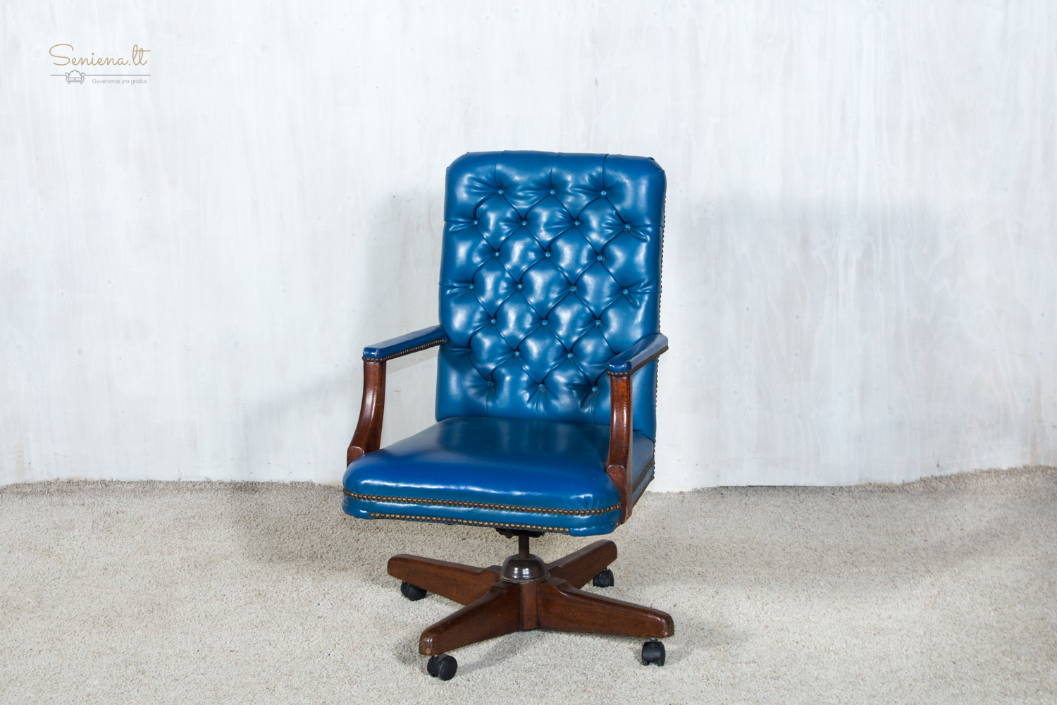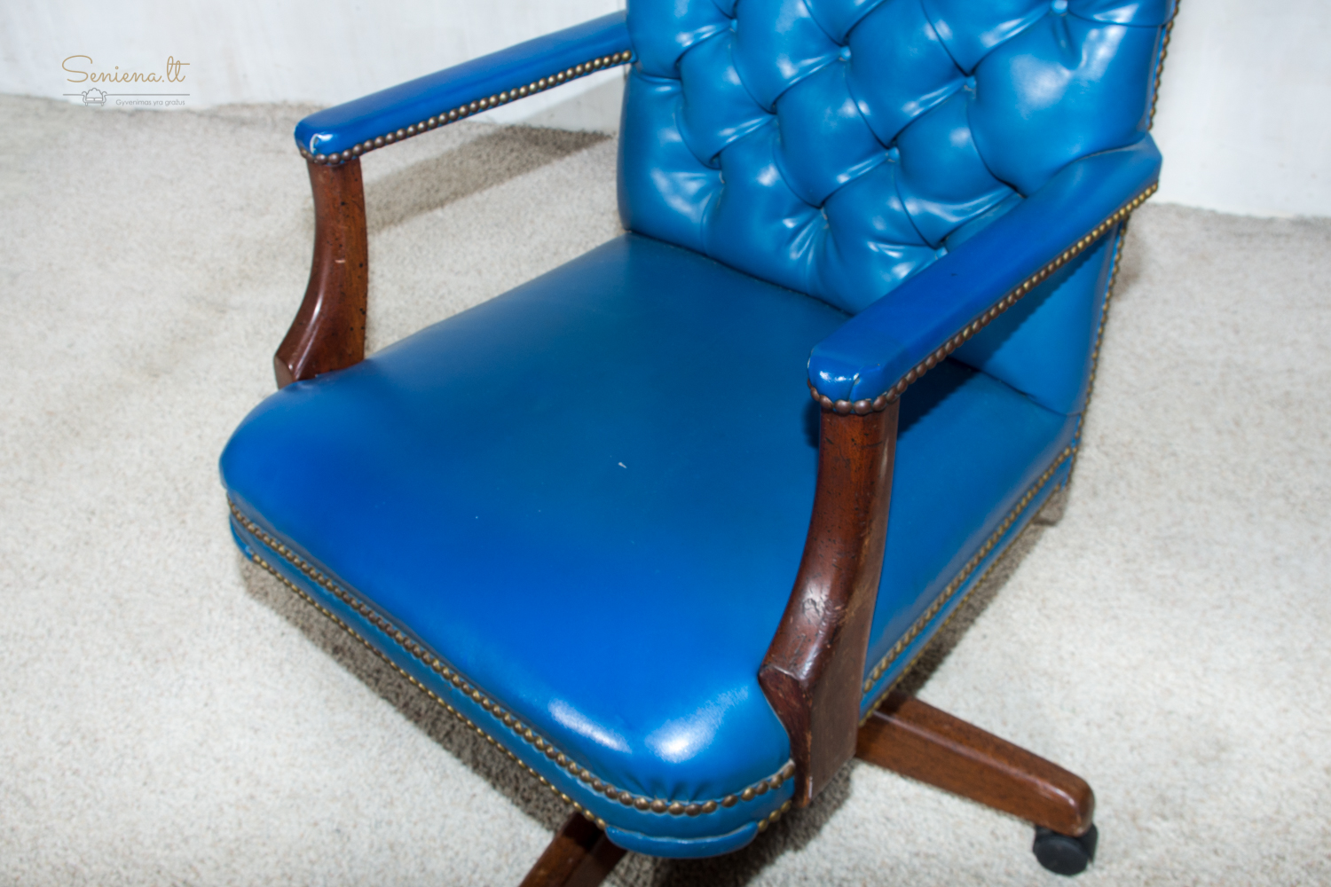 Biuro odinis chesterfield fotelis, 1930-40 m. Reguliuojasi aukštis, po sėdyne yra spyruoklė, jos dėka linguojama į priekį ir atgal. Geros būklės. Parvežta iš Prancūzijos.