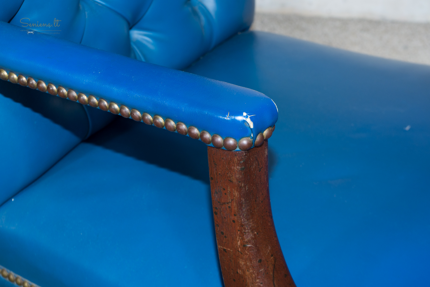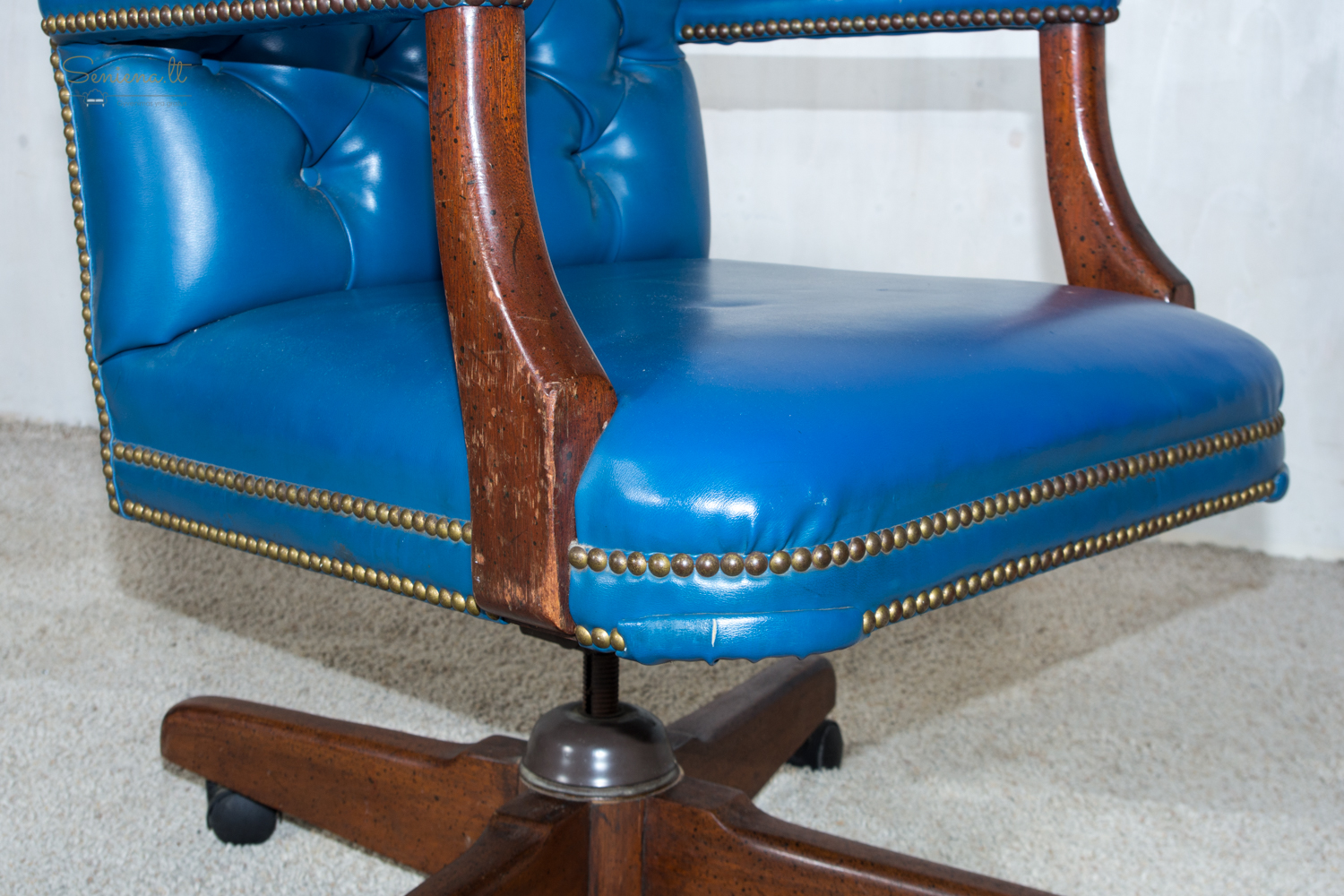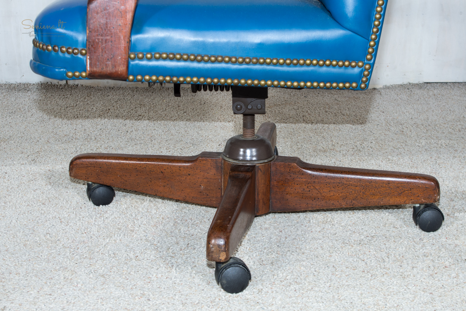 Biuro odinis chesterfield fotelis, 1930-40 m. Reguliuojasi aukštis, po sėdyne yra spyruoklė, jos dėka linguojama į priekį ir atgal. Geros būklės. Parvežta iš Prancūzijos.