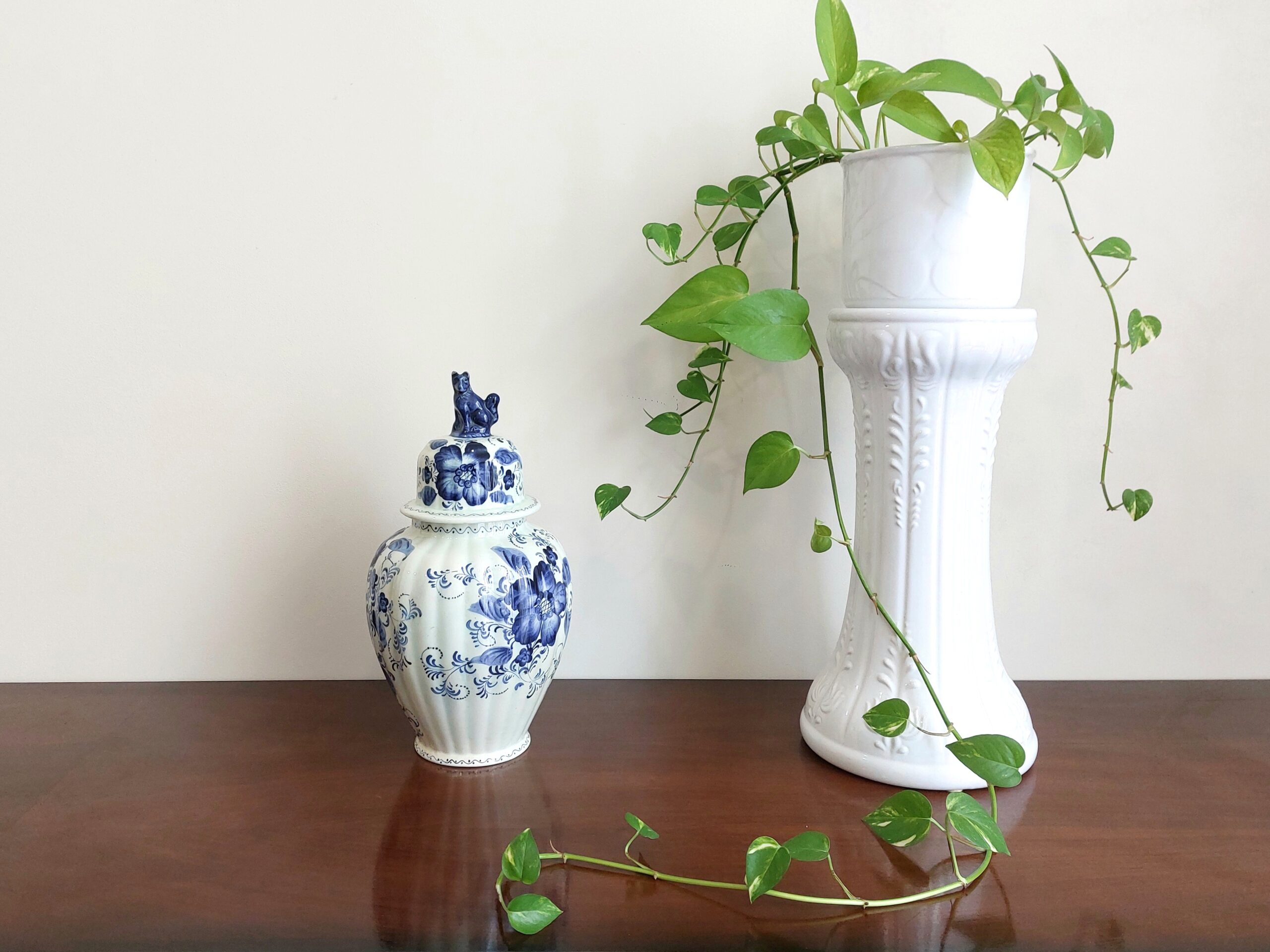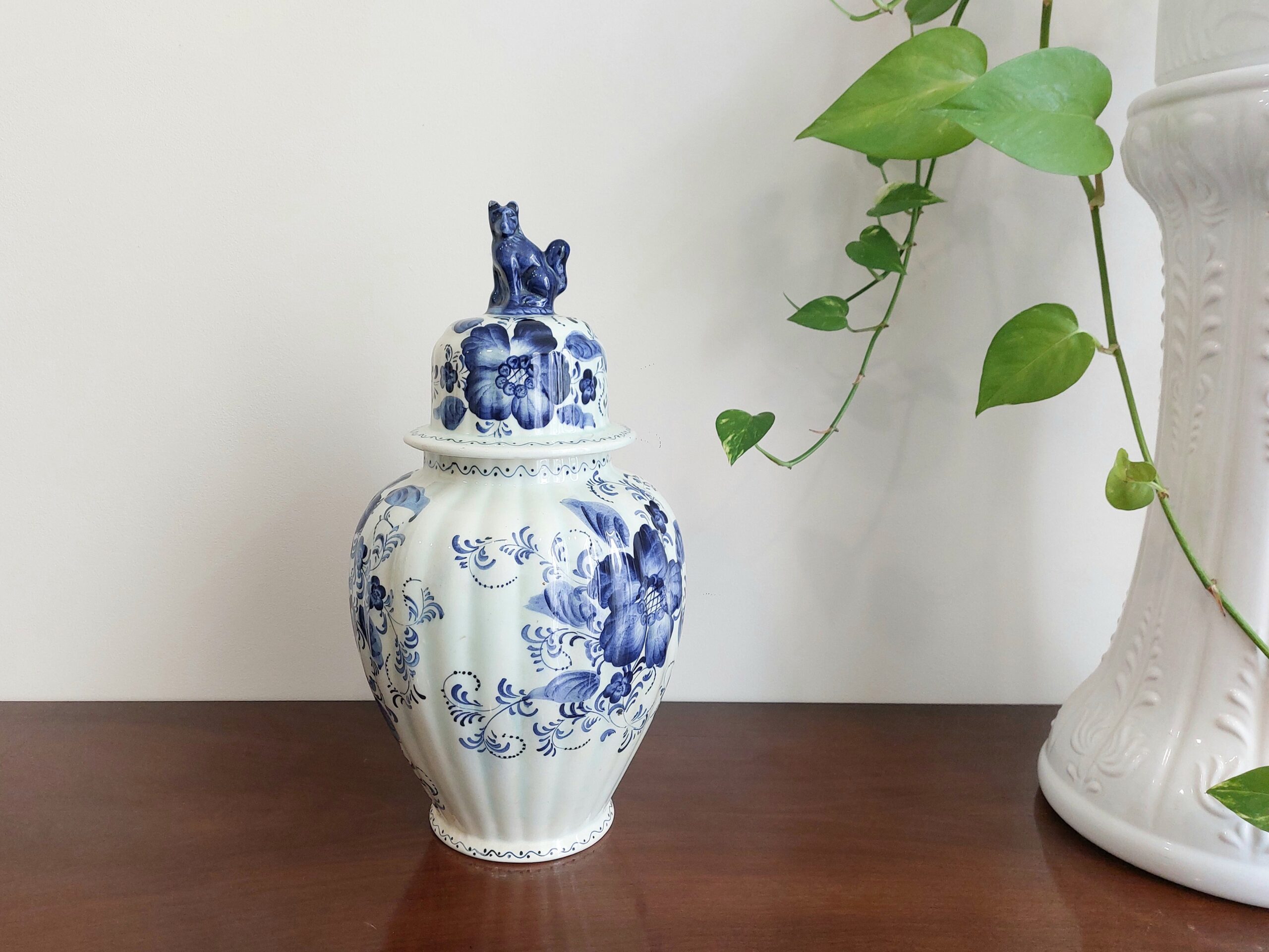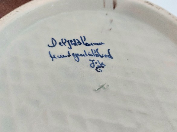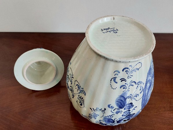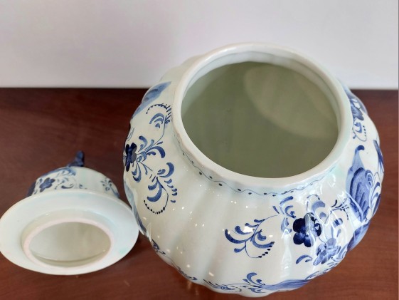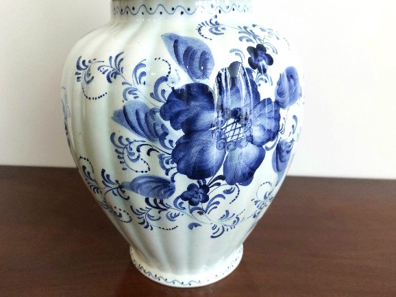 Delft stiliaus keraminė vaza pasižymi būdinga mėlynos ir baltos spalvų gama bei rankomis tapytais gėlių ir paukščių motyvais. Ant dugno esantis užrašas „Delftsblauw handgeschilderd“ (rankomis dažyta Delfto mėlyna) patvirtina meistro atliktą darbą, o šalia esantys inicialai JG leidžia manyti, kad tai individualus amatininko kūrinys, o ne masinės gamybos dirbinys.
