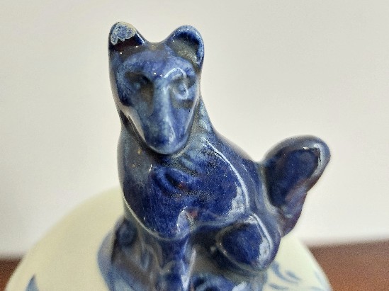 Vazos dangtį vainikuoja dekoratyvinė figūra. Svarbu pažymėti, kad vienos ausies kraštelis yra šiek tiek nuskilęs, tačiau tai neturi įtakos bendrai estetikai ar eksponavimo galimybėms.