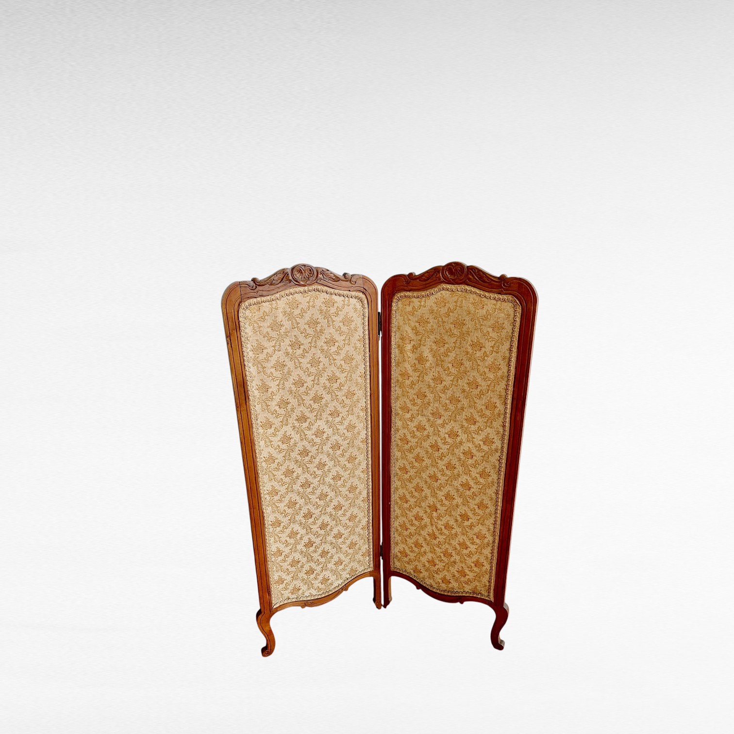 Dviejų dalių židinio širma. Medinis rėmas su drožiniais viršutinėje dalyje, priekis dengtas gėlėtu gobelenu. Širma laisvai pastatoma, sulankstoma, konstrukcija stabili.