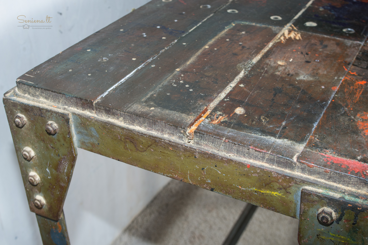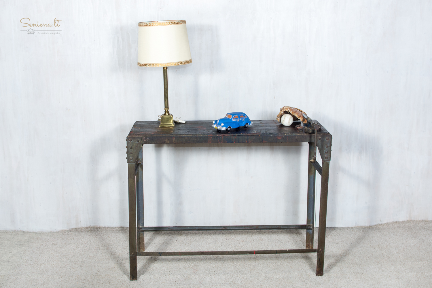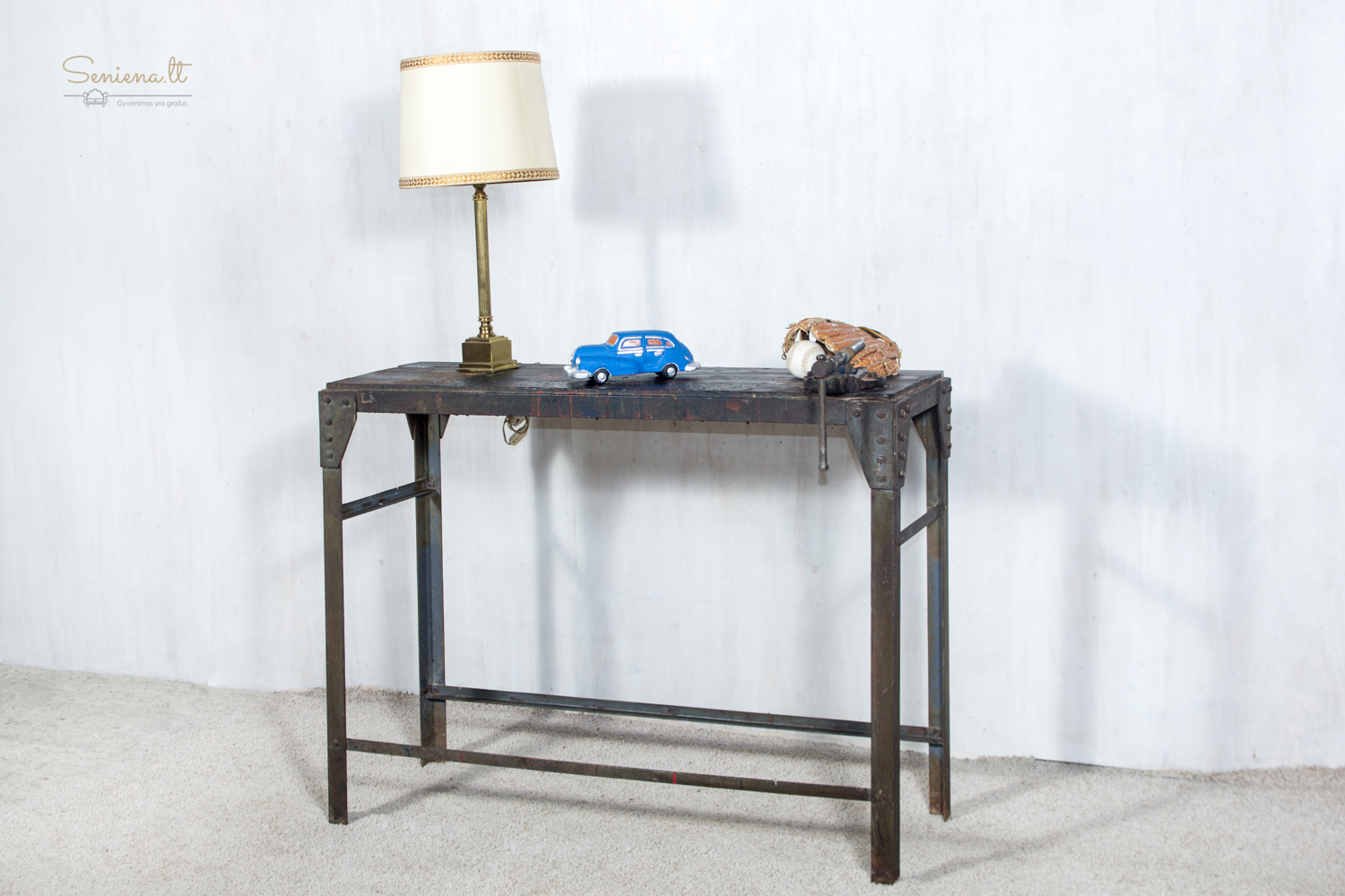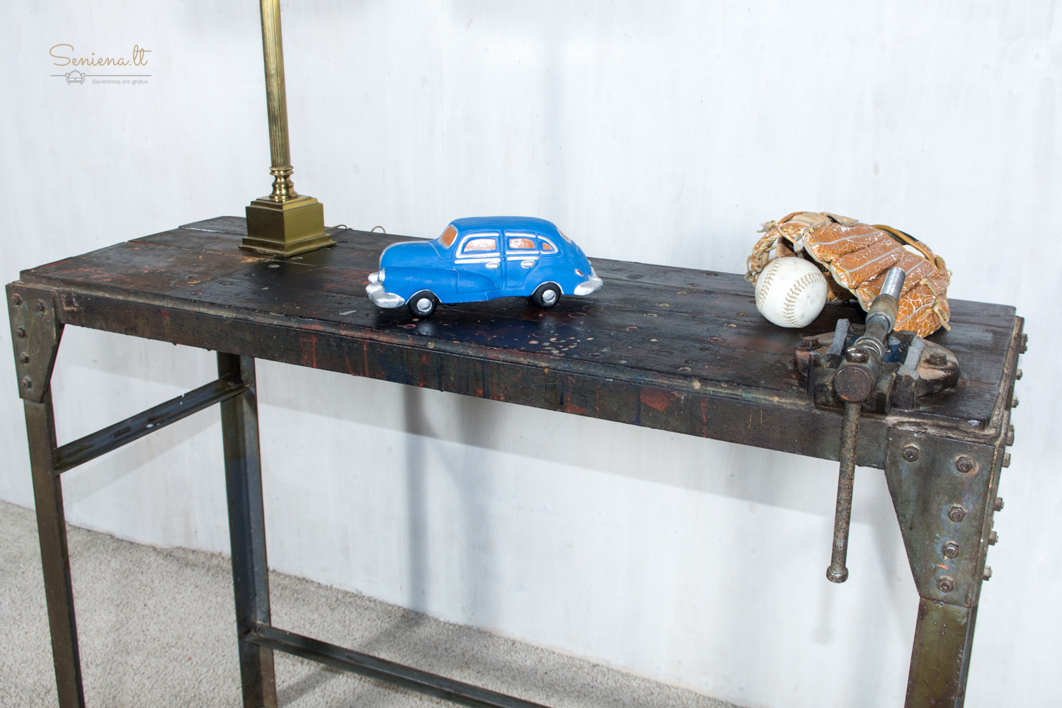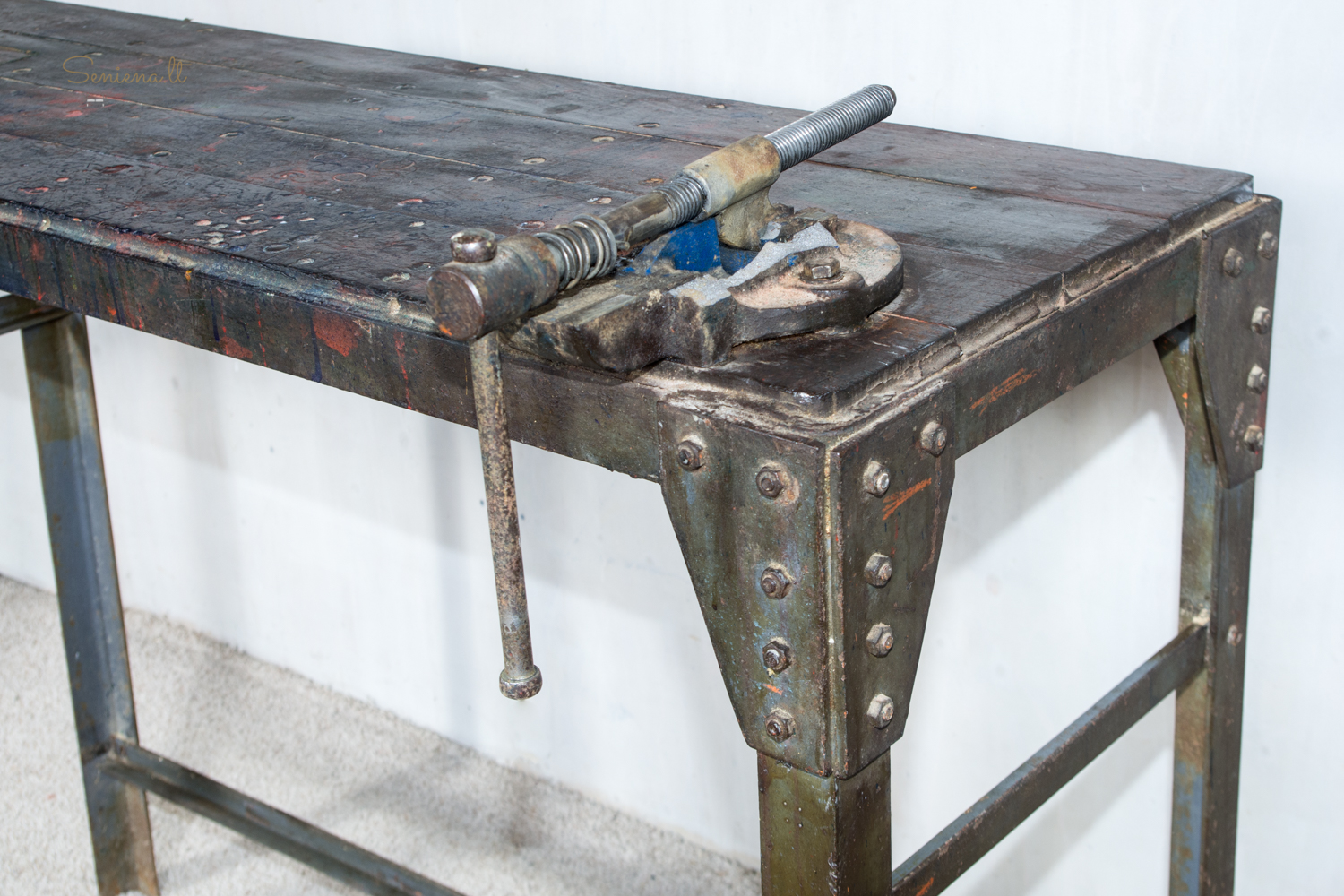 Autentiškas industrinio stiliaus darbo stalas su tvirta metaline konstrukcija ir mediniu stalviršiu, nusėtu senų dažų žymėmis ir naudojimo pėdsakais. Kampuose kniedytos jungtys suteikia jam tvirtumo, o pritvirtintas mechaninis spaustuvas išryškina jo dirbtuvėms būdingą charakterį. Tai išskirtinis baldas, puikiai tinkantis lofto interjerui, gali būti naudojamas kaip darbo ar konsolinis stalas. Parvežta iš Prancūzijos