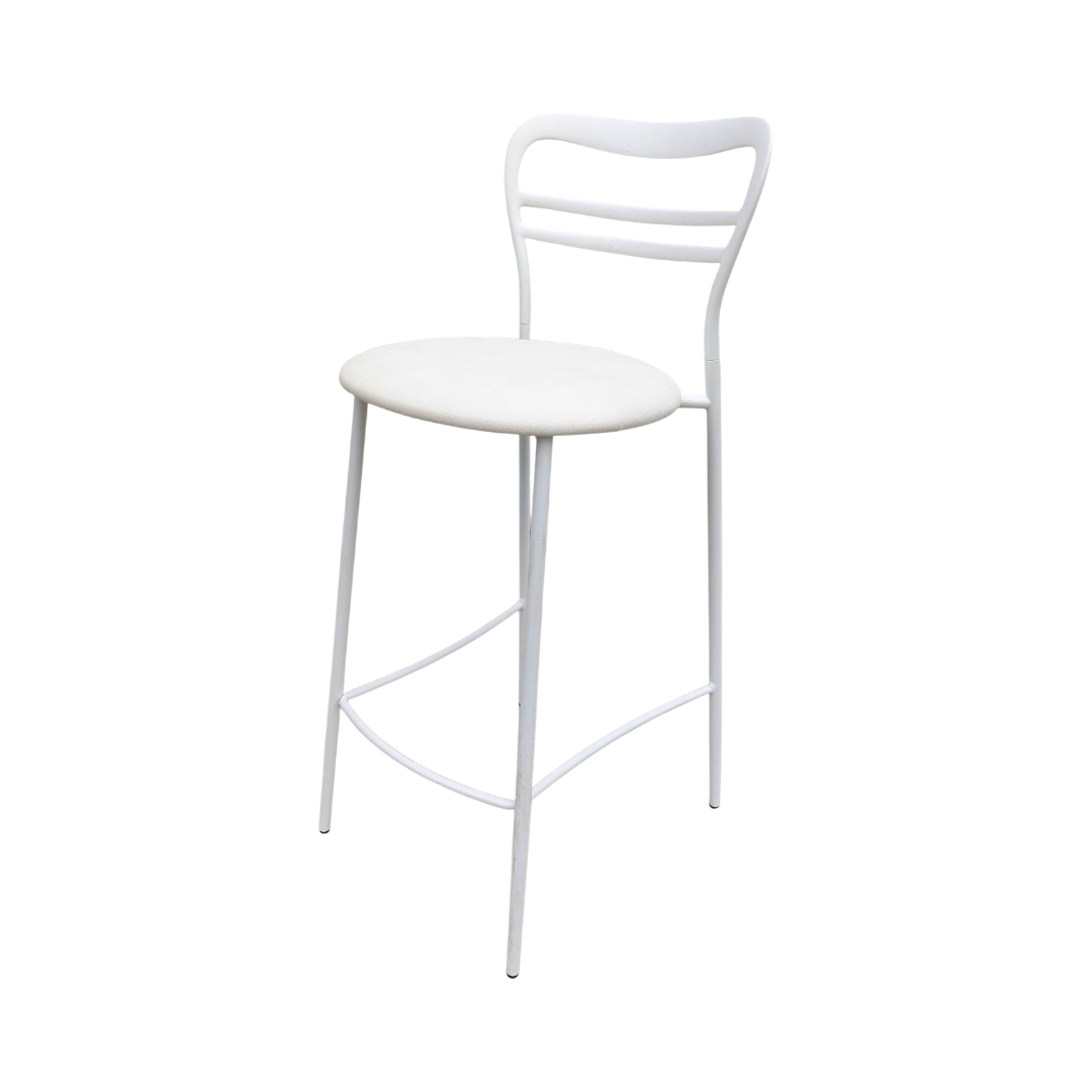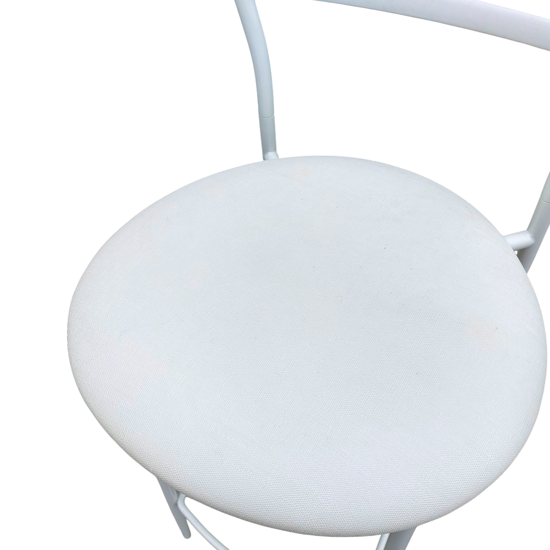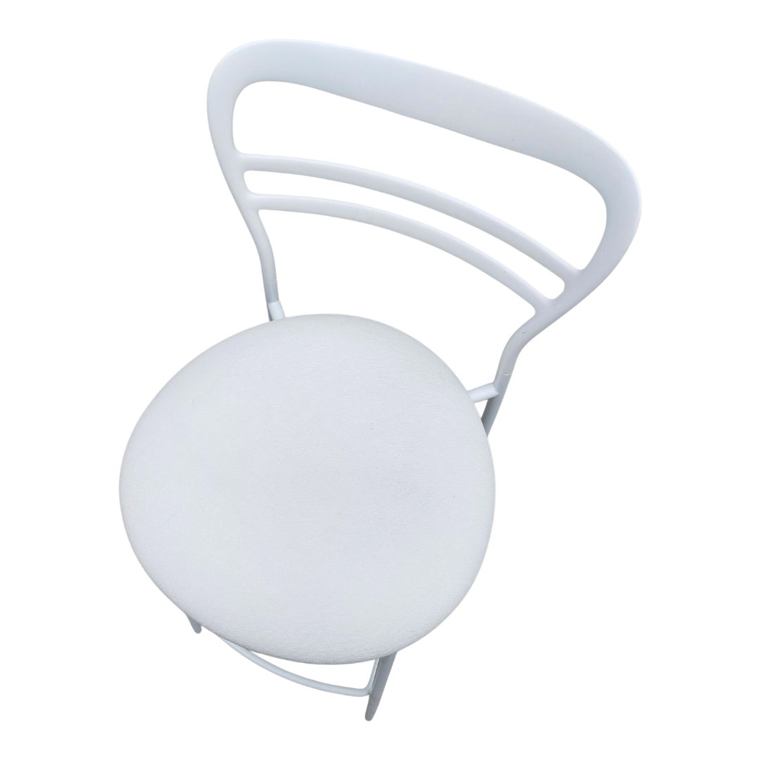 Moderni, balta, metalinio rėmo kėdė su apvalia sėdyne, aptraukta eko oda. Lengva, patogi ir stabili. Pagaminta Italijoje. Būklė gera