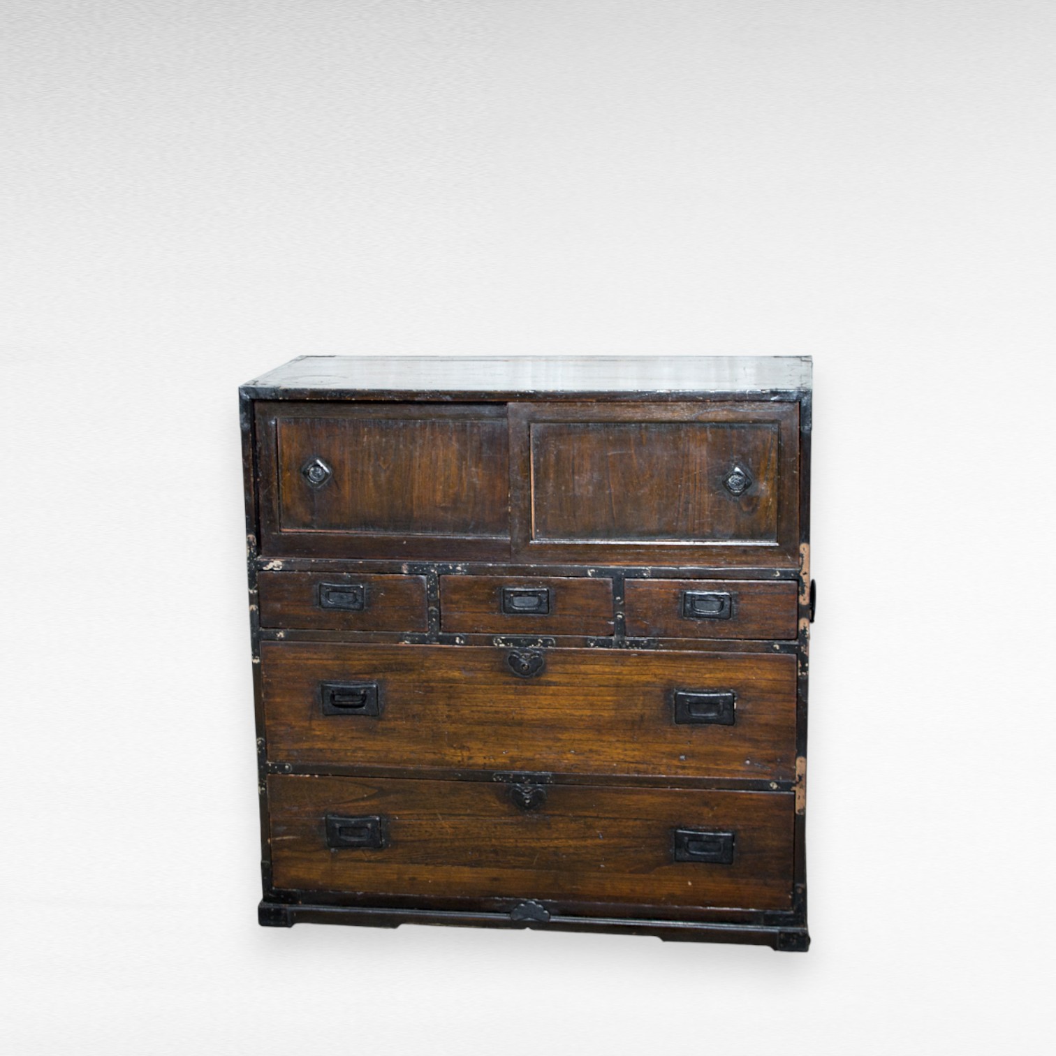 Tai reta japoniška komoda iš XIX a., Meidži laikotarpio, priskiriama chōba-dansu tipui, kuris buvo naudojamas prekyboje ir versle. Ji turi stalčius ir dvigubas dureles viršuje – viskas apgalvota patogiam daiktų laikymui. Pagaminta iš patvarios medienos, greičiausiai keyaki (zelkovos) arba sugi (kedro), todėl baldas tvirtas ir iki šiandien išlaikęs savo formą.