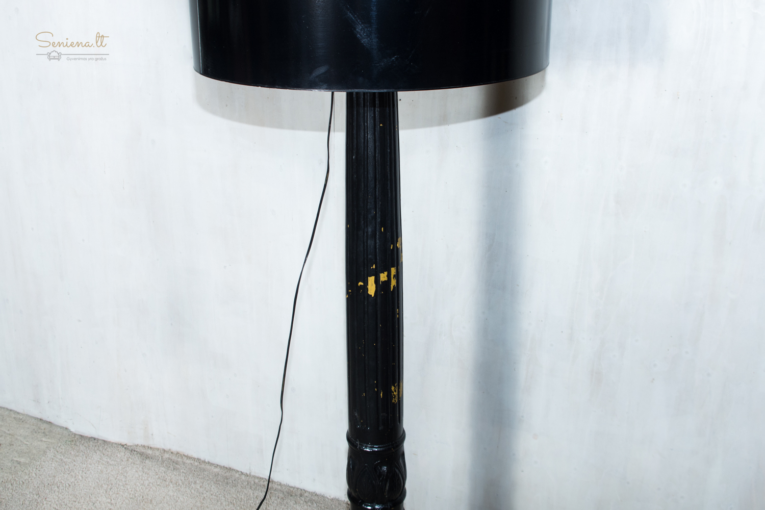 Juodas aukštas pastatomas šviestuvas, stovas pagamintas iš rąsto, kuris įsistato į metalinį laikiklį. Geros būklės