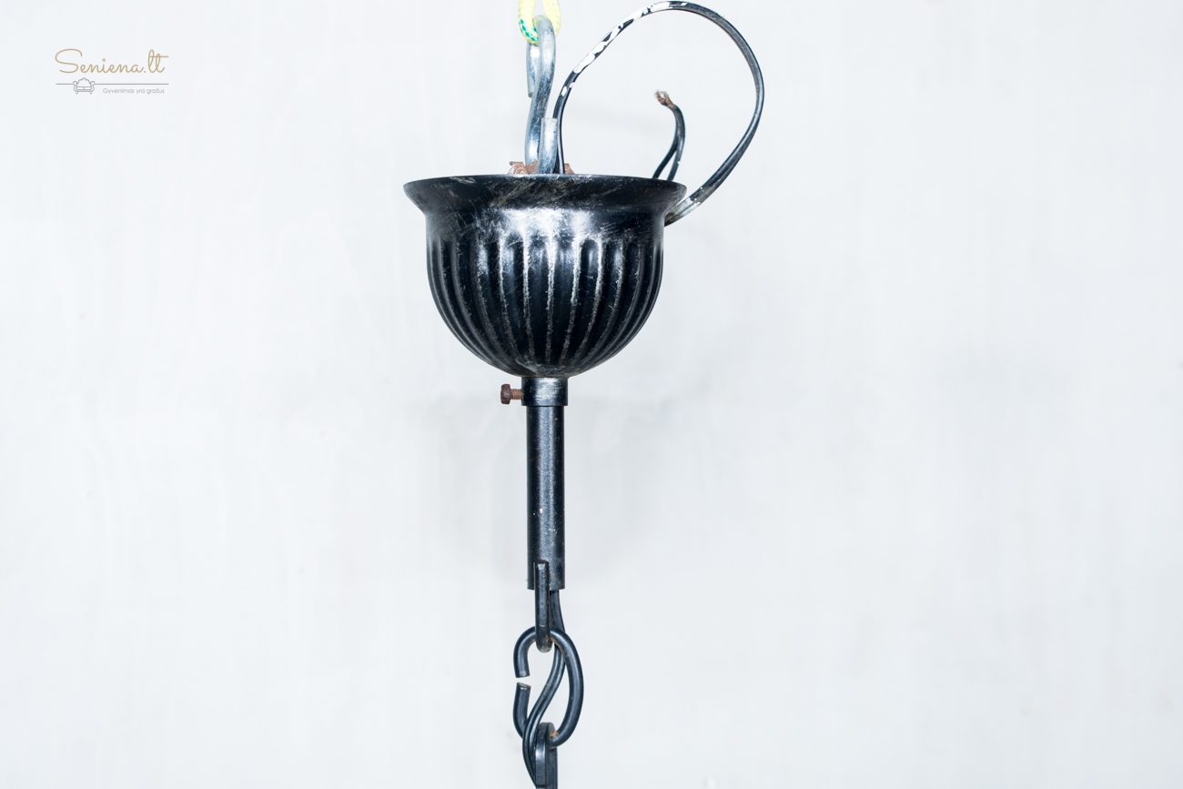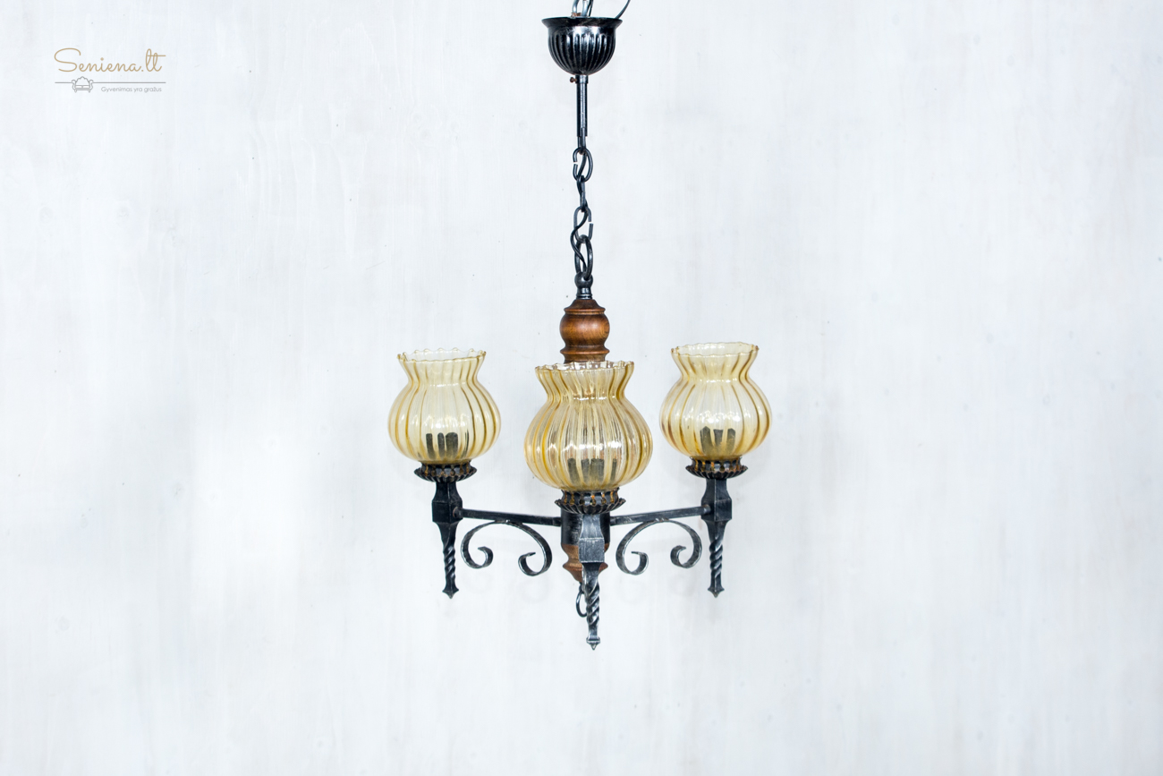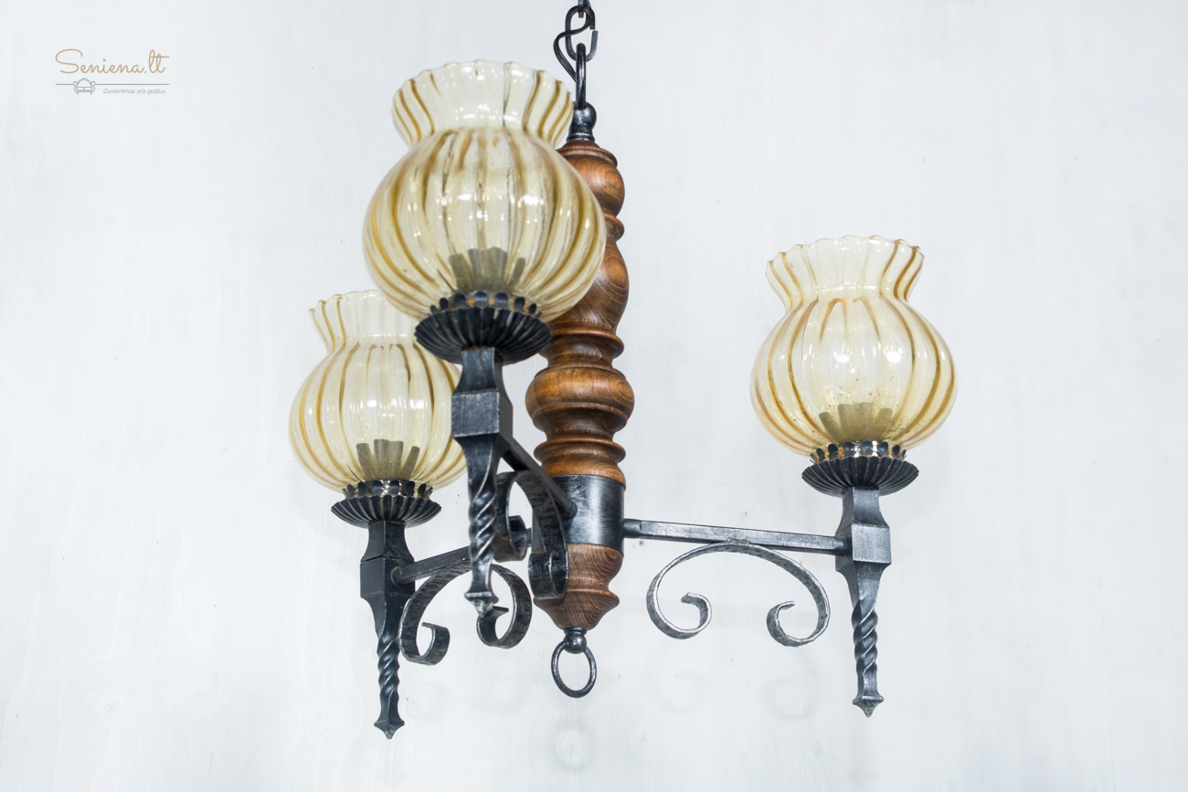 Autentiškas XX a. vidurio šviestuvas, kuriame dera rankų darbo kaltinio metalo ir medžio elementai. Gintaro spalvos stikliniai gaubtai suteikia šilto apšvietimo efektą, o klasikinis dizainas puikiai papildo kaimiško arba “rustic” stiliaus interjerą. Tikėtina, jog šviestuvas pagamintas Prancūzijoje apie 1950–1970 metus. Tvirtos medžiagos ir kokybiškas meistrų darbas užtikrina šio gaminio ilgaamžiškumą bei išskirtinumą. Idealus pasirinkimas ieškantiems charakteringo akcento savo namams
