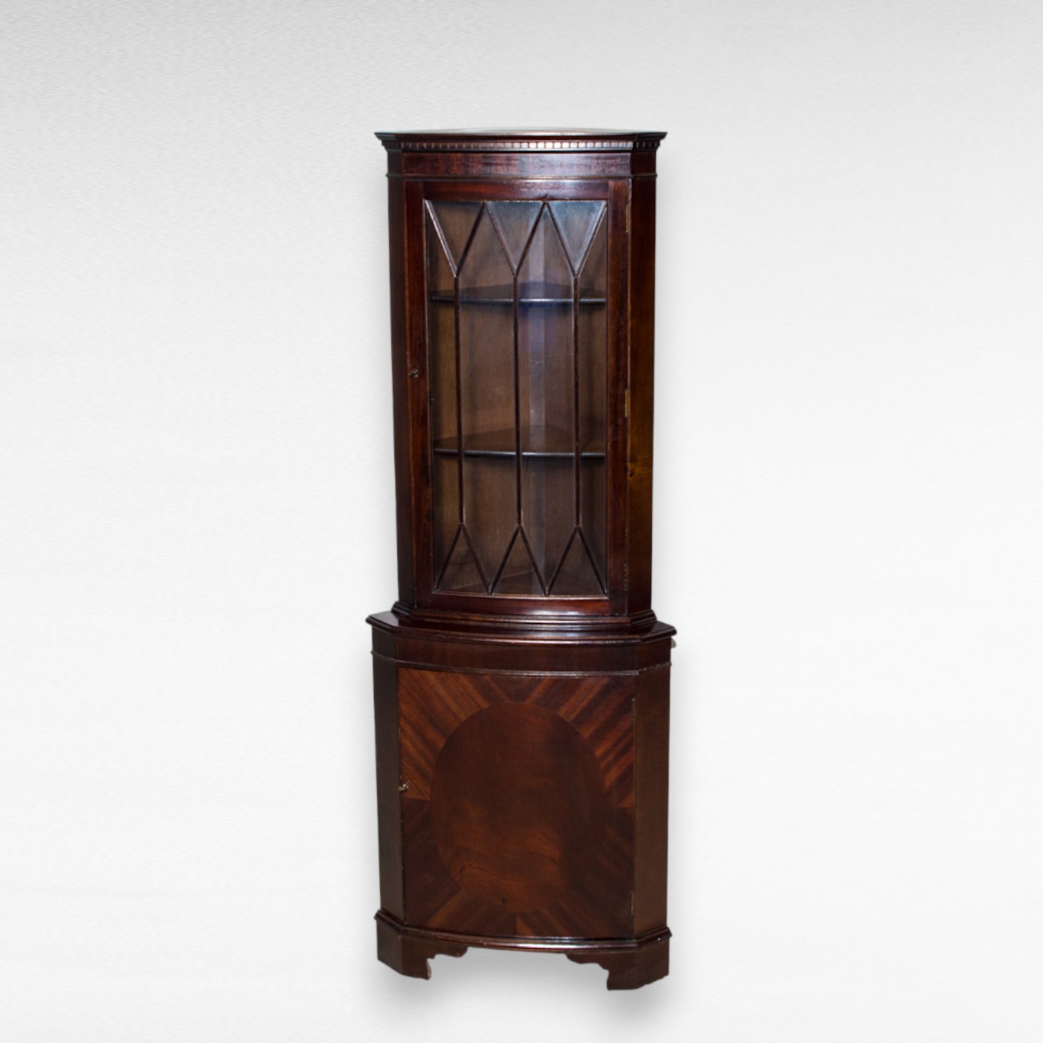 Klasikinio stiliaus kampinė indauja su stikline viršutine dalimi ir uždaru apatiniu skyriumi. Raudonmedžio faneruotės apdaila.