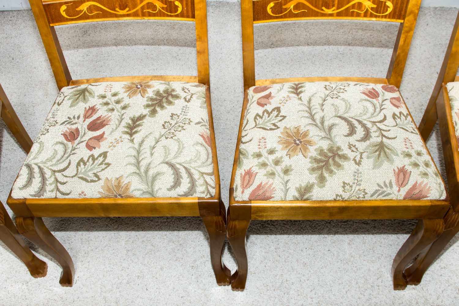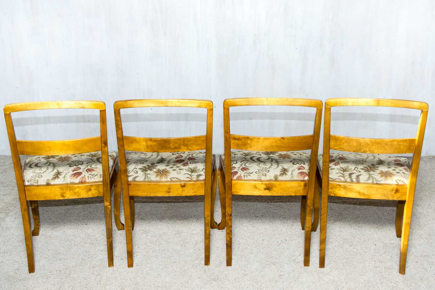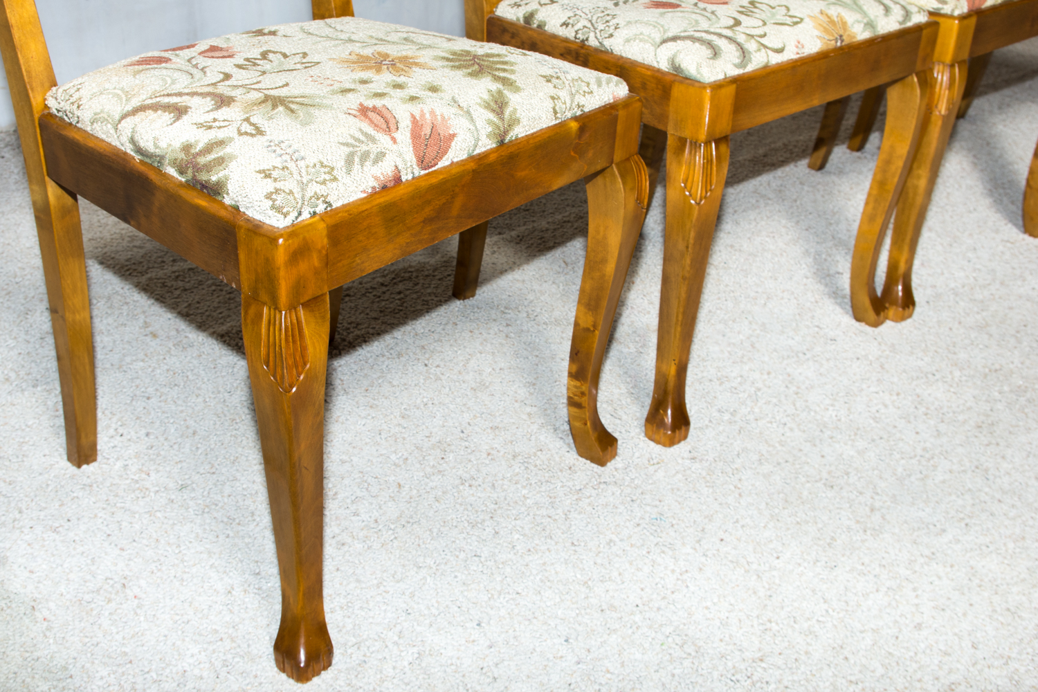 Kėdės su dekoruotu atlošu. Tvirtos, stilingos kėdės su lenktomis kojomis ir raštuotu gobelenu. Būklė labai gera – mediena blizgi, apmušalai tvarkingi.