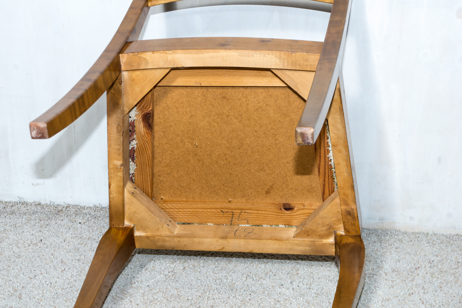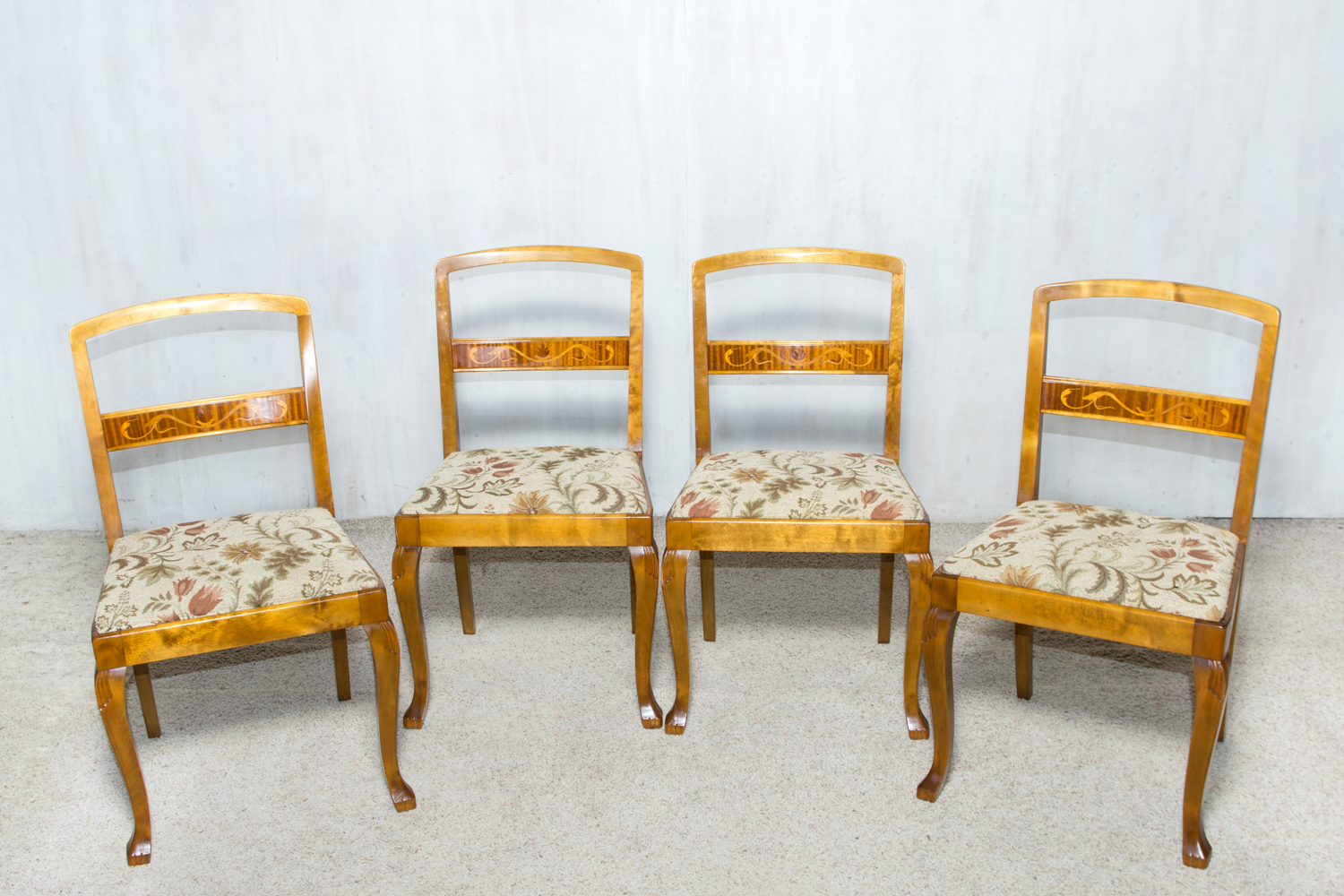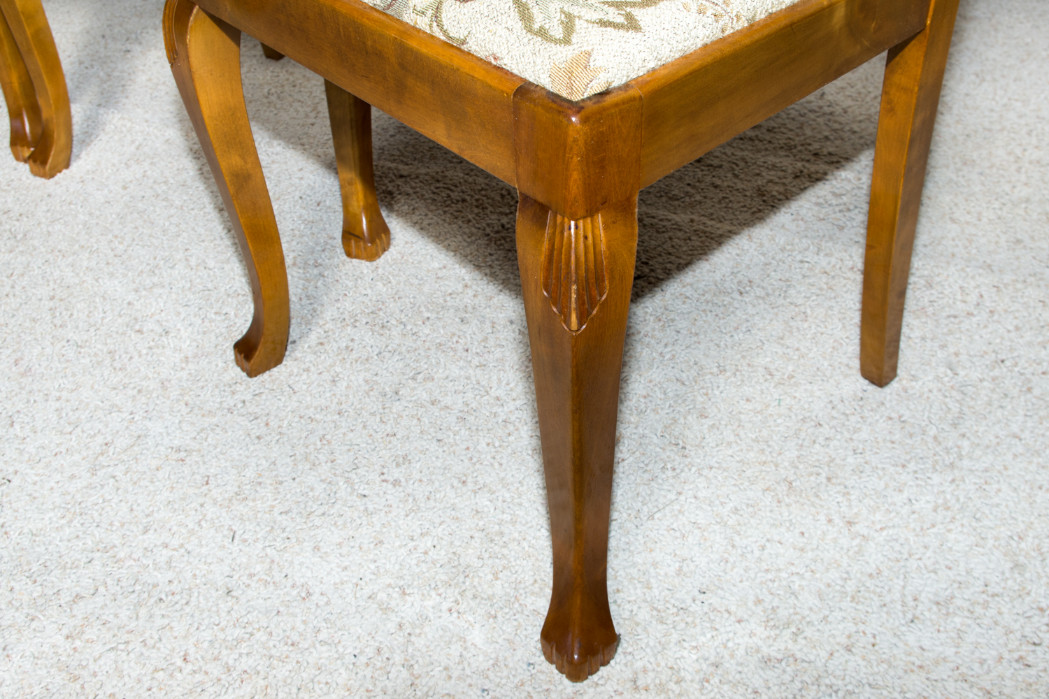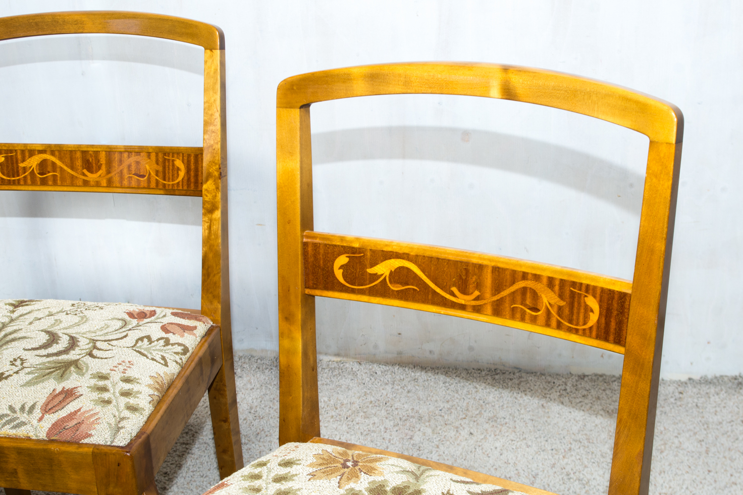 Kėdės su dekoruotu atlošu. Tvirtos, stilingos kėdės su lenktomis kojomis ir raštuotu gobelenu. Būklė labai gera – mediena blizgi, apmušalai tvarkingi.