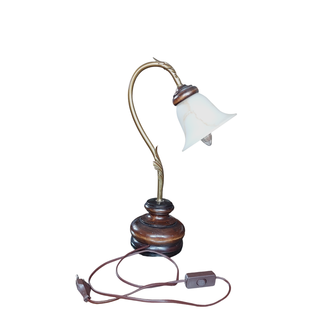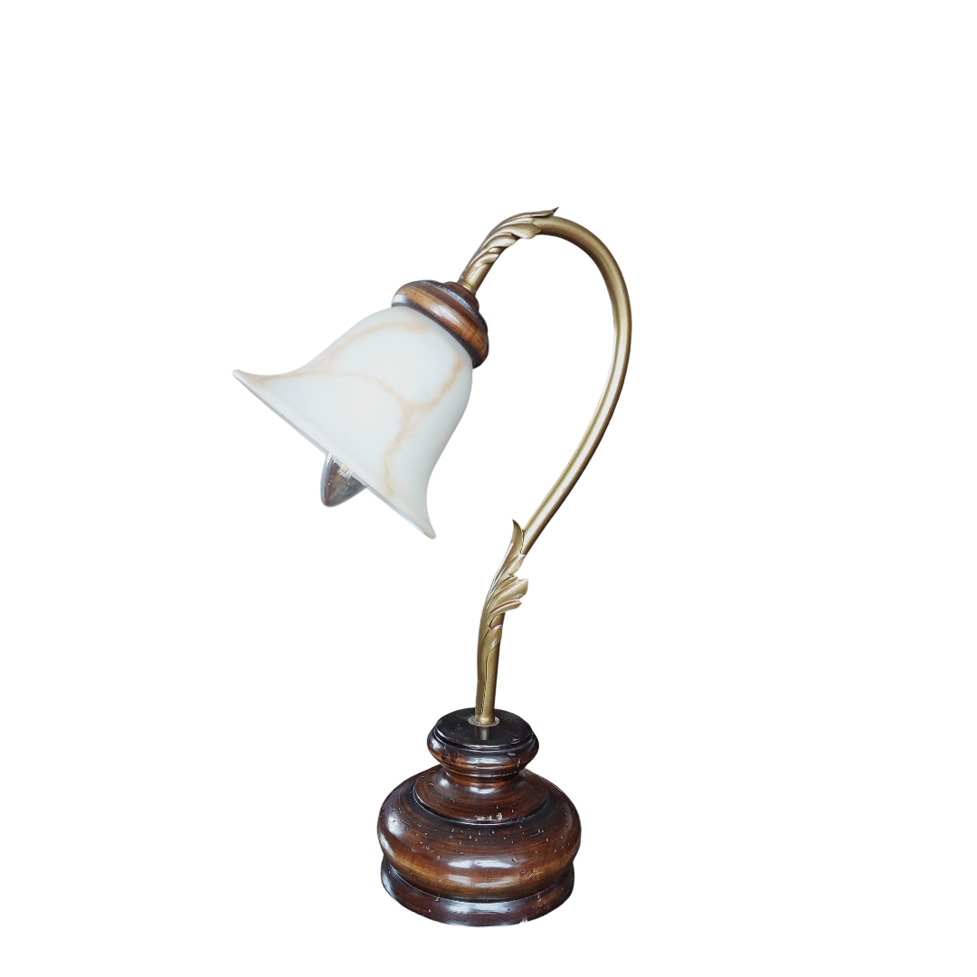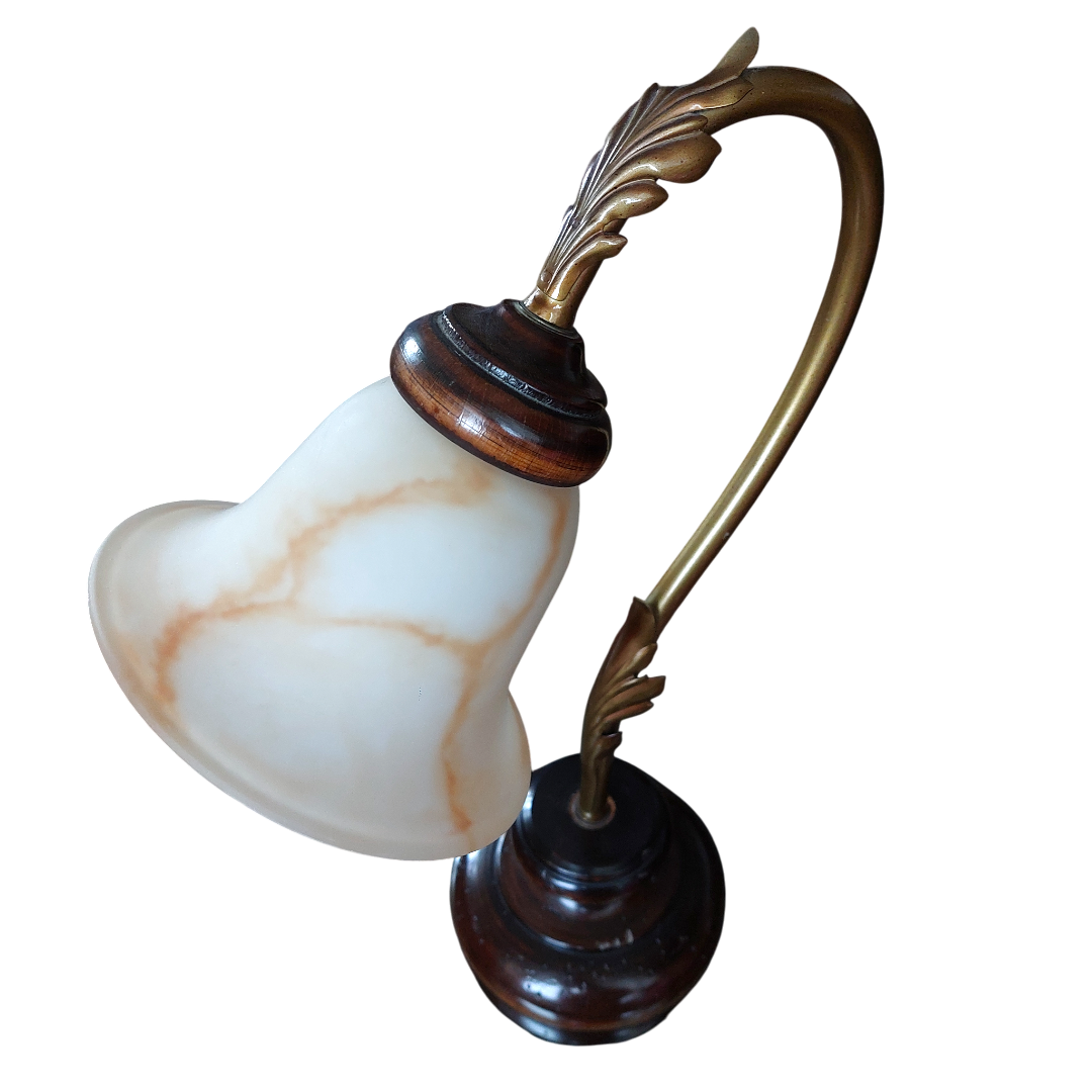 Klasikinio stiliaus stalinė lempa iš XX a. antros pusės. Medinis, tekinimo būdu formuotas pagrindas, žalvario spalvos lenktas kaklelis ir matinio stiklo gaubtas su švelniu marmuro raštu. Lempa veikianti, geros būklės. Parvežta iš Prancūzijos.