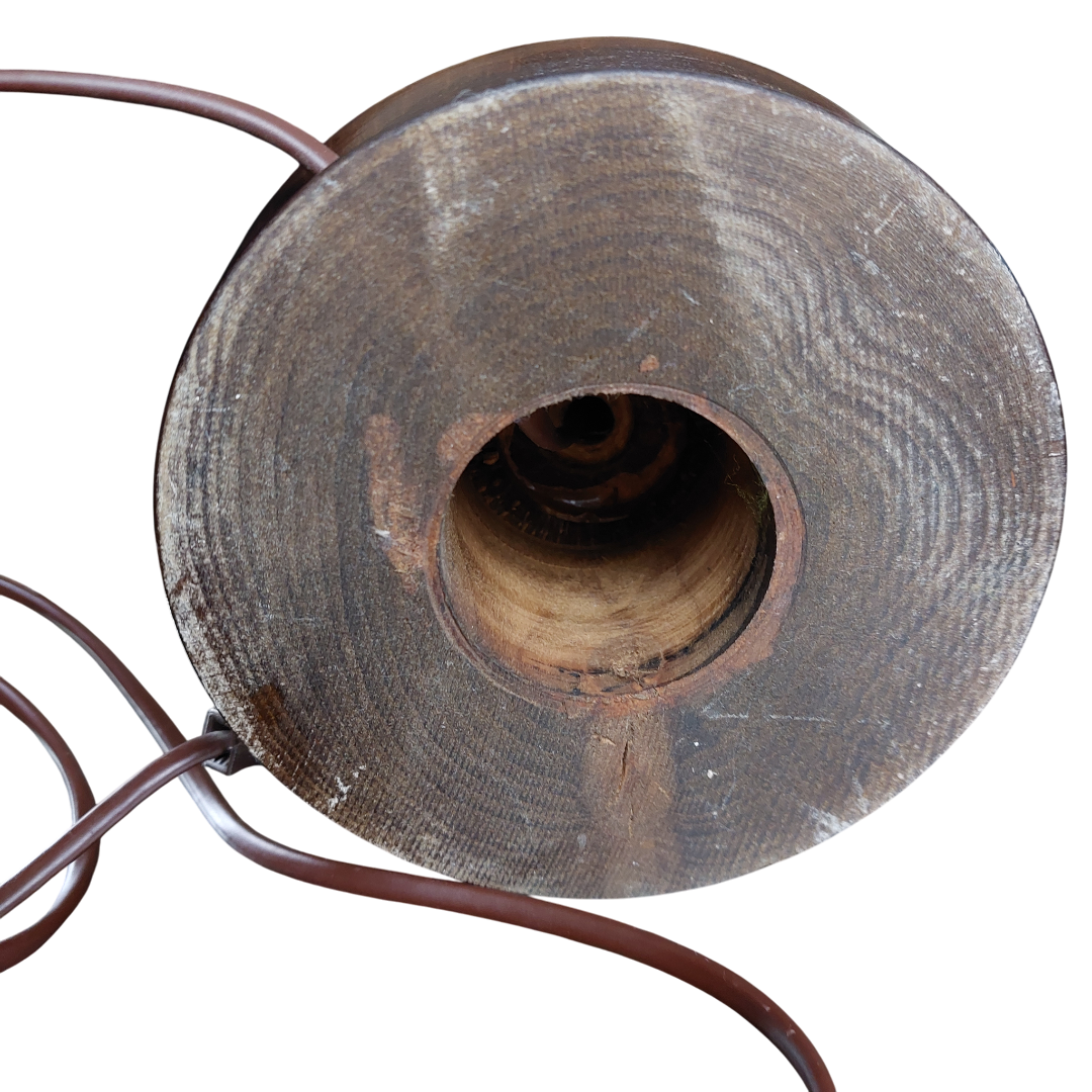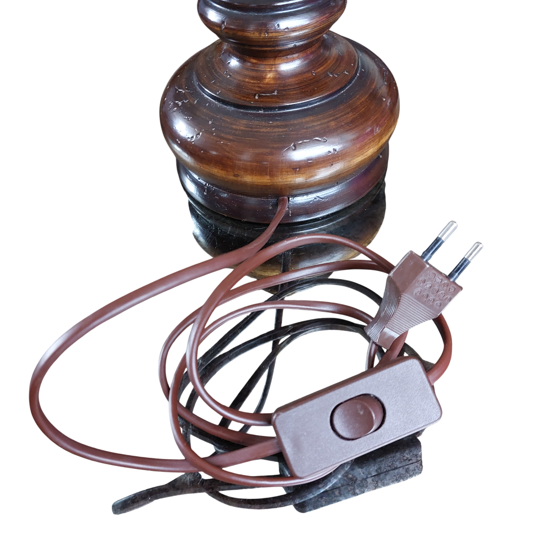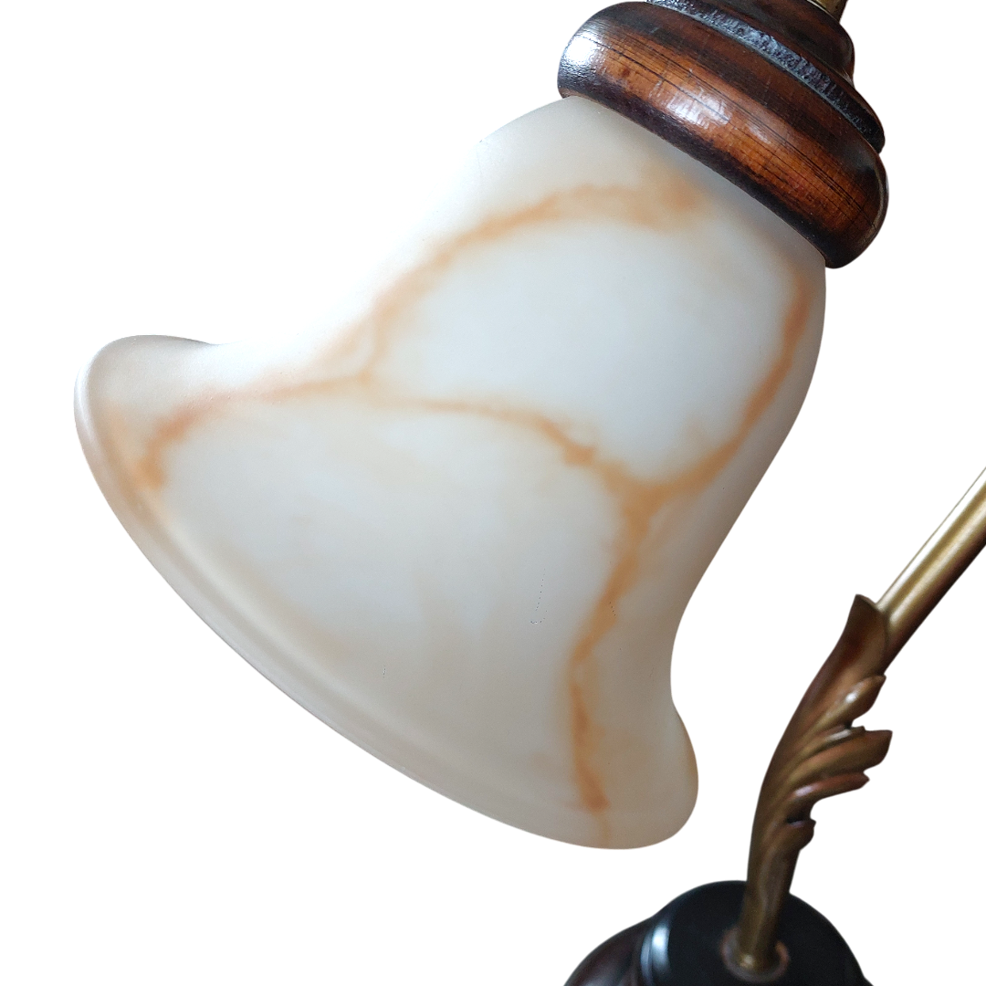 Klasikinio stiliaus stalinė lempa iš XX a. antros pusės. Medinis, tekinimo būdu formuotas pagrindas, žalvario spalvos lenktas kaklelis ir matinio stiklo gaubtas su švelniu marmuro raštu. Lempa veikianti, geros būklės. Parvežta iš Prancūzijos.