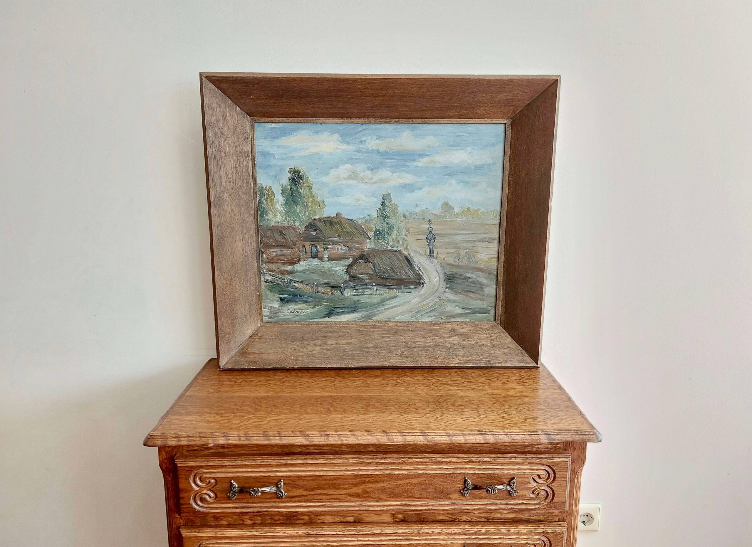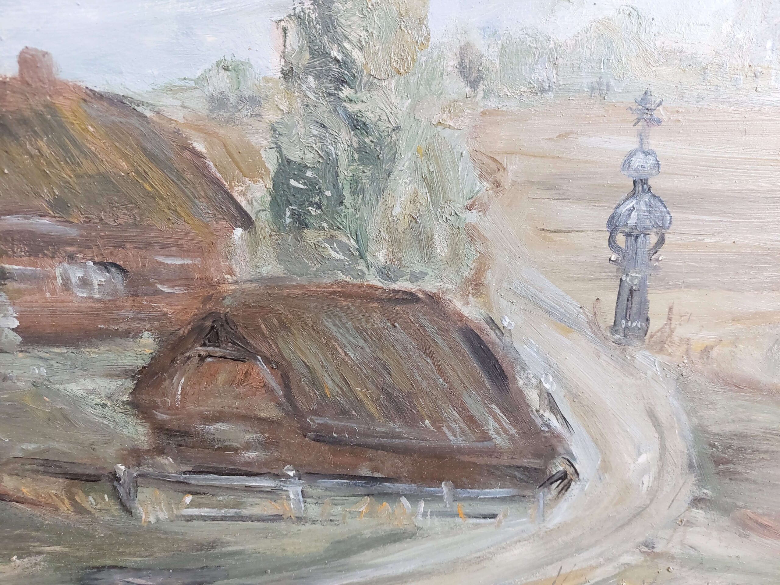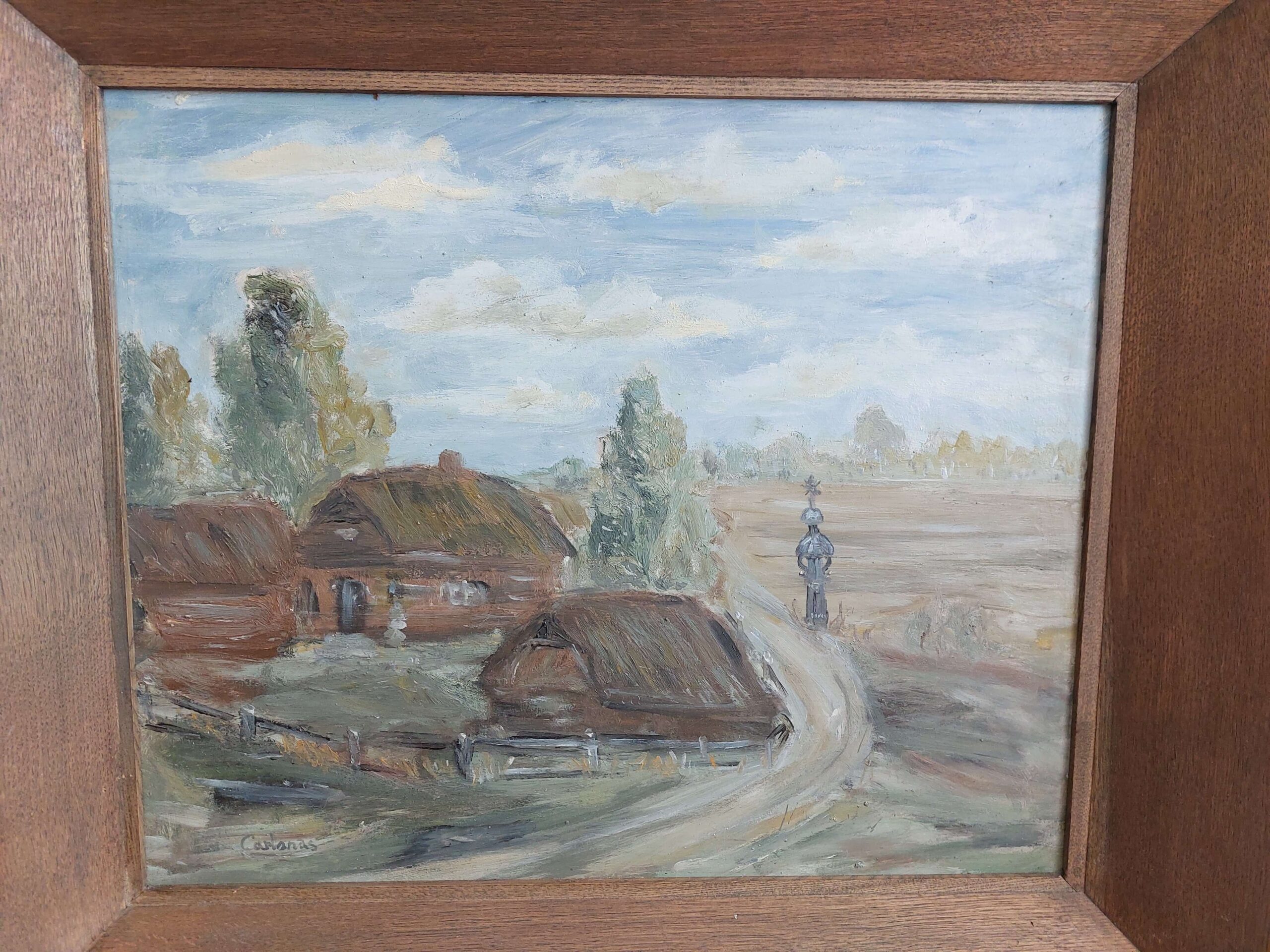 Aliejinis paveikslas su lietuviško kaimo peizažu – sodybos, kelias ir stogastulpis. P. Karlono darbas, XX a. vidurys. Tapyba ant faneros, su mediniu rėmu.