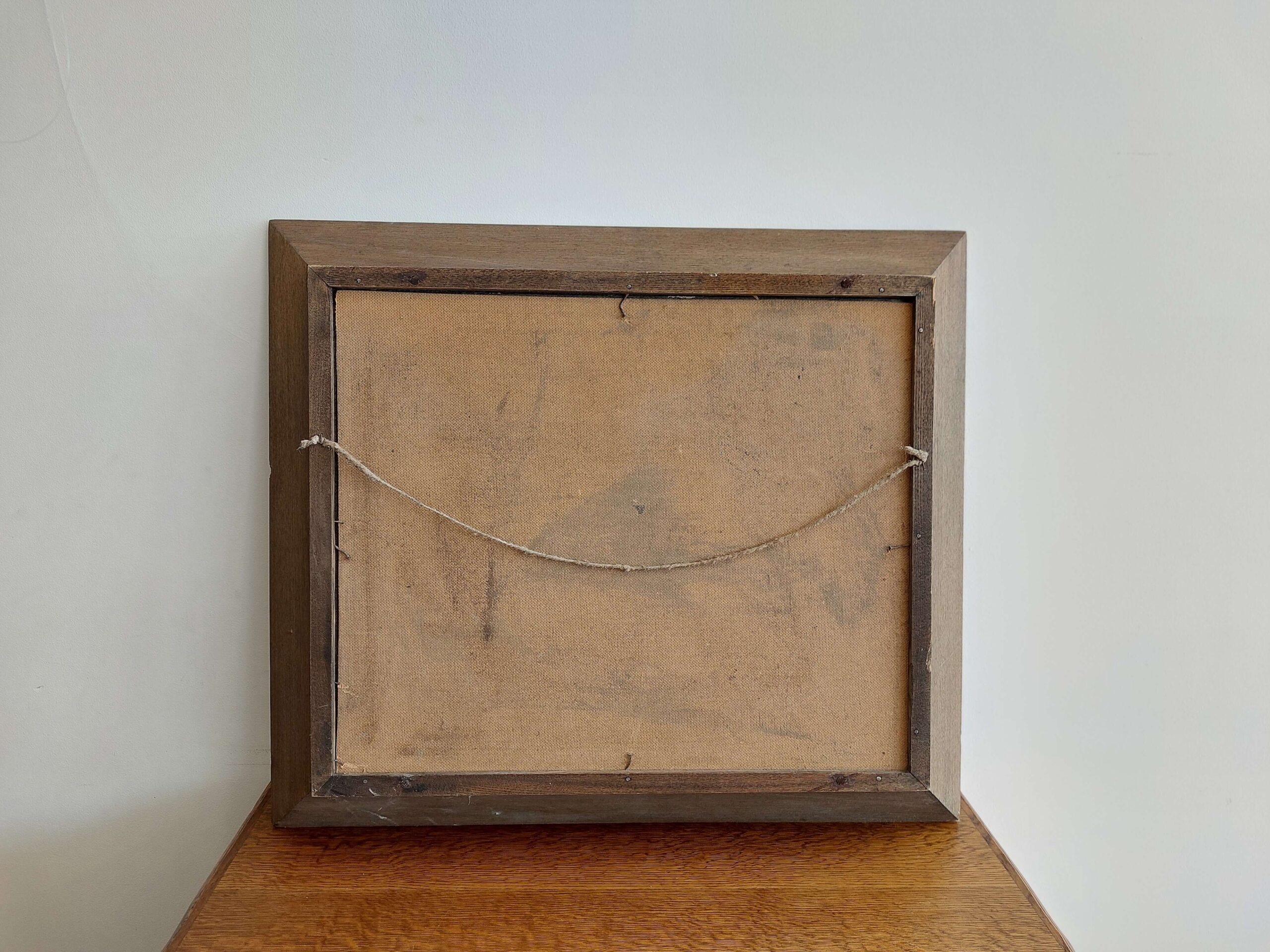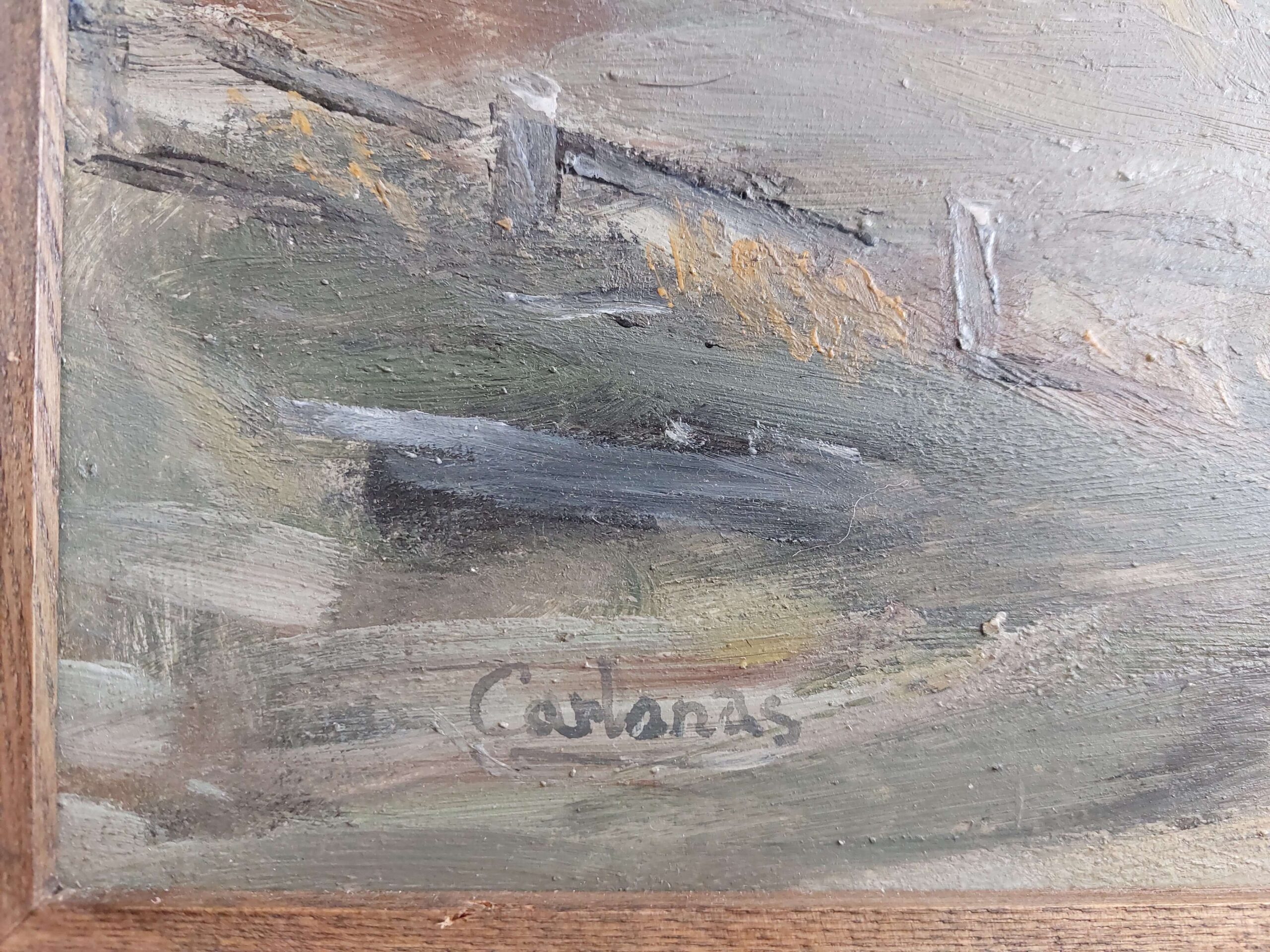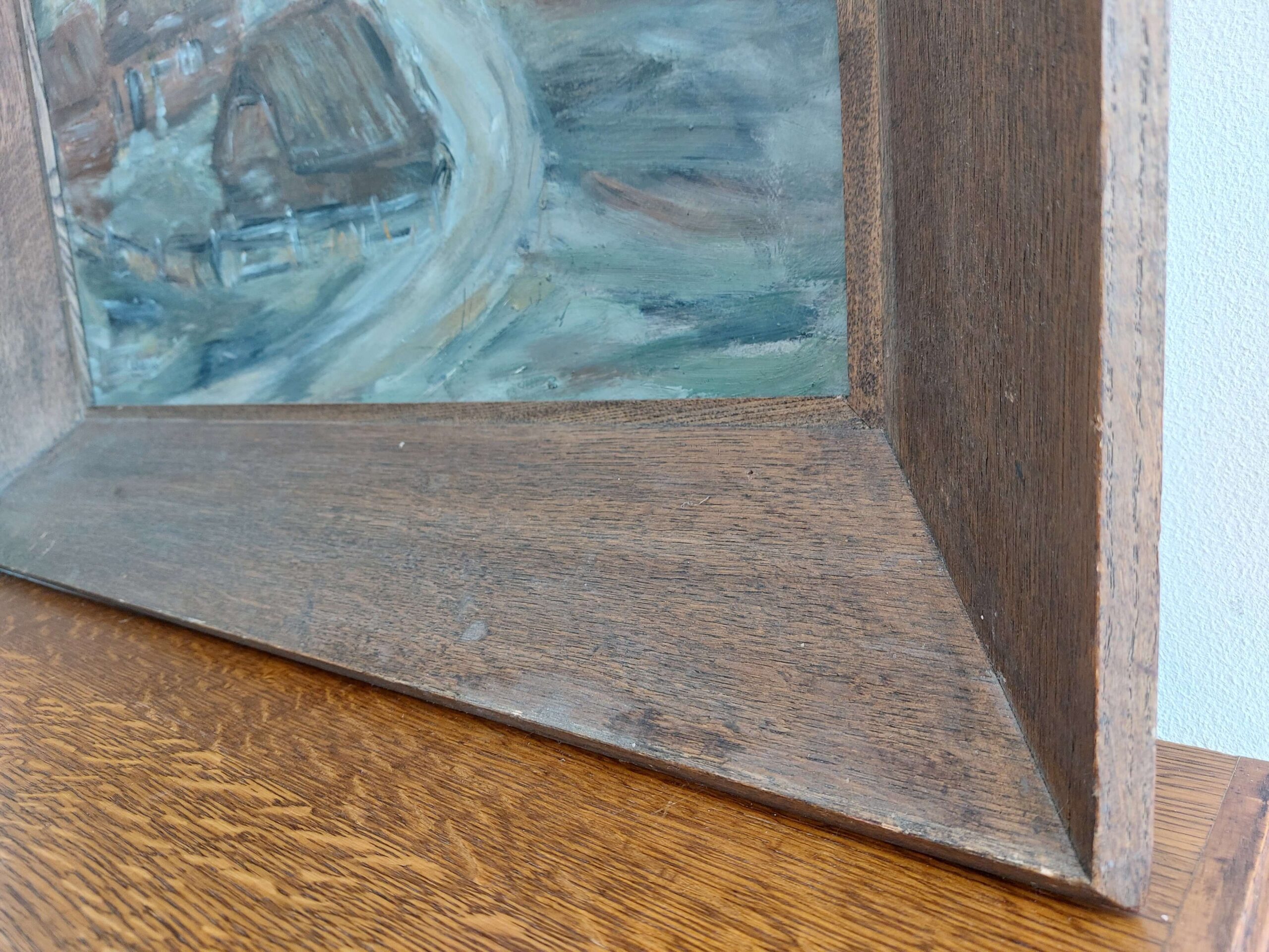 Aliejinis paveikslas su lietuviško kaimo peizažu – sodybos, kelias ir stogastulpis. P. Karlono darbas, XX a. vidurys. Tapyba ant faneros, su mediniu rėmu.