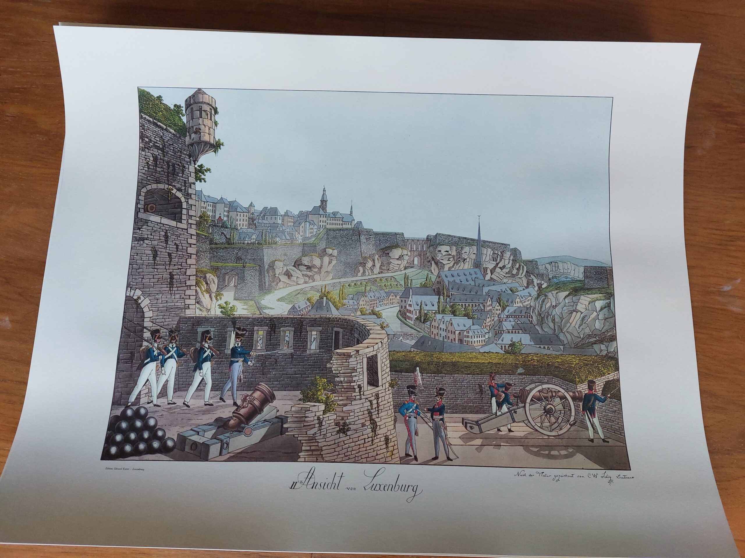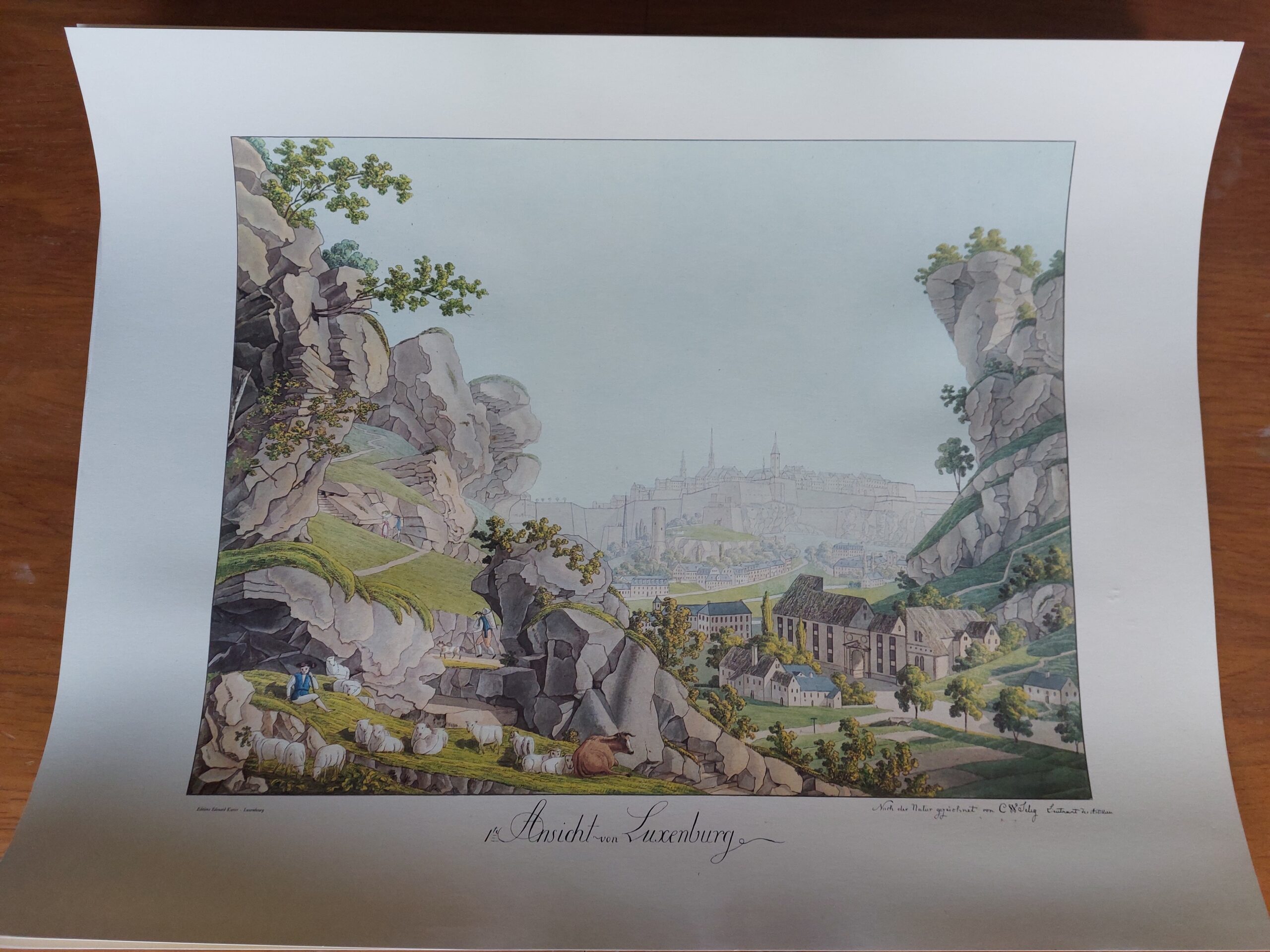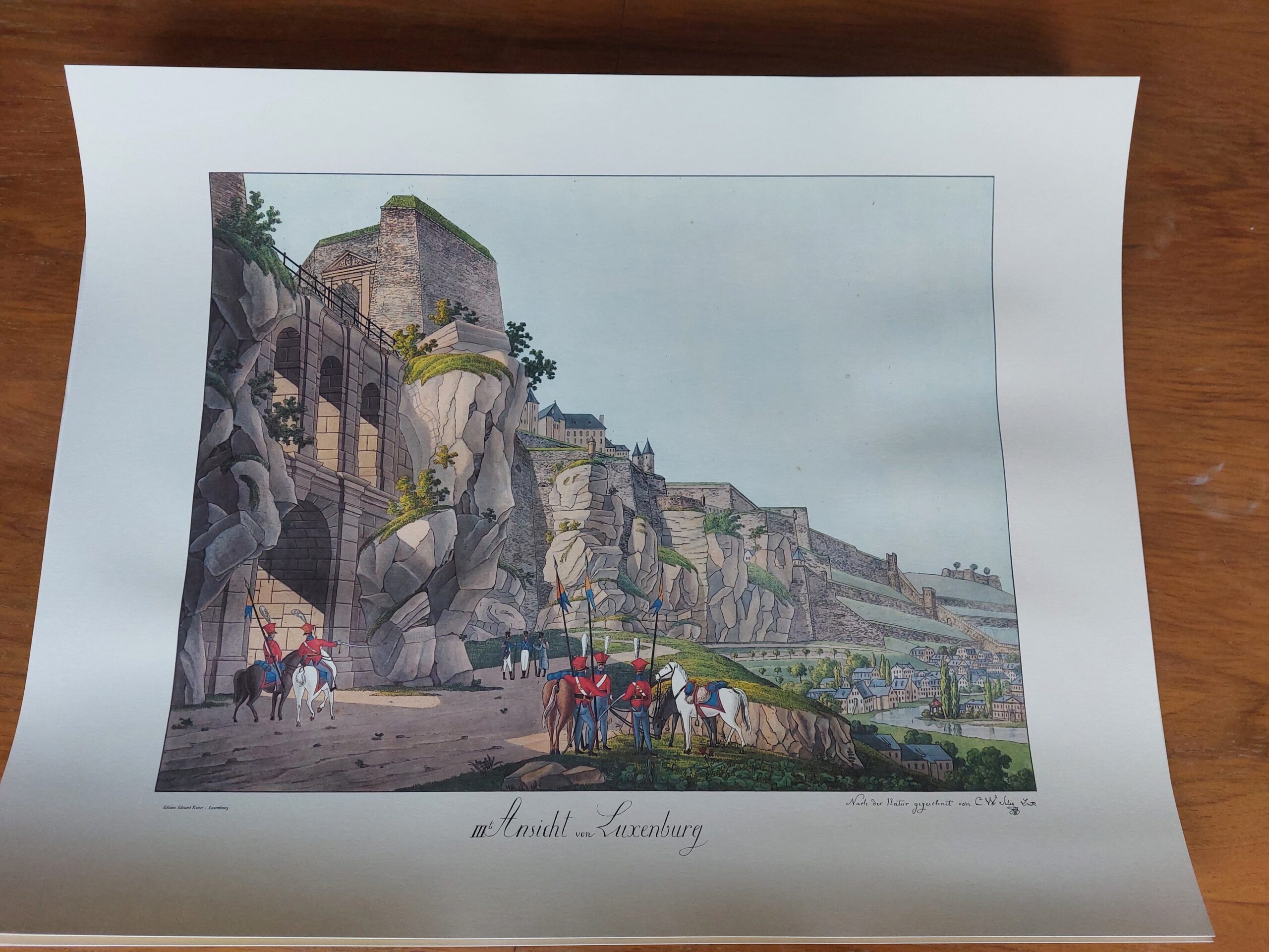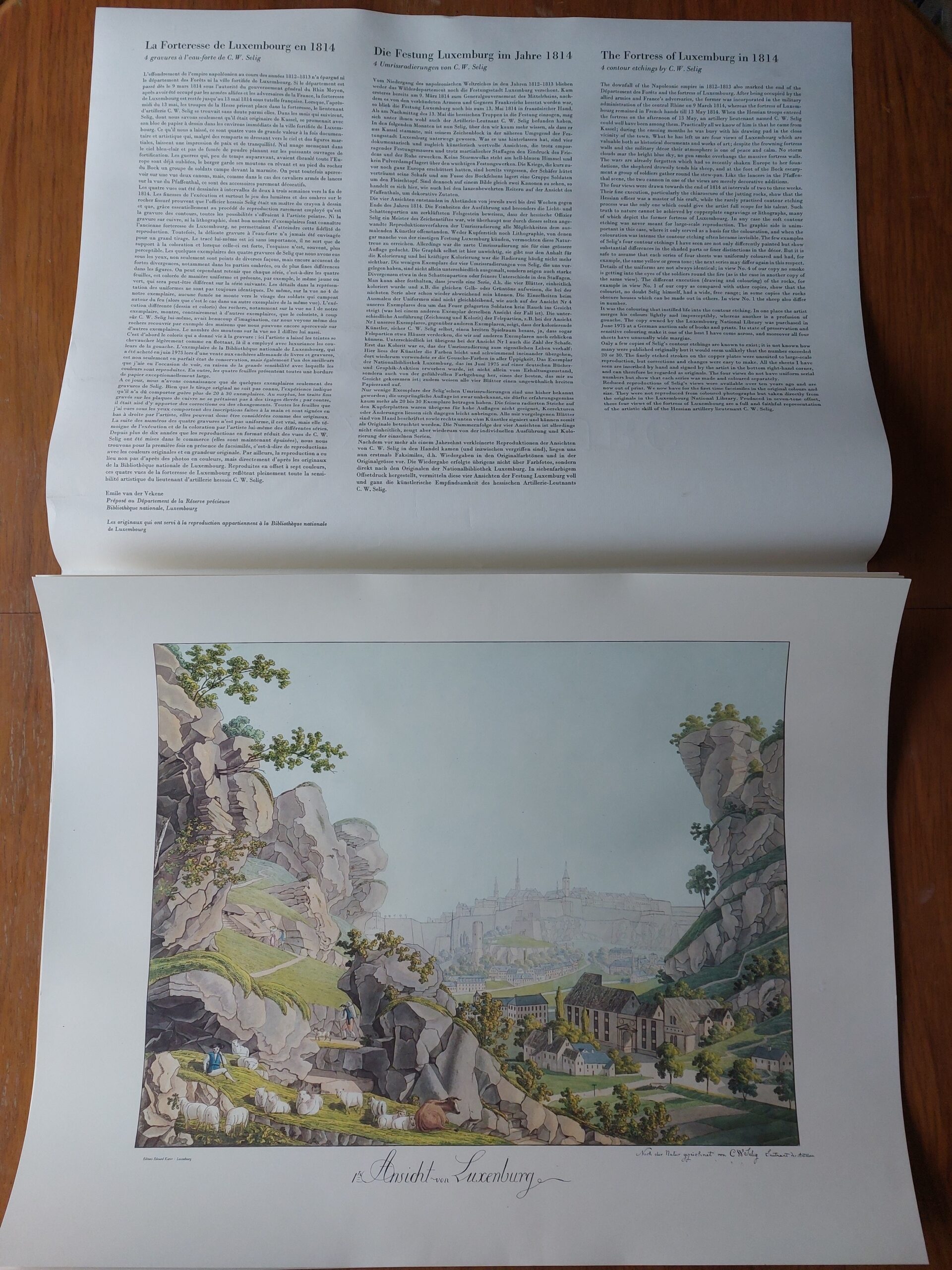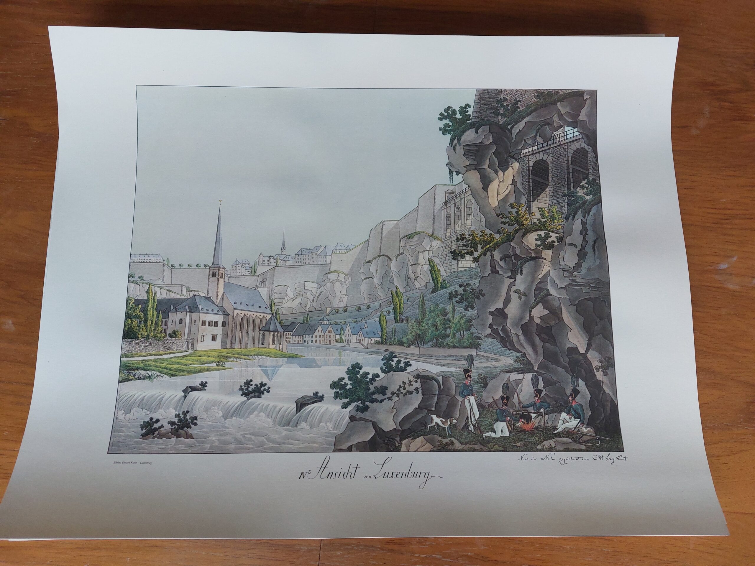Gravures vue de Luxembourg, 4 x C.W. Selig 1814. Tai aukštos kokybės menininko C.W. Selig Liuksemburgo graviūros spaudiniai. Eduardo Katerio leidimo. Laikomas originalioje tūboje su spaudinių istorija prancūzų, vokiečių ir anglų kalbomis.
