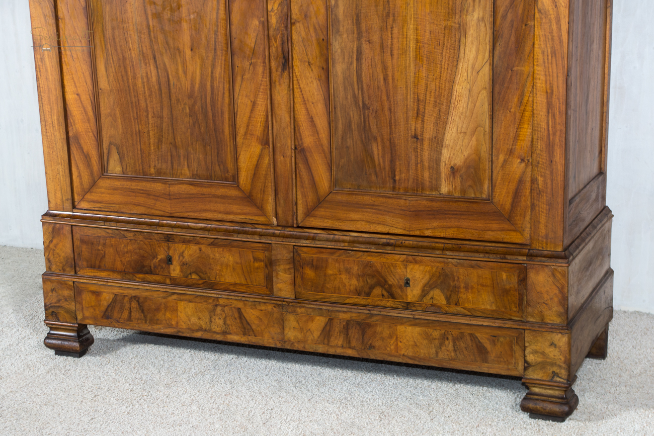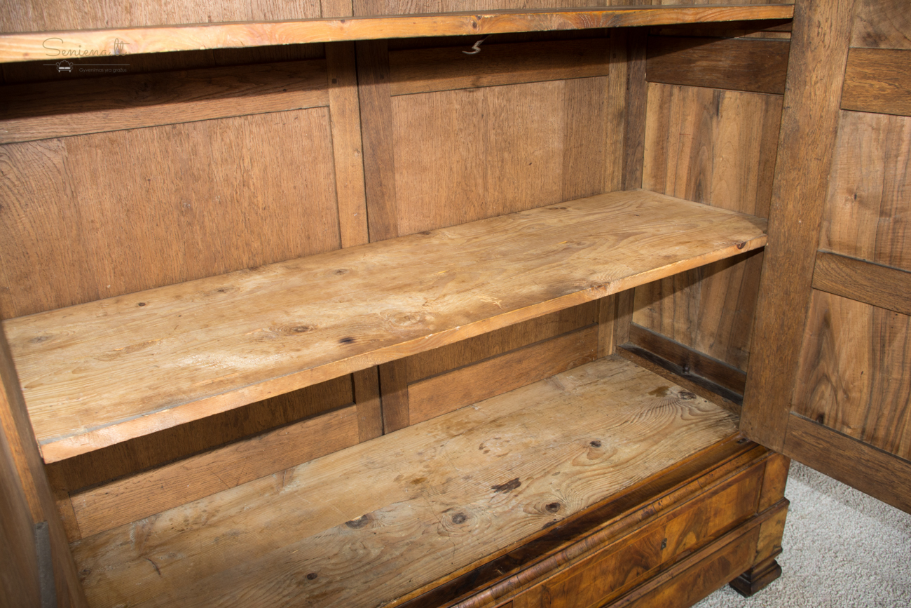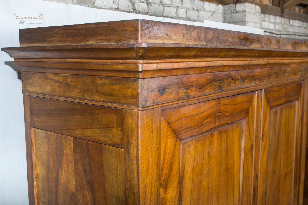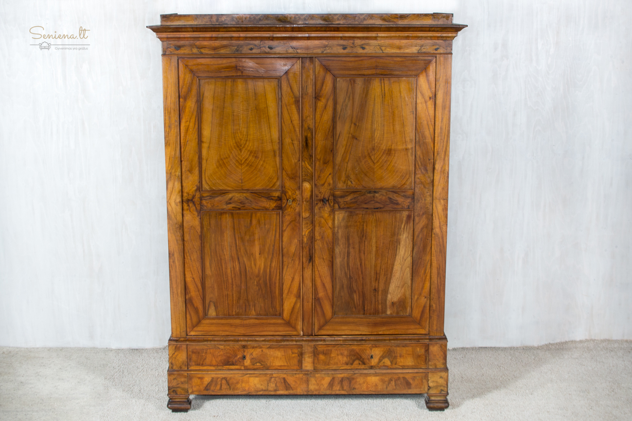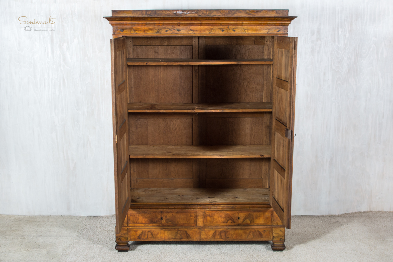 Prancūziška Louis-Philippe stiliaus spinta, XIX a. Riešutmedis, ryškaus rašto faneruotė. Viršuje – masyvus karnizas, apačioje – du stalčiai. Viduje – trys lentynos. Originali veikianti spyna su raktu. Baldo konstrukcija tvirta, išlaikiusi autentiškus bruožus. Spinta išsiardo transportavimui. Parvežta iš Prancūzijos