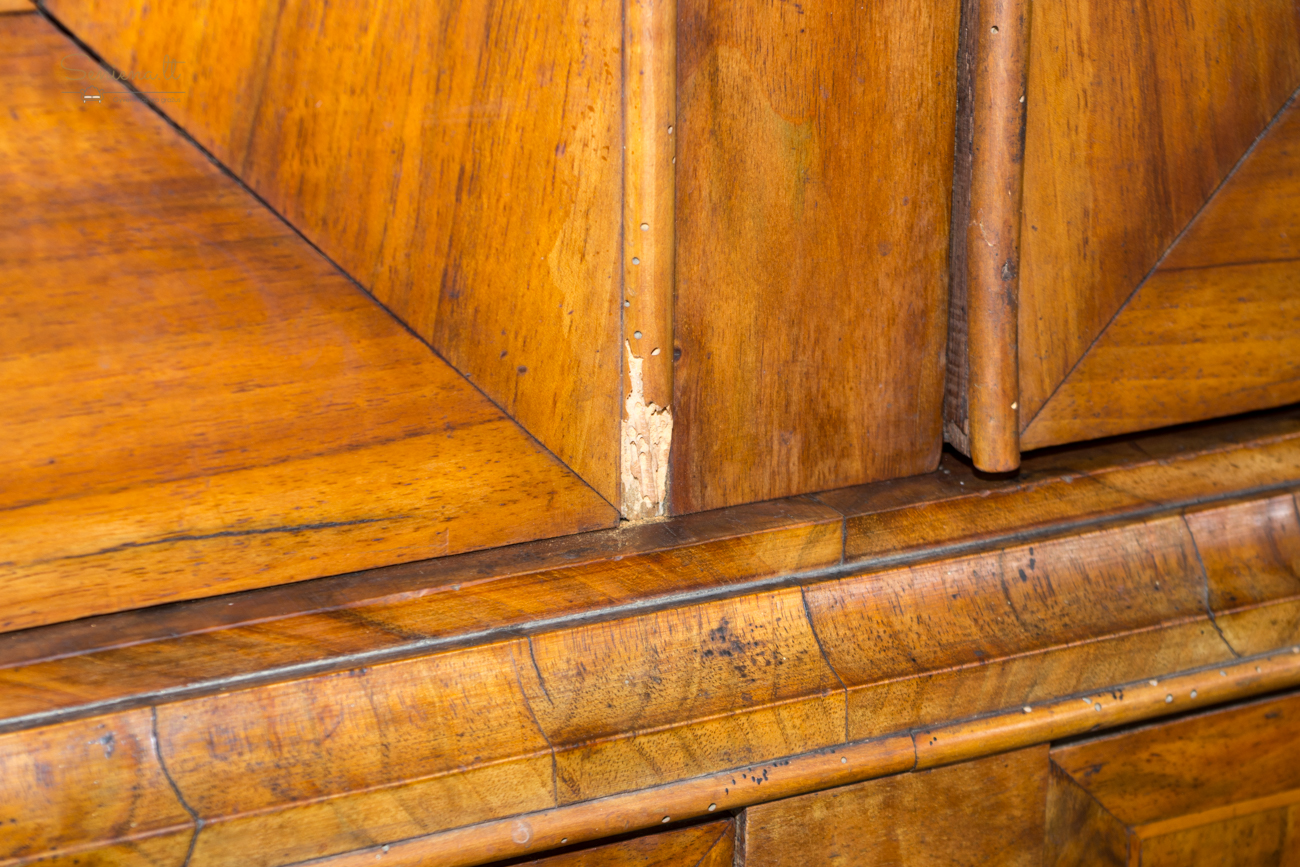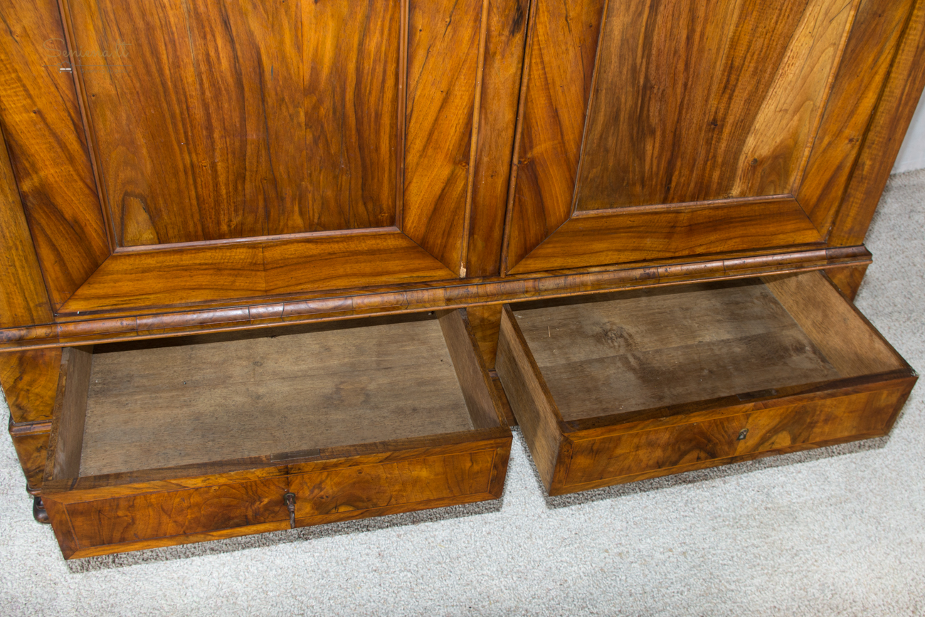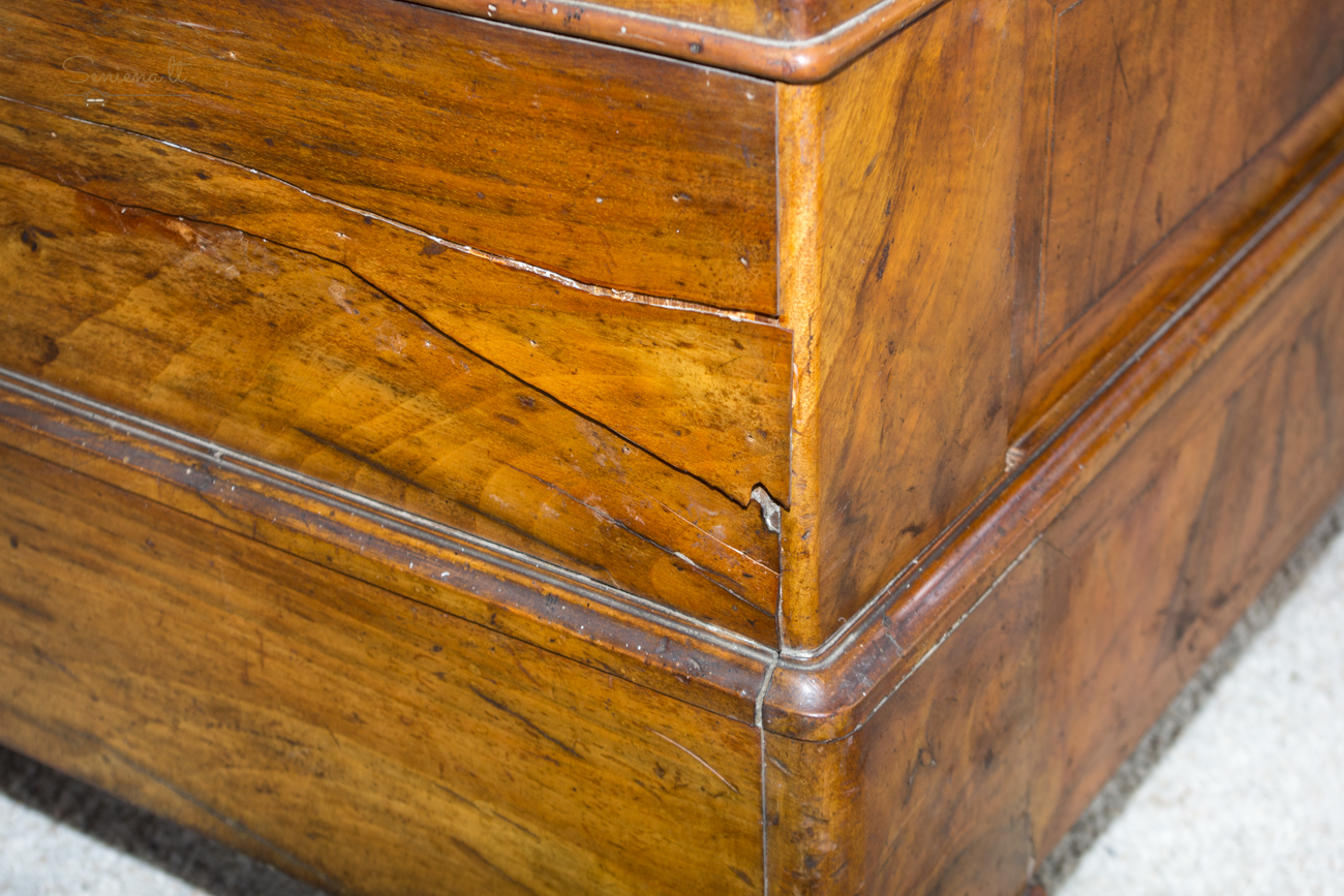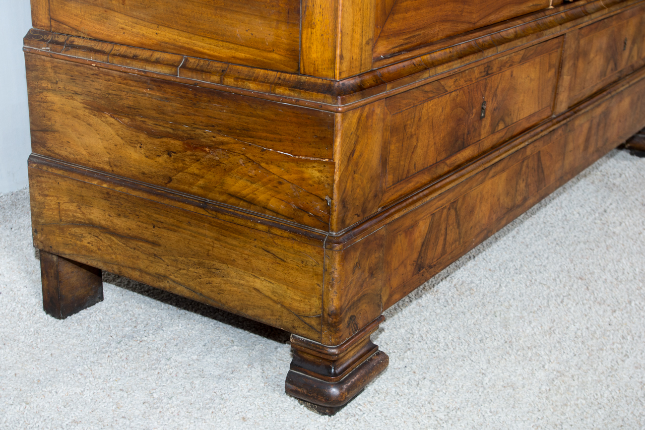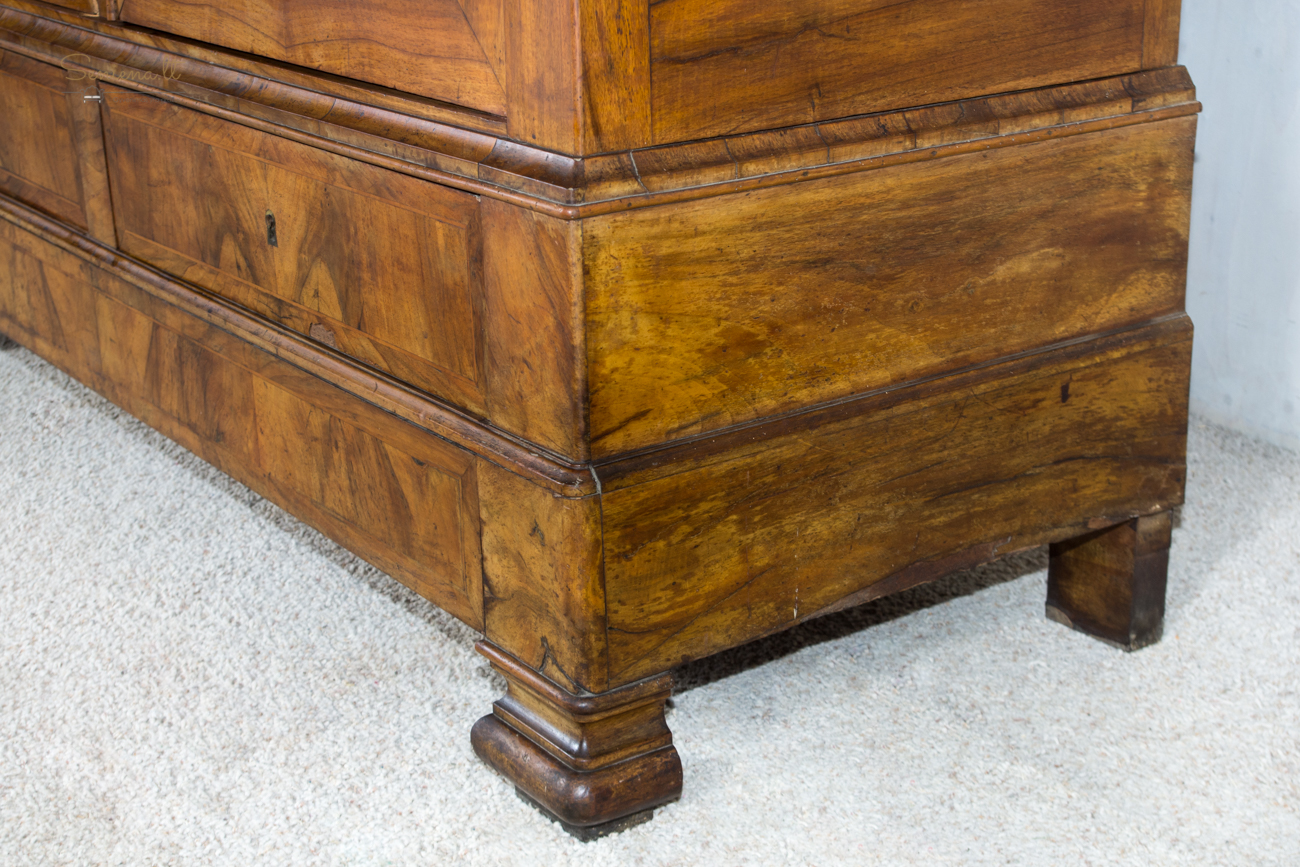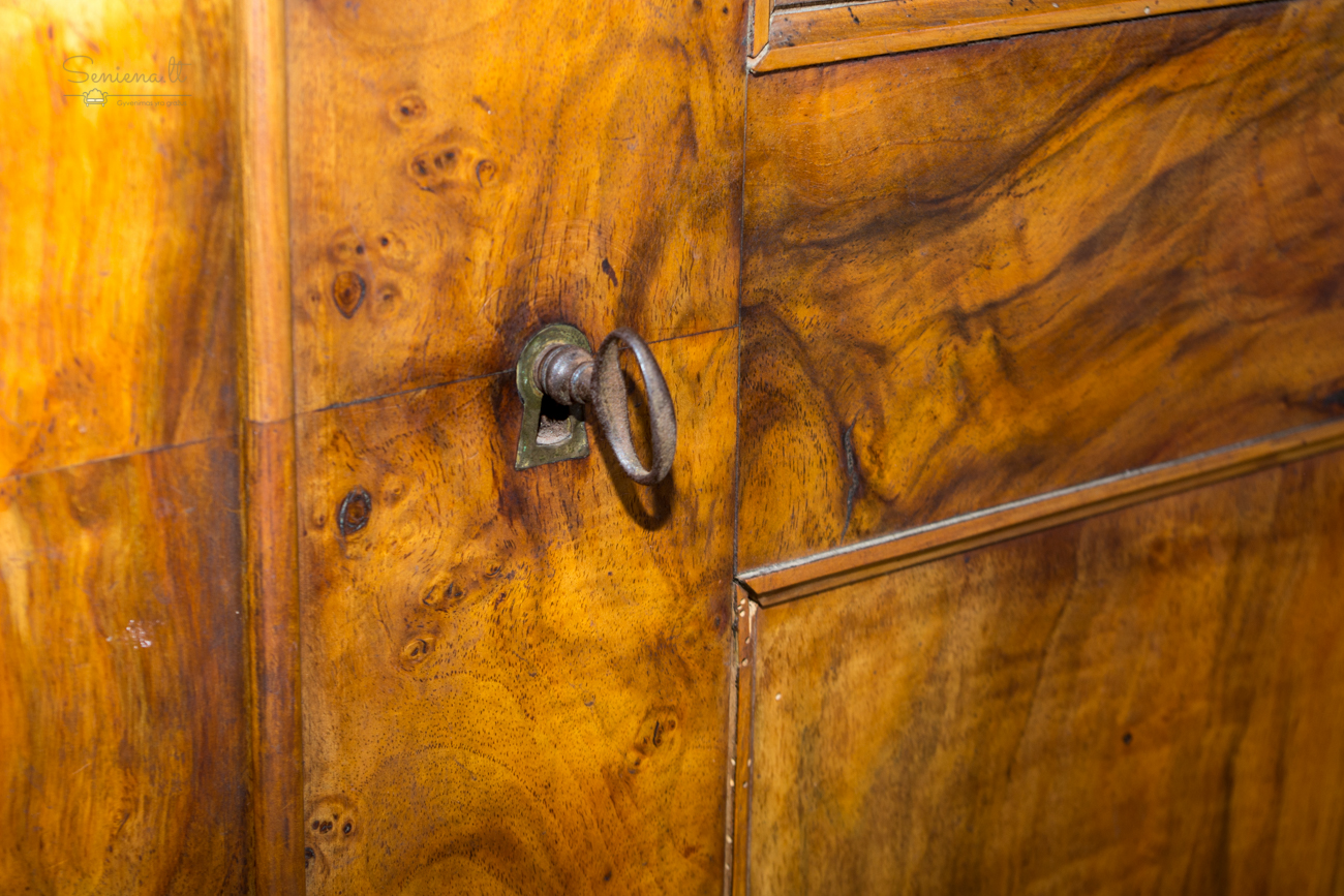 Prancūziška Louis-Philippe stiliaus spinta, XIX a. Riešutmedis, ryškaus rašto faneruotė. Viršuje – masyvus karnizas, apačioje – du stalčiai. Viduje – trys lentynos. Originali veikianti spyna su raktu. Baldo konstrukcija tvirta, išlaikiusi autentiškus bruožus. Spinta išsiardo transportavimui. Parvežta iš Prancūzijos