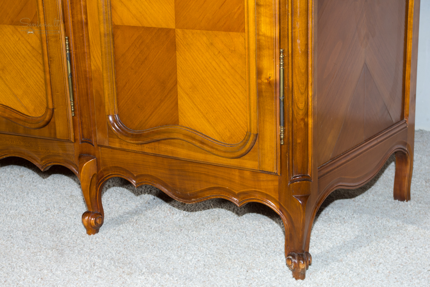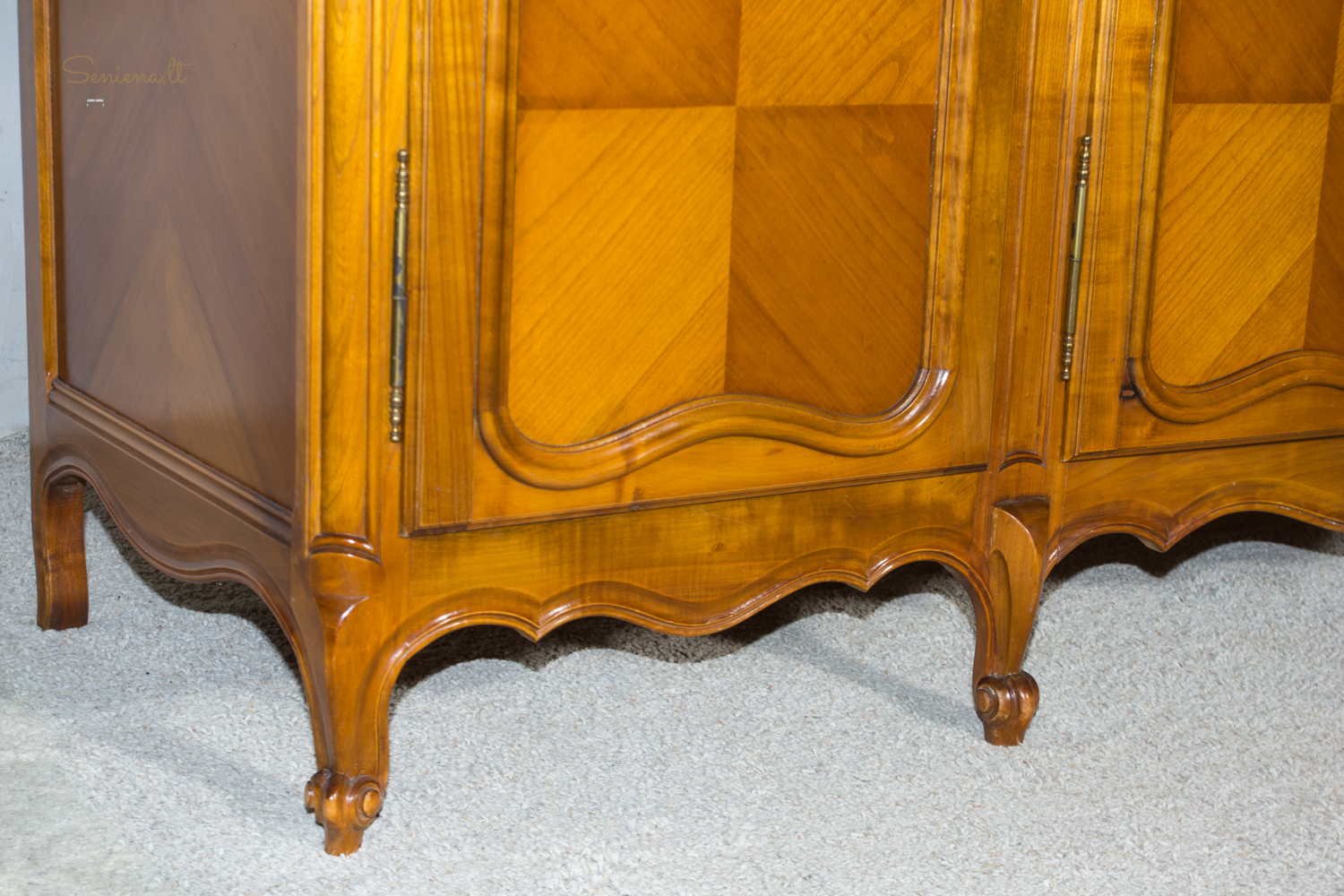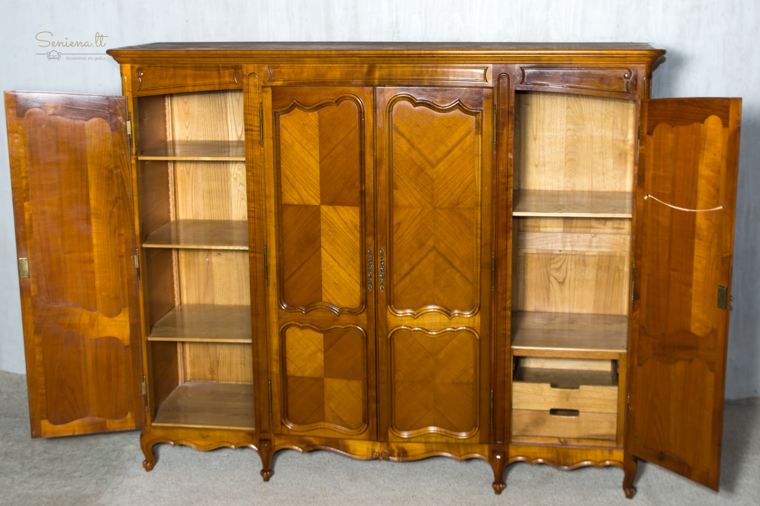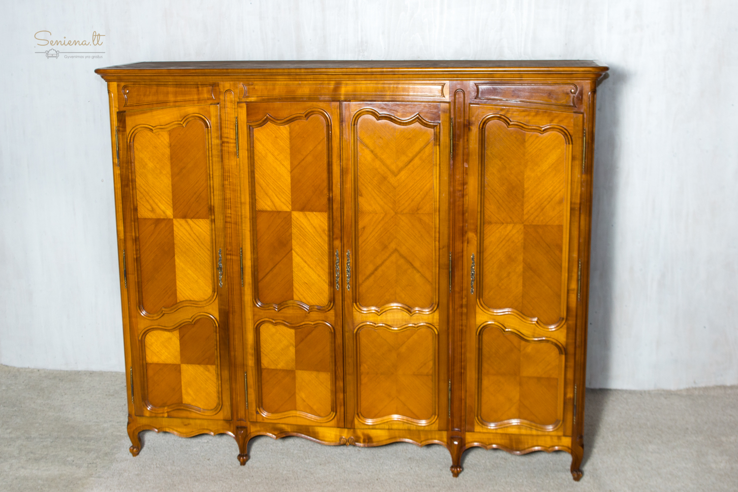 Liudviko XV stiliaus rūbų spinta, 4 durų. Geros būklės. Yra vienas raktelis, kuris rakina tik kraštines duris, trūksta vieno stalčiaus. Parvežta iš Prancūzijos
