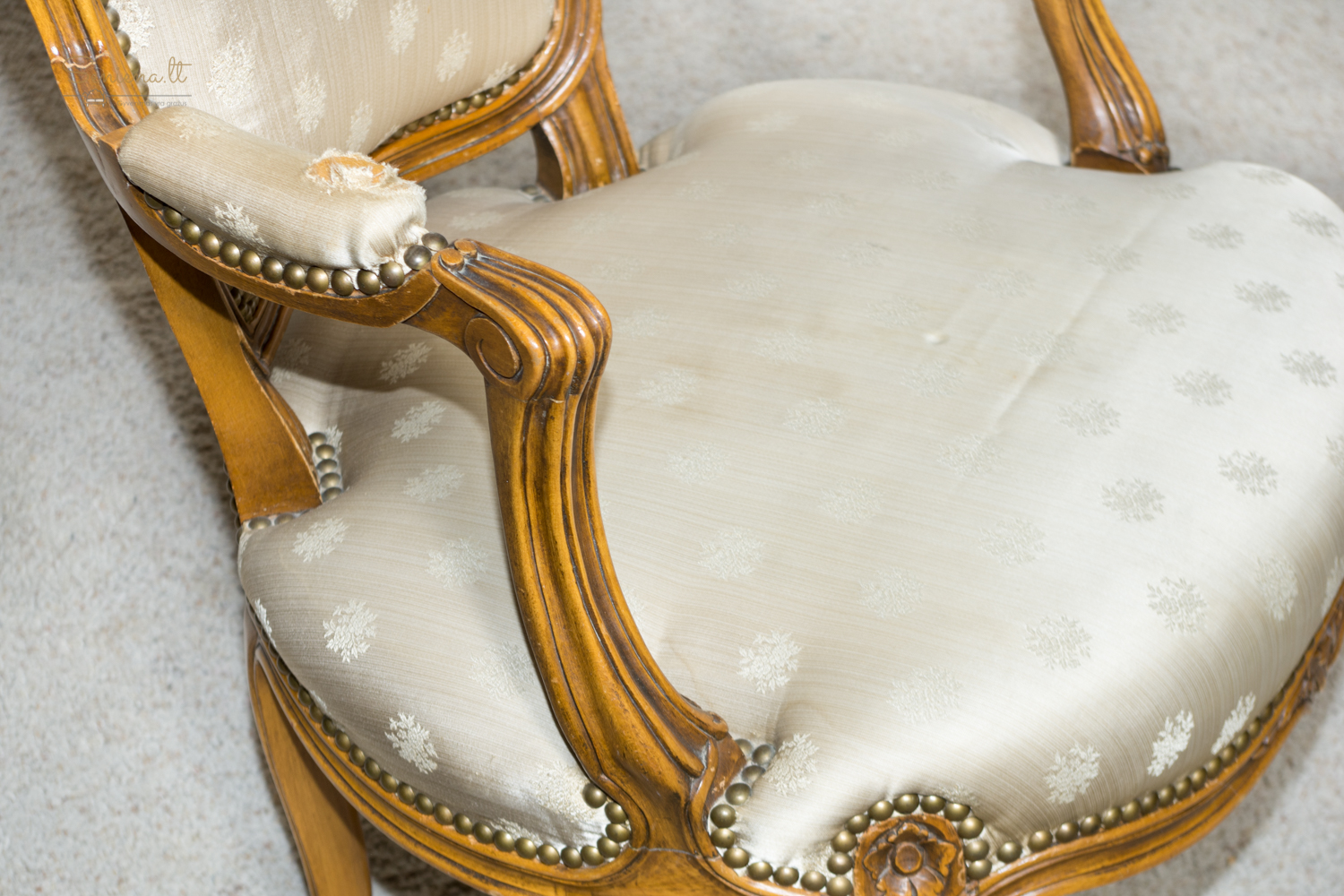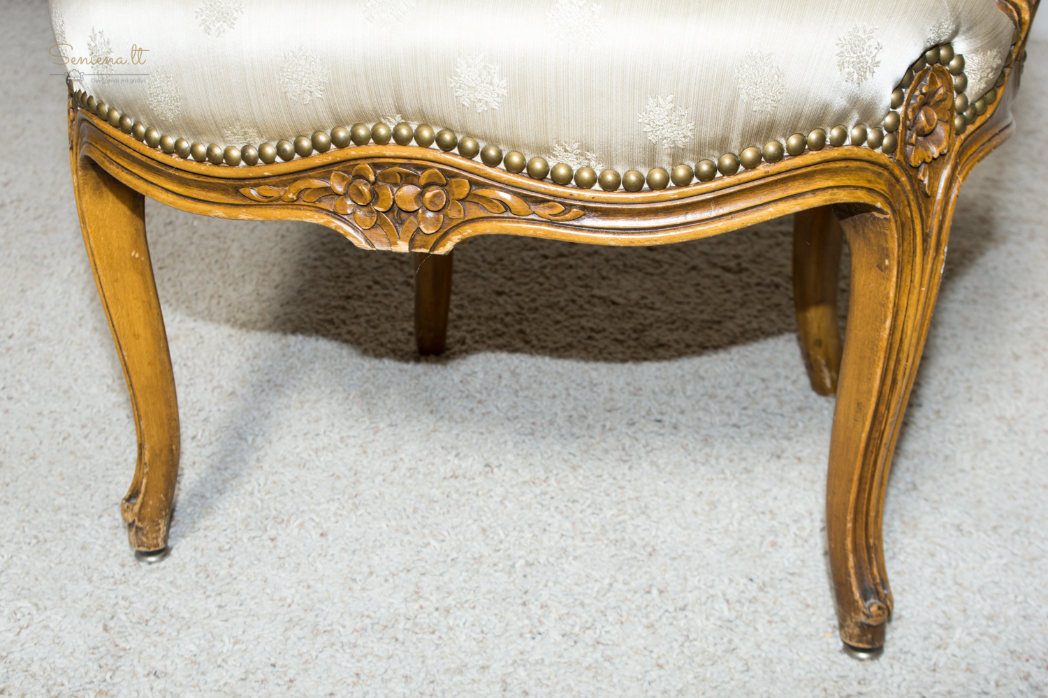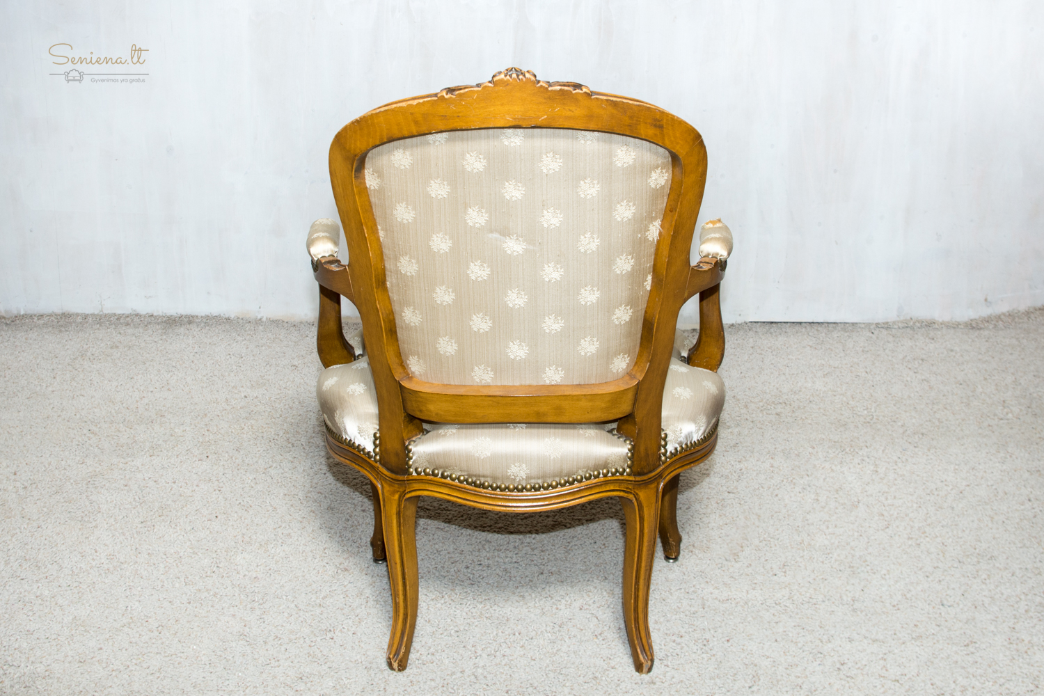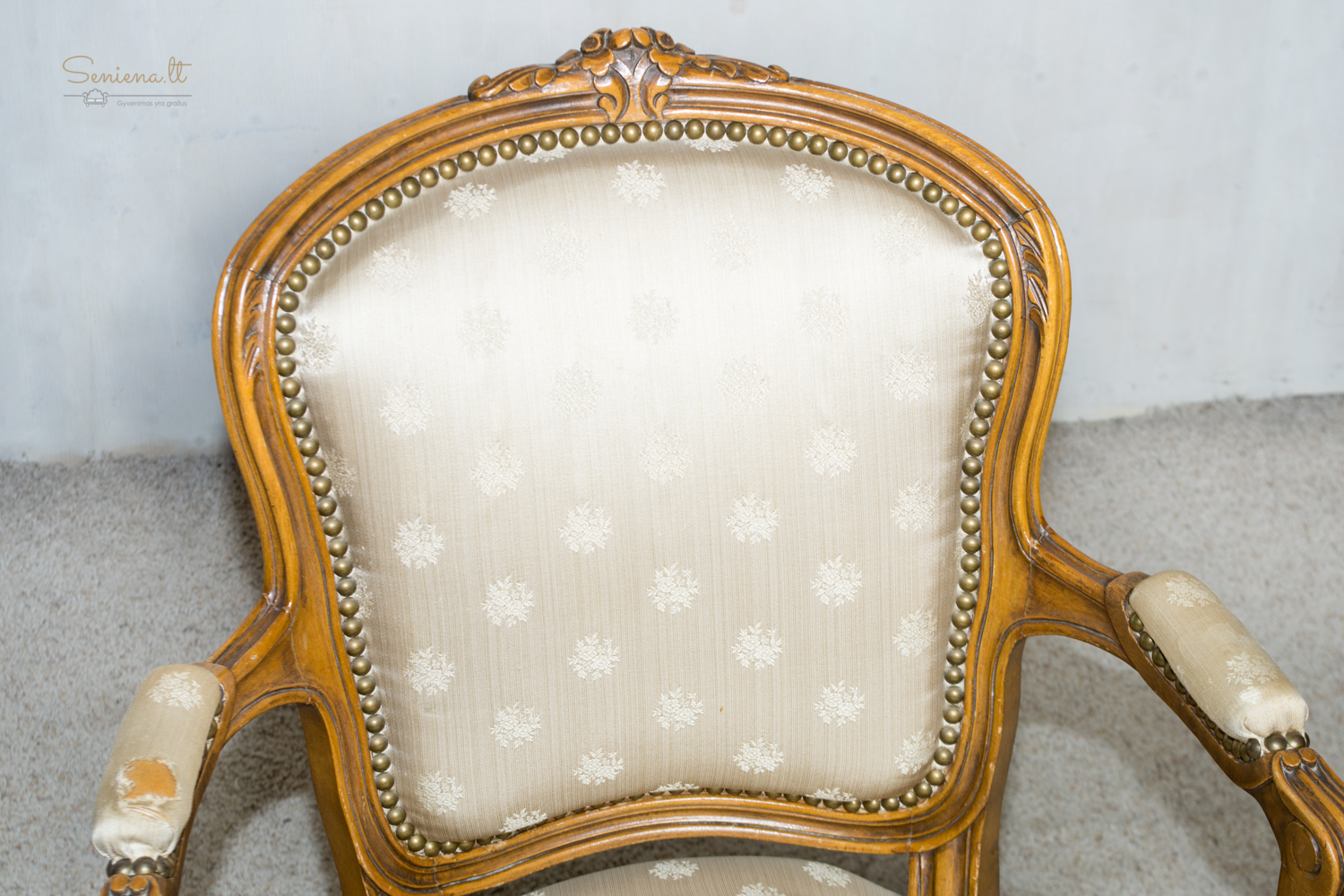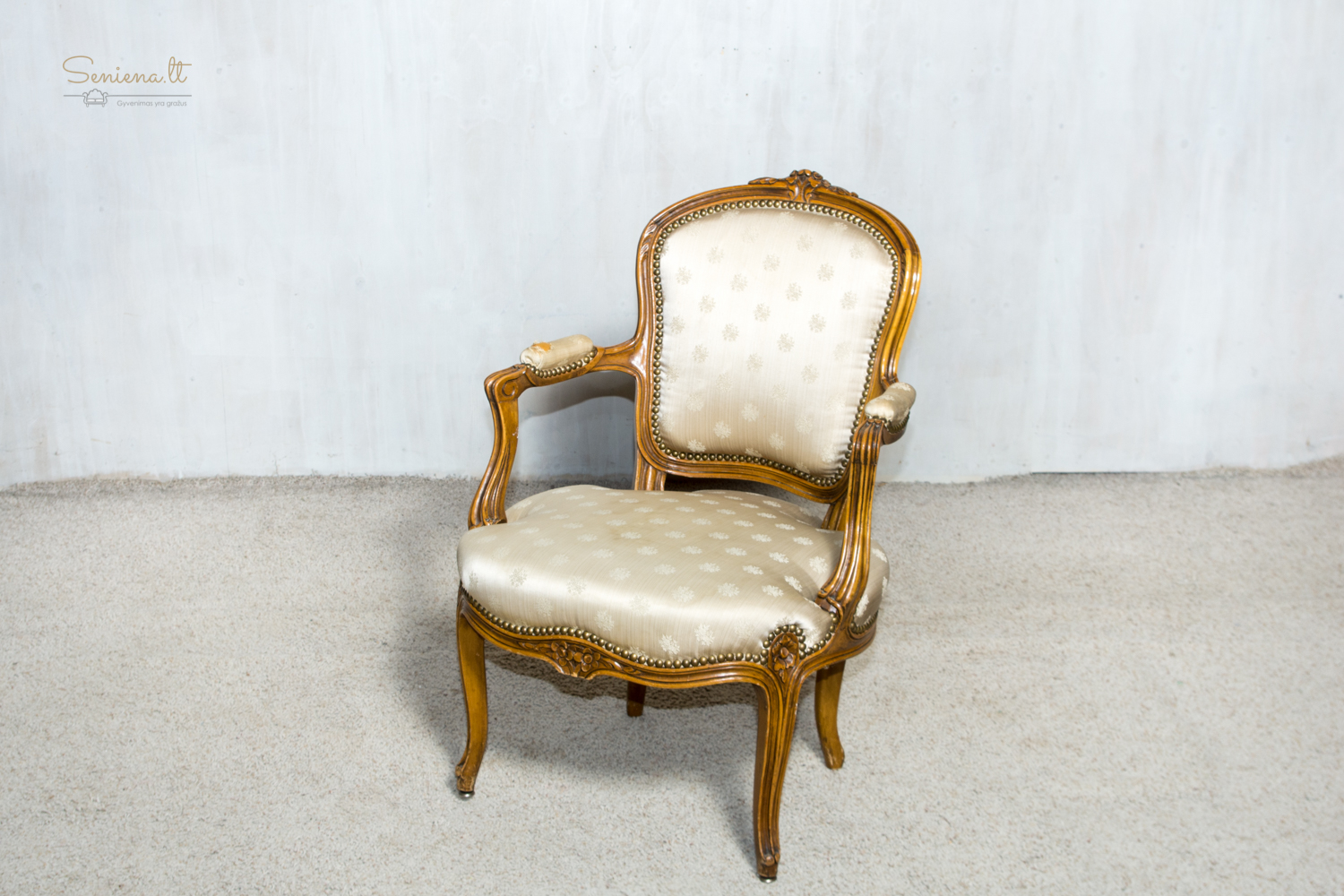 Prancūziškas Louis XV stiliaus krėslas, pagamintas apie XX a. vidurį. Tvirtas ir gražiai išsilaikęs riešutmedžio rėmas su išraižytais gėlių motyvais ir švelnia laiko patina. Audinys šviesus, klasikinio rašto, tačiau matomi nusidėvėjimai – rekomenduojama pertraukti.
