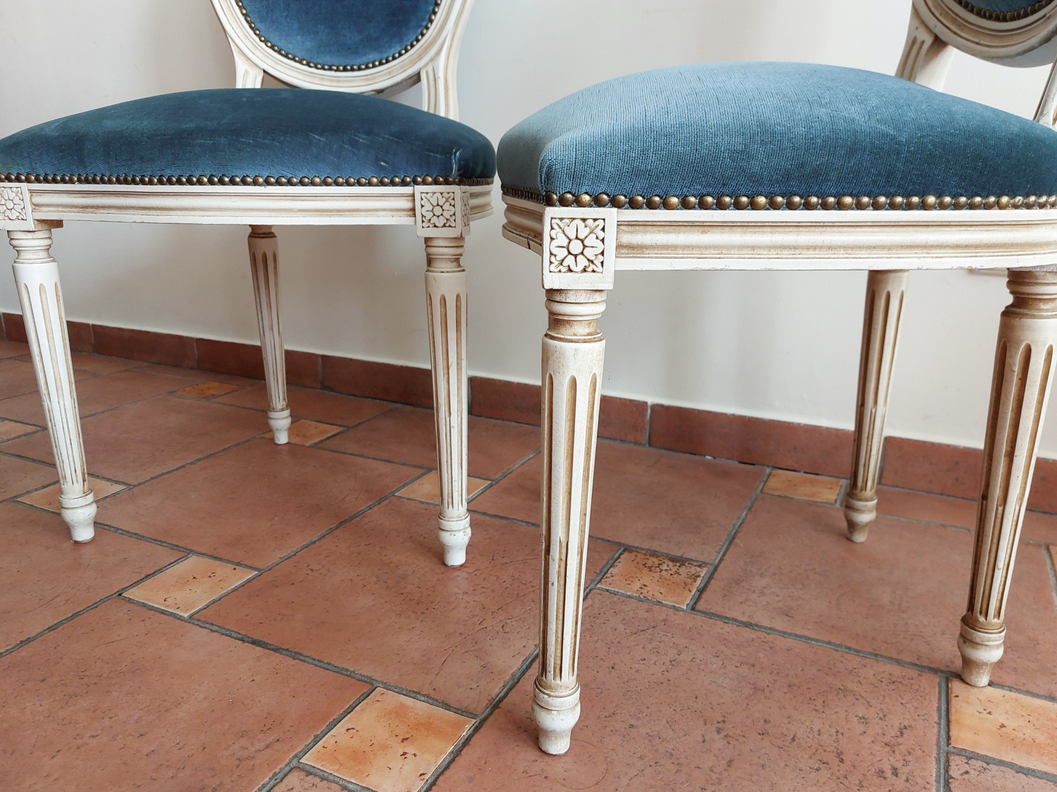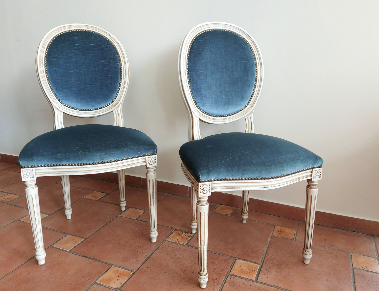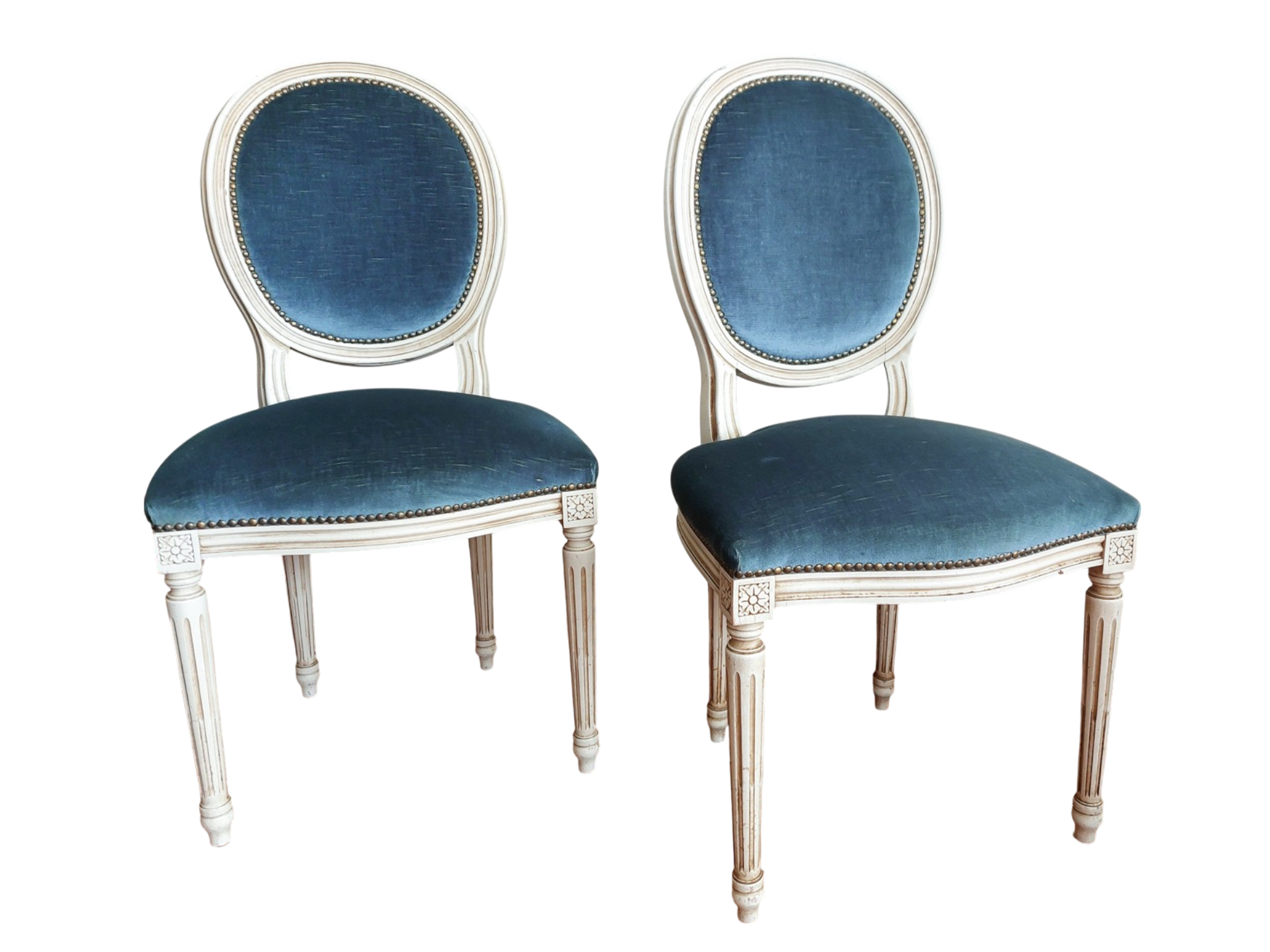 Dvi Louis XVI stiliaus kėdės su mėlynu veliūru, balintu rėmu ir raižytomis detalėmis. Tvirtos, patogios, su laiko ženklais. Parvežta iš Prancūzijos