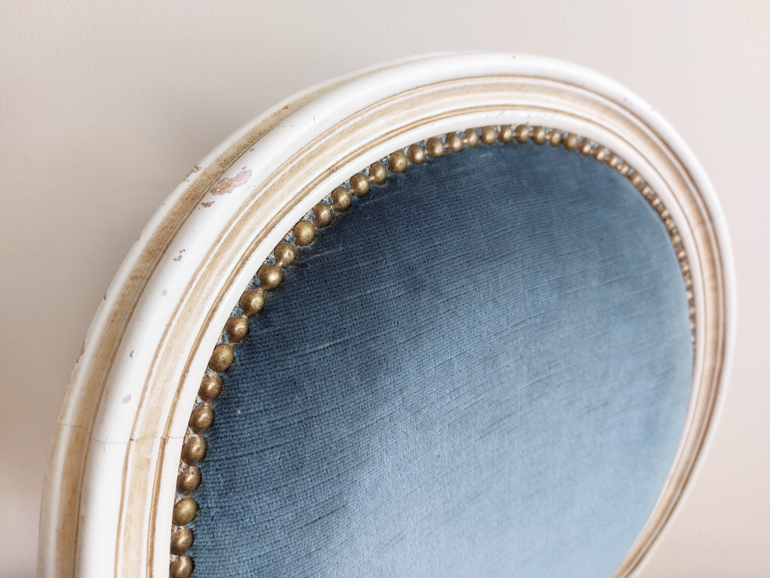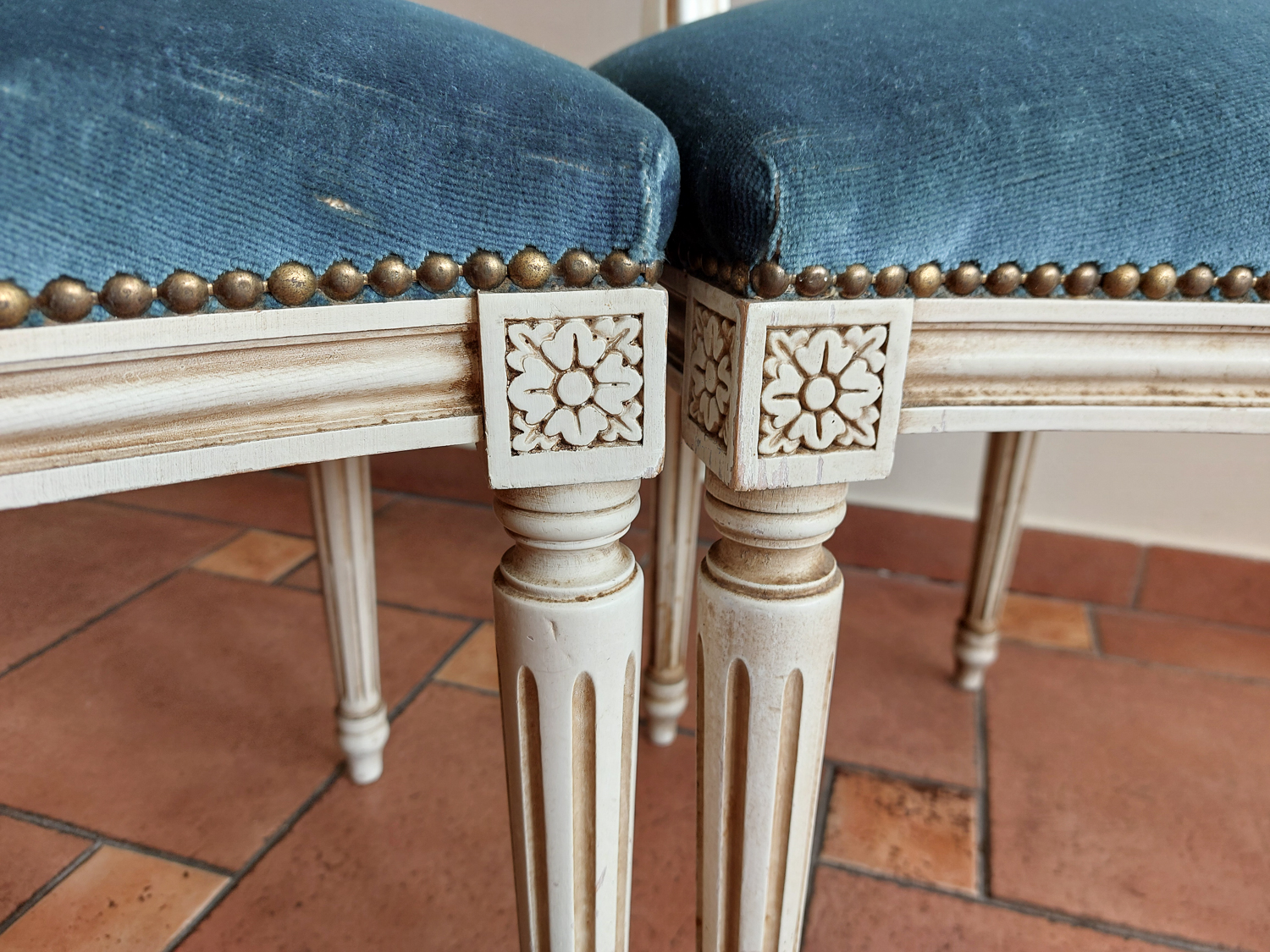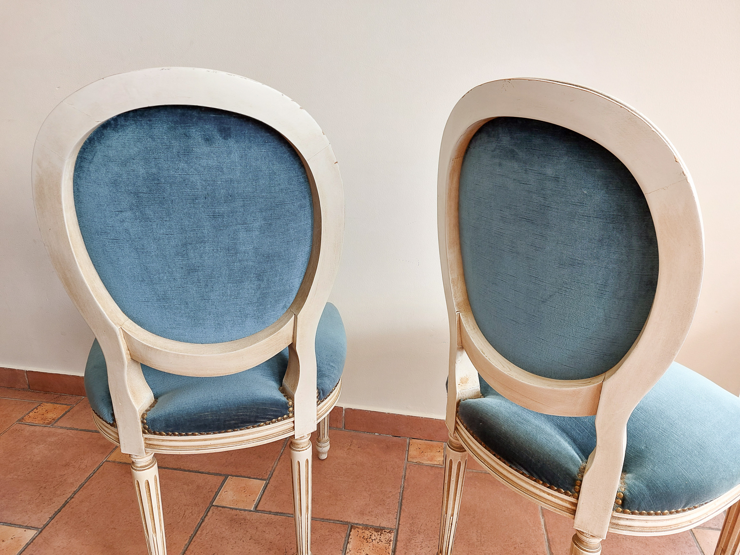 Dvi Louis XVI stiliaus kėdės su mėlynu veliūru, balintu rėmu ir raižytomis detalėmis. Tvirtos, patogios, su laiko ženklais. Parvežta iš Prancūzijos