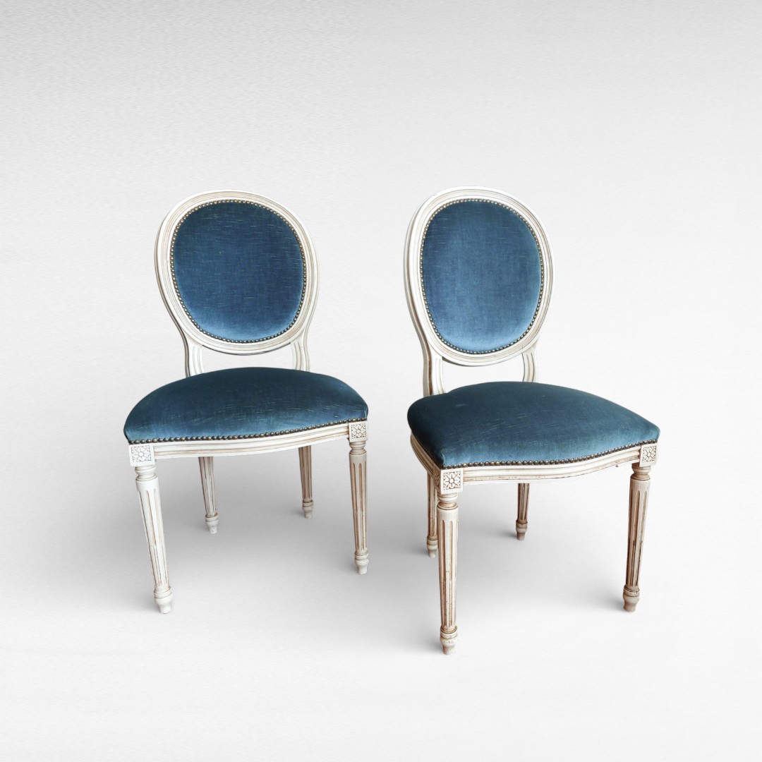 Dvi Louis XVI stiliaus kėdės su mėlynu veliūru, balintu rėmu ir raižytomis detalėmis.