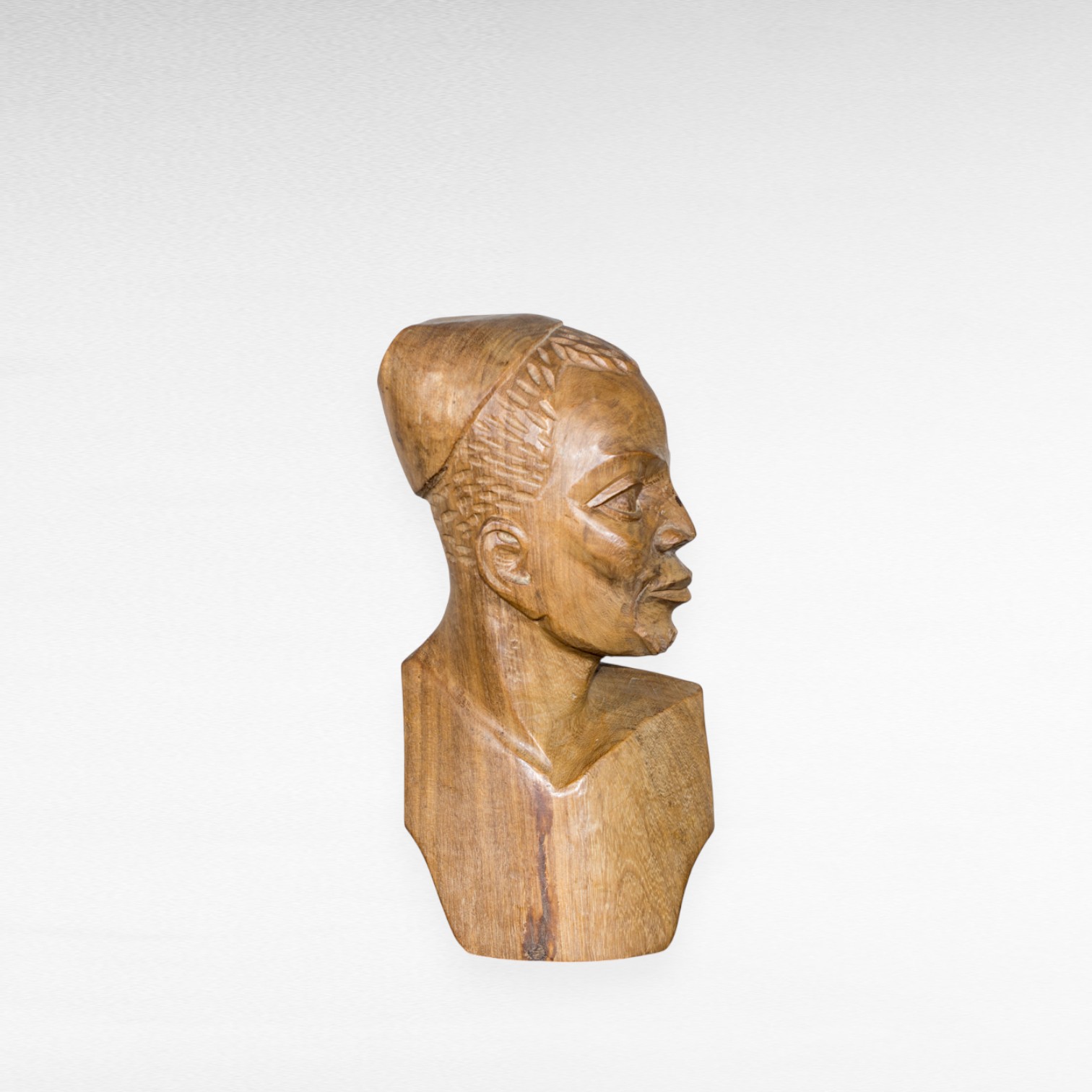 Rankų darbo medinė afrikietiška skulptūra - vyro biustas iš kietmedžio, išlaikęs natūralų medžio raštą. Skulptūra išsiskiria išraiškingais veido bruožais ir kruopščiai išskaptuotomis detalėmis – plaukais, barzda ir proporcijomis, atspindinčiomis meistrišką darbą.