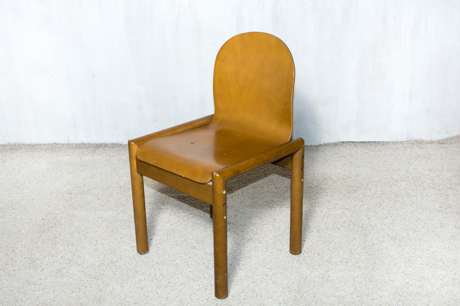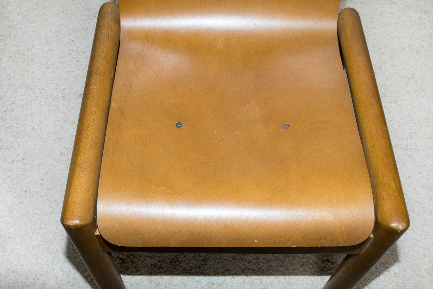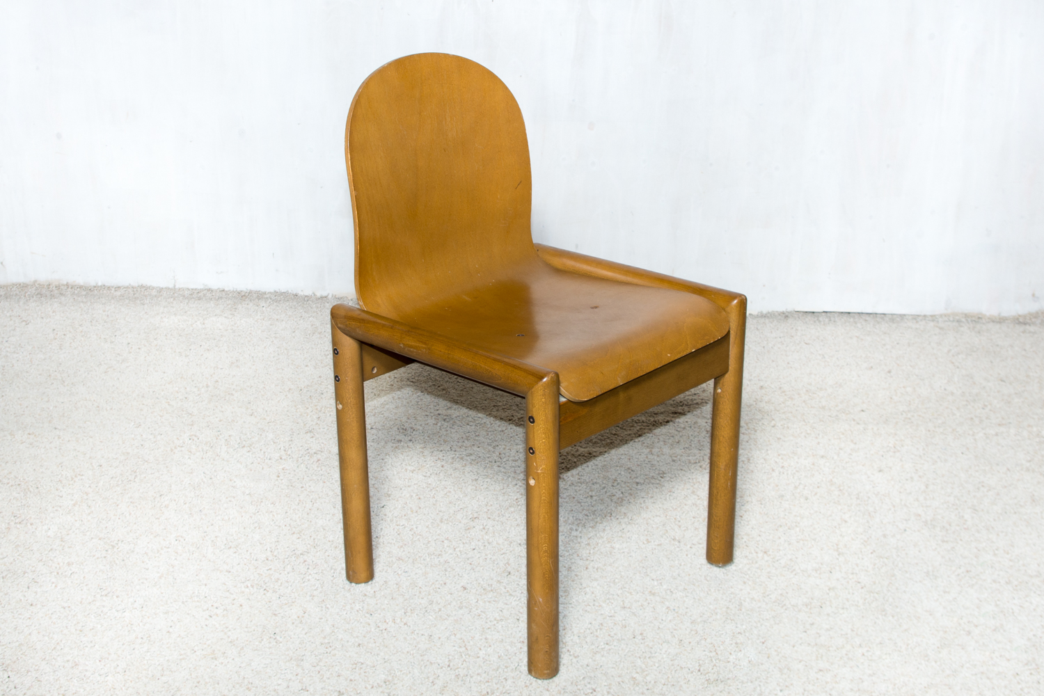 Medinė modernistinė kėdė iš 1960–1980 m. laikotarpio su lenktos faneros sėdyne ir atlošu bei masyvaus medžio rėmu. Sėdynės aukštis reguliuojamas dviem lygiais. Parvežta iš Prancūzijos