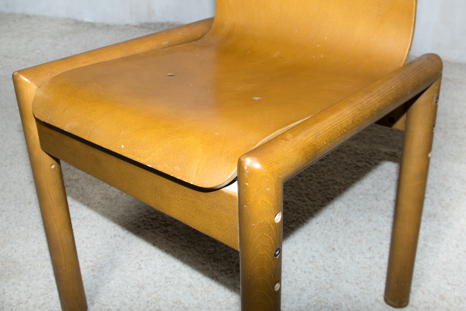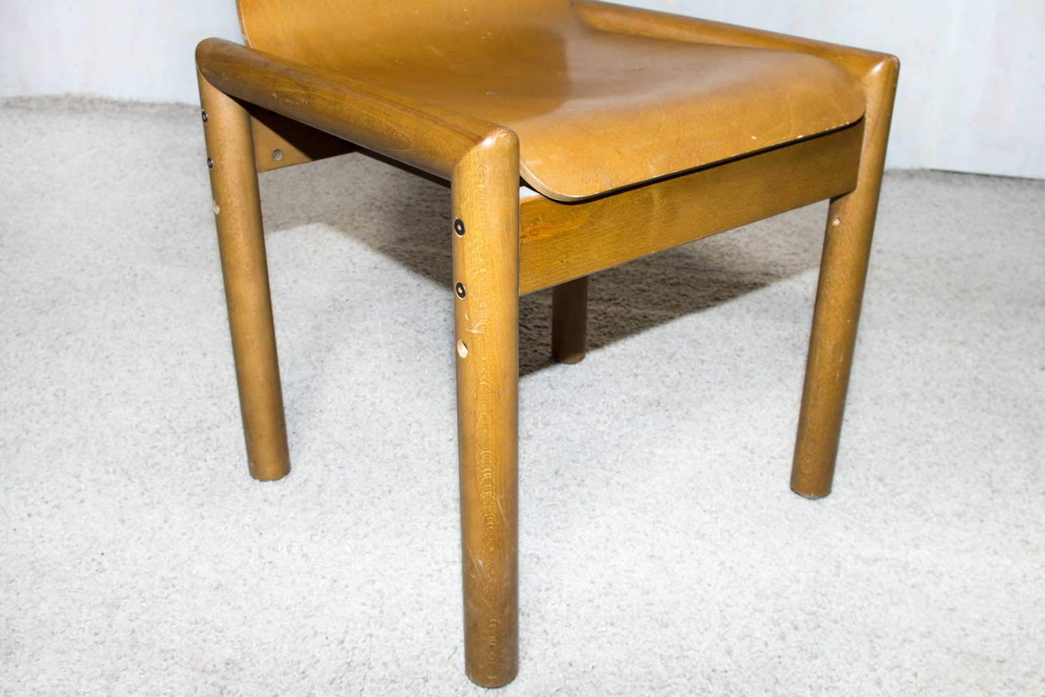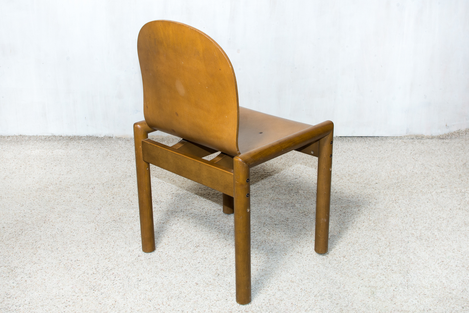 Medinė modernistinė kėdė iš 1960–1980 m. laikotarpio su lenktos faneros sėdyne ir atlošu bei masyvaus medžio rėmu. Sėdynės aukštis reguliuojamas dviem lygiais. Parvežta iš Prancūzijos