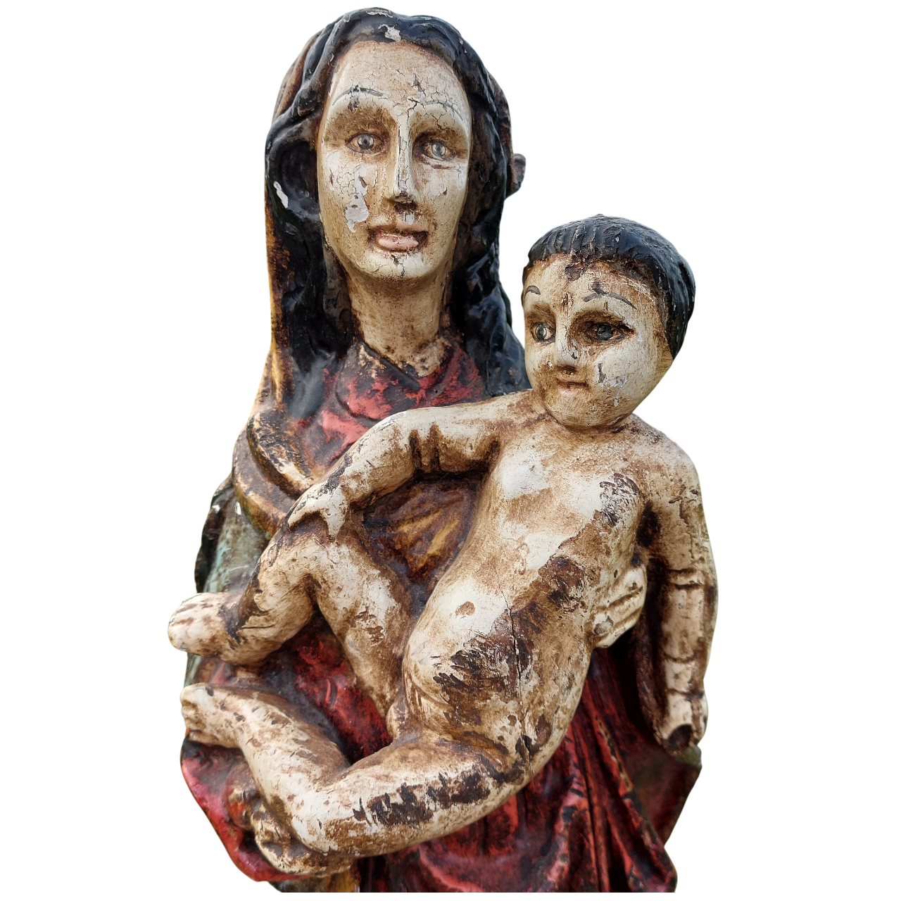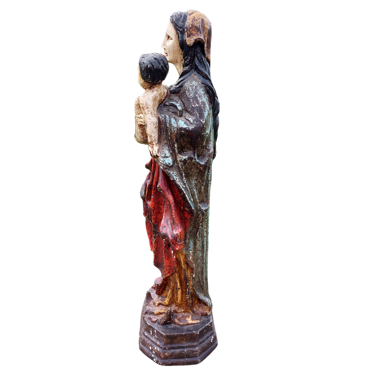Medinė skulptūra Madona su Kūdikiu. Drožta rankomis ir polichromiškai dažyta. Laikas paliko savo žymes, spalvos kai kur nutrupėjusios, pagrinde matyti įtrūkimas. Būtent šie požymiai liudija jos amžių ir tikrumą. Apie 1900 m. Parvežta iš Prancūzijos